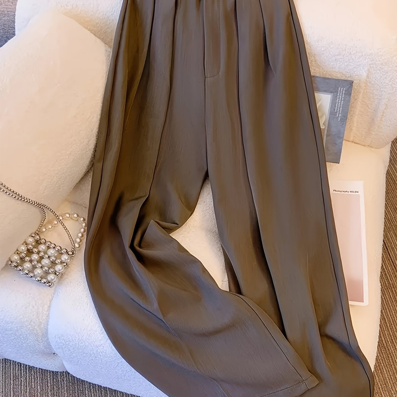 Ayollar uchun zamonaviy, yuqori belli keng oyoqli shimlar, fermuar yopilishi, bir xil rangda, polyesterdan tayyorlangan, mashinada yuvish mumkin. Har xil kiyish uchun zamonaviy qirqim dizayni mavjud.