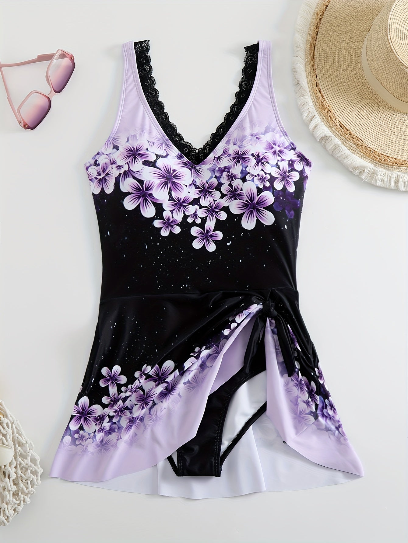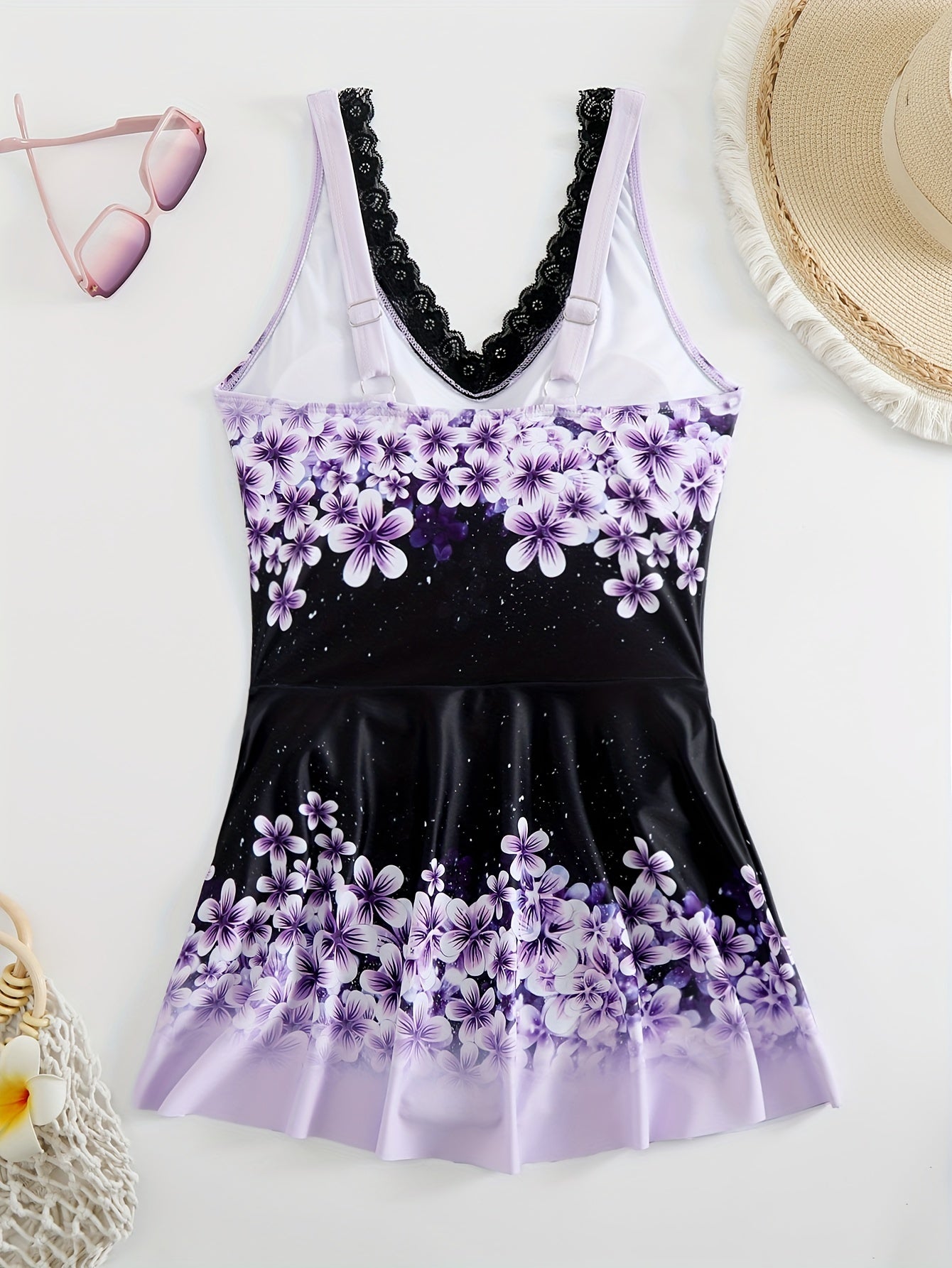 Gul naqshli, dantelli, va olib tashlanadigan yostiqli zamonaviy yelka ochiq suzish kiyimi. Yuqori cho'ziluvchan matodan tayyorlangan.