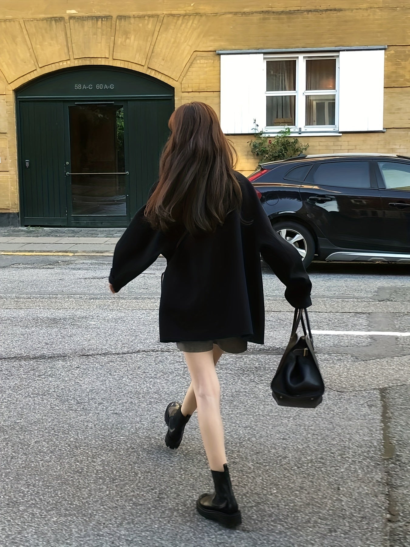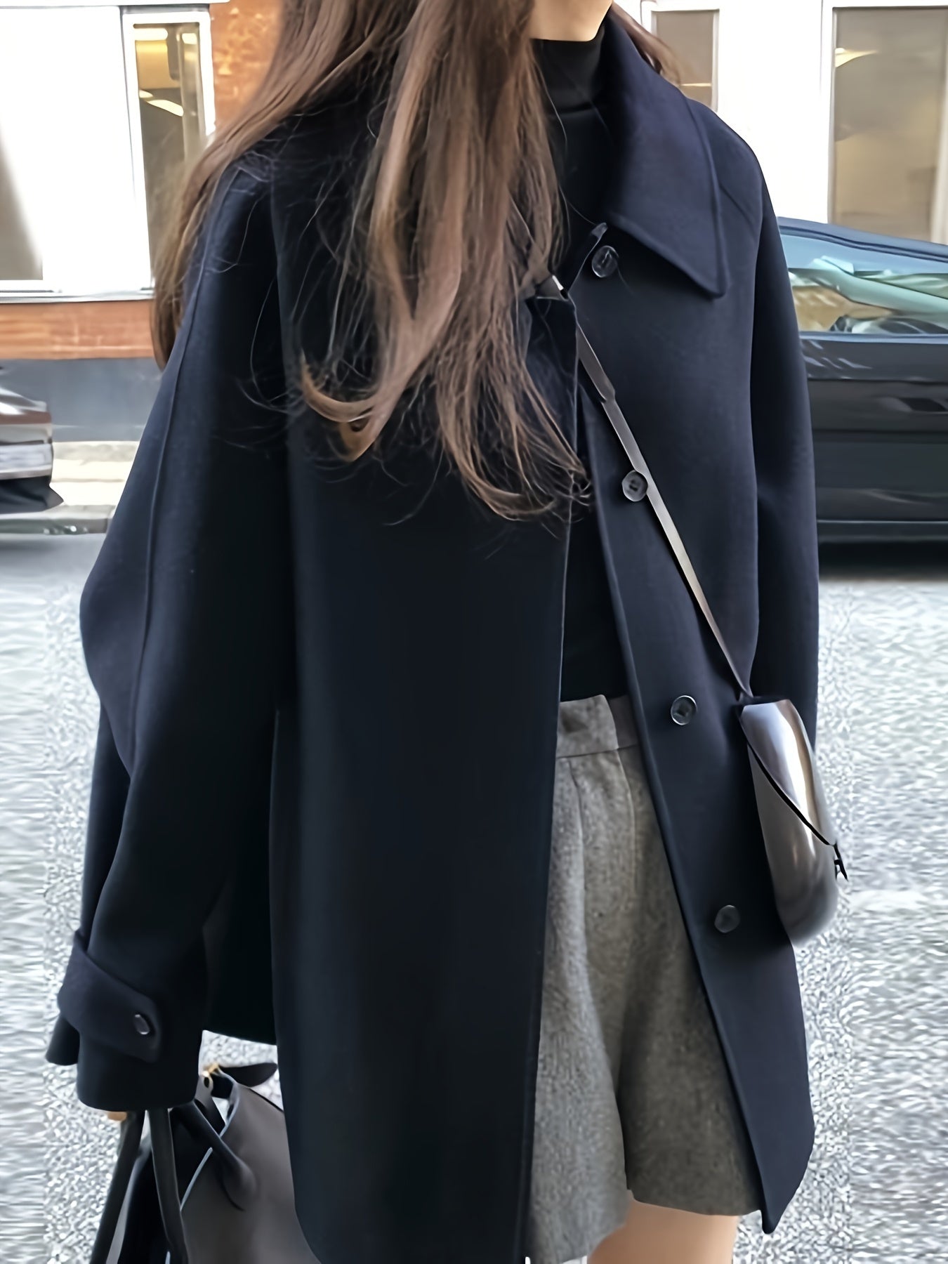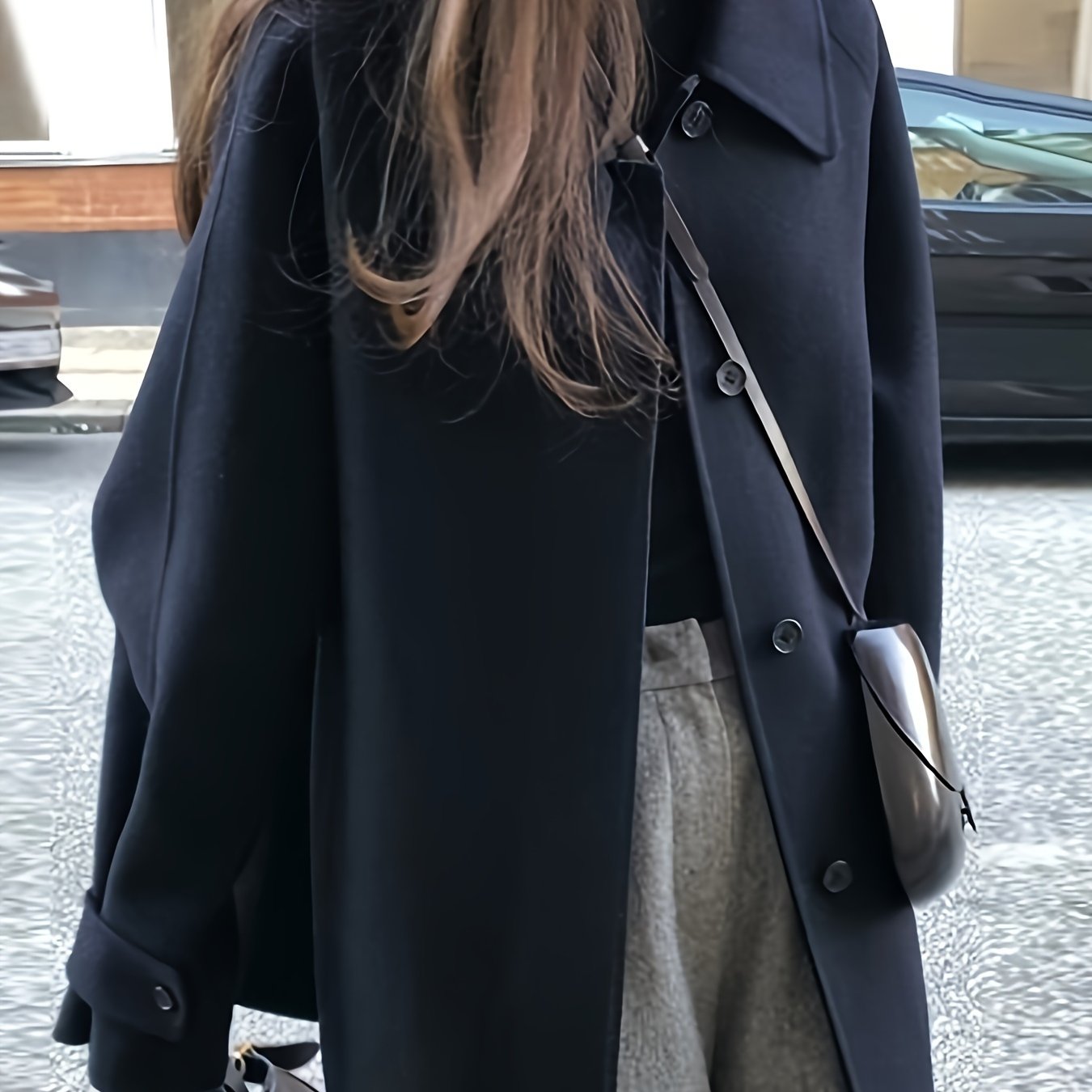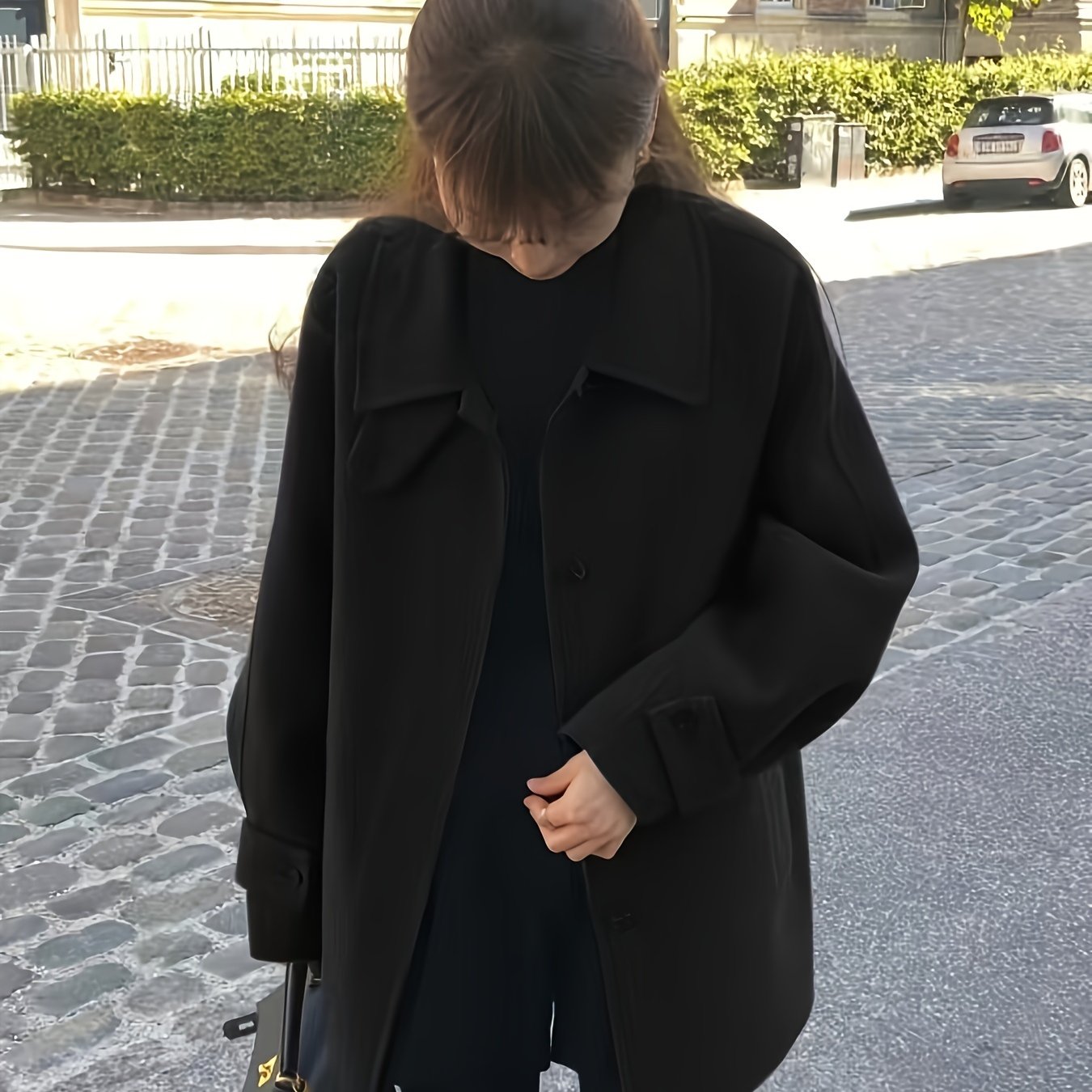 Zamonaviy kichik qora palto, retro yaka, bitta tugma, ko'rinmas cho'ntaklar - fransuz modasidan ilhomlangan tasodifiy, ammo nafis kuz/qish ko'rinishi uchun ideal.