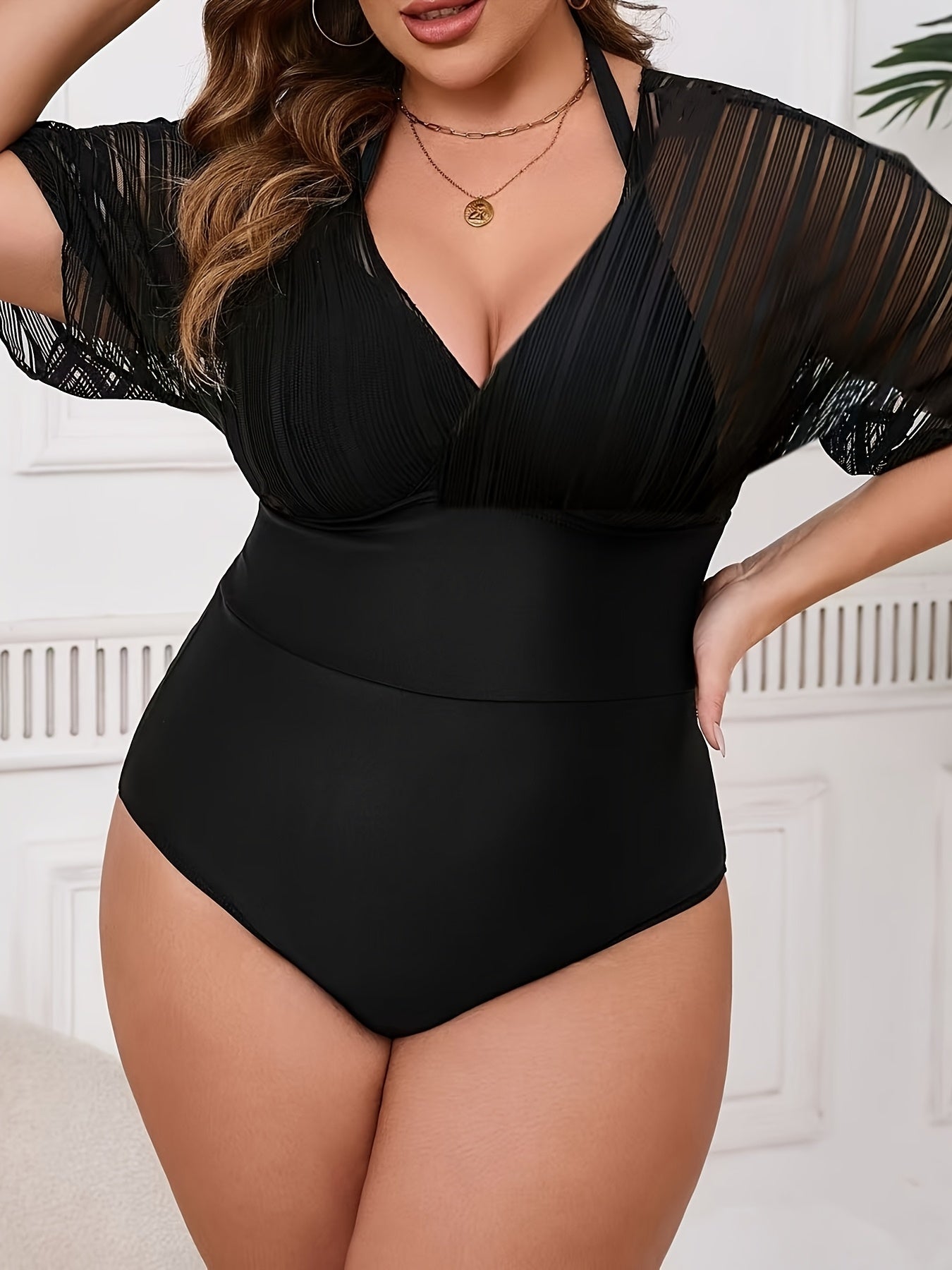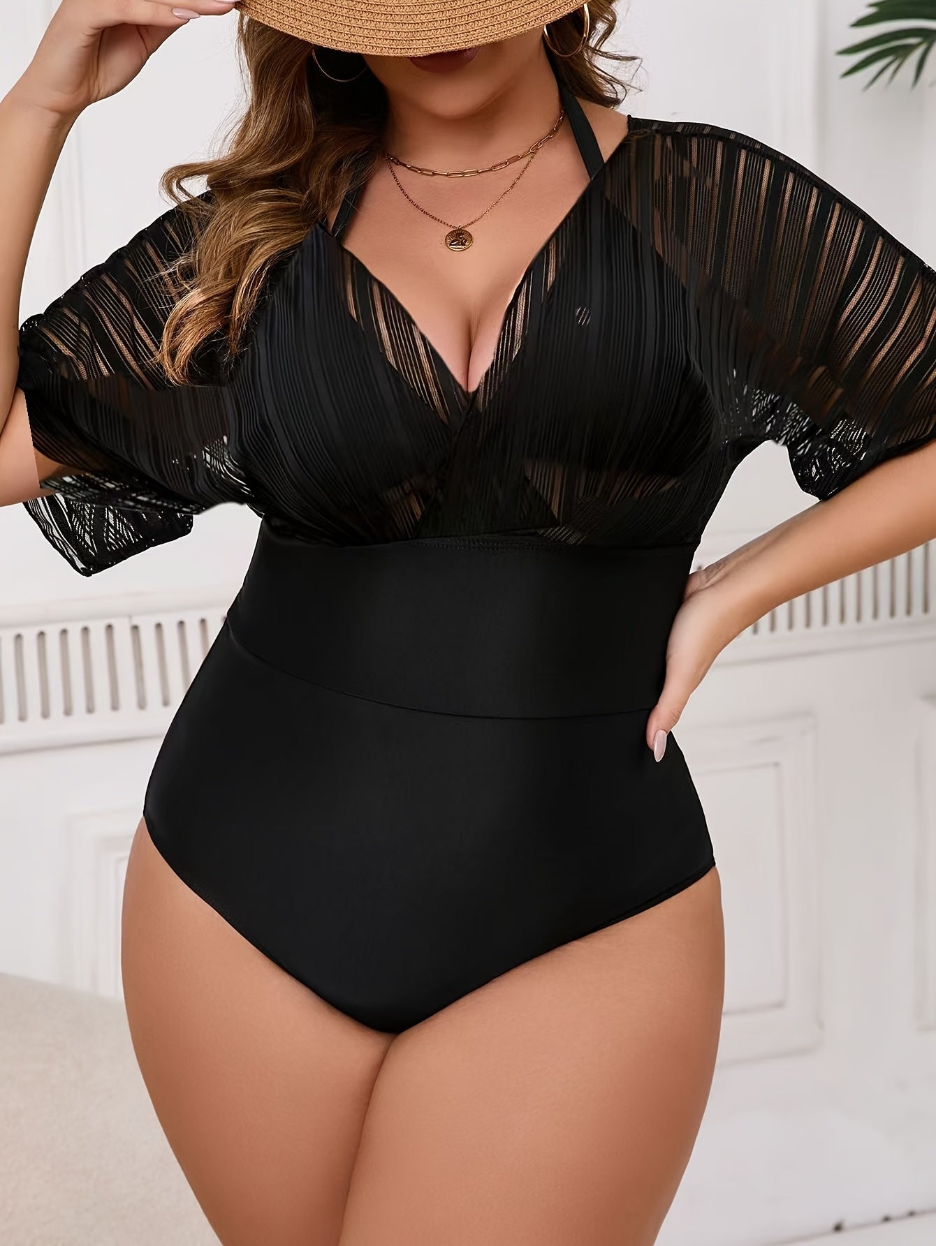 Zarif plussayz ayollar uchun bir qismli suzish kiyimi va mos keluvchi yopqich. V-yuz, yuqori cho'zilish, olib tashlanadigan yostiqlar, mashinada yuvish mumkin.