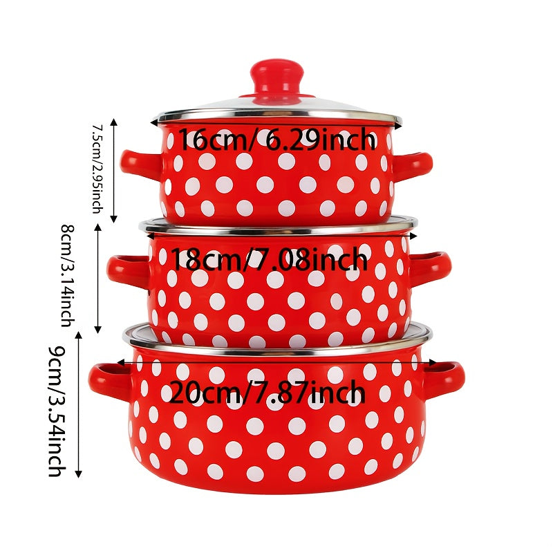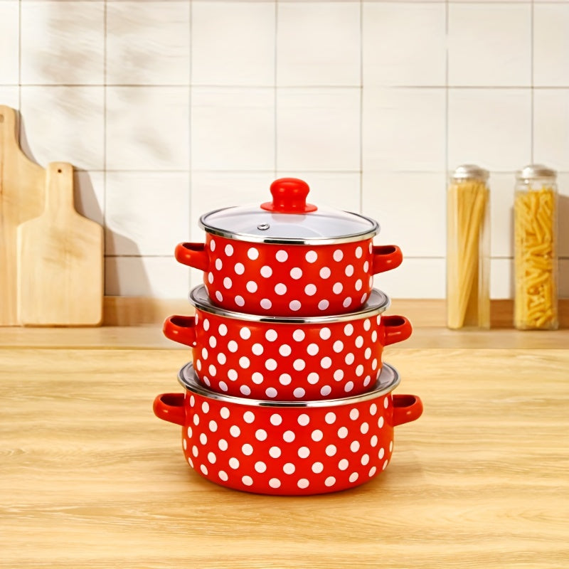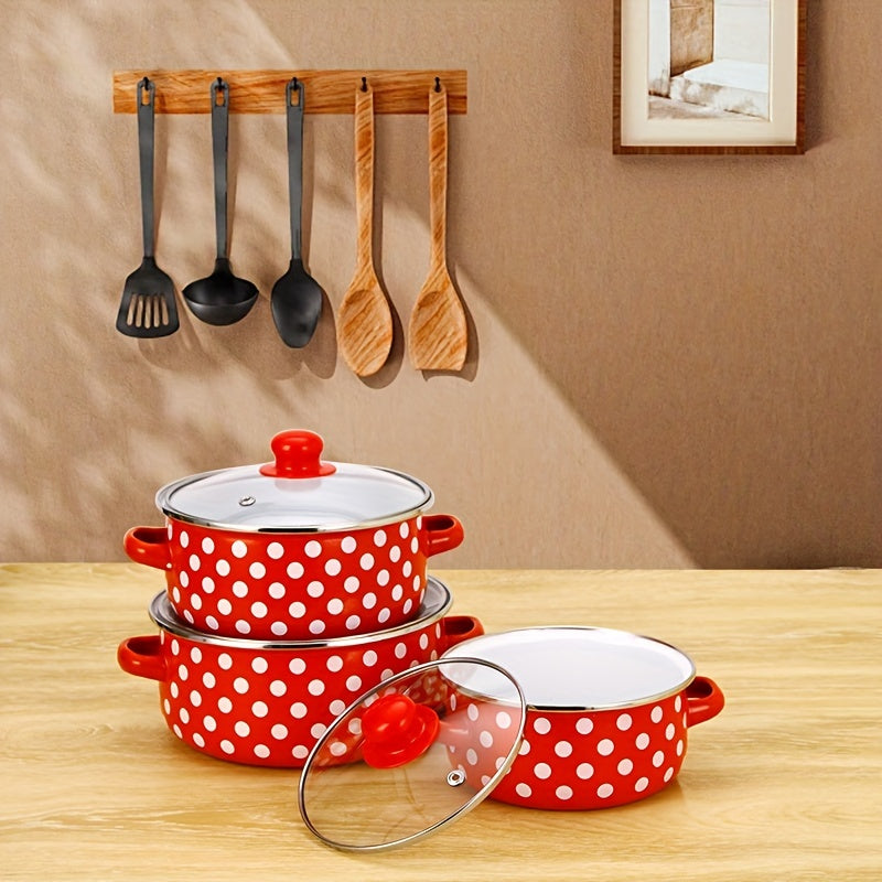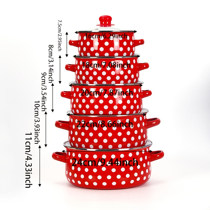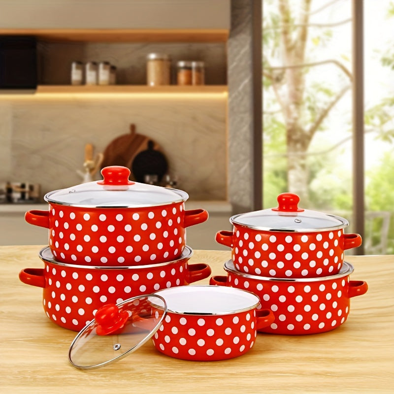 Qizil va oq emal idishlar to'plami, polka nuqtalari dizayni bilan - oshpazlik va ovqatlanish joyi uchun ideal