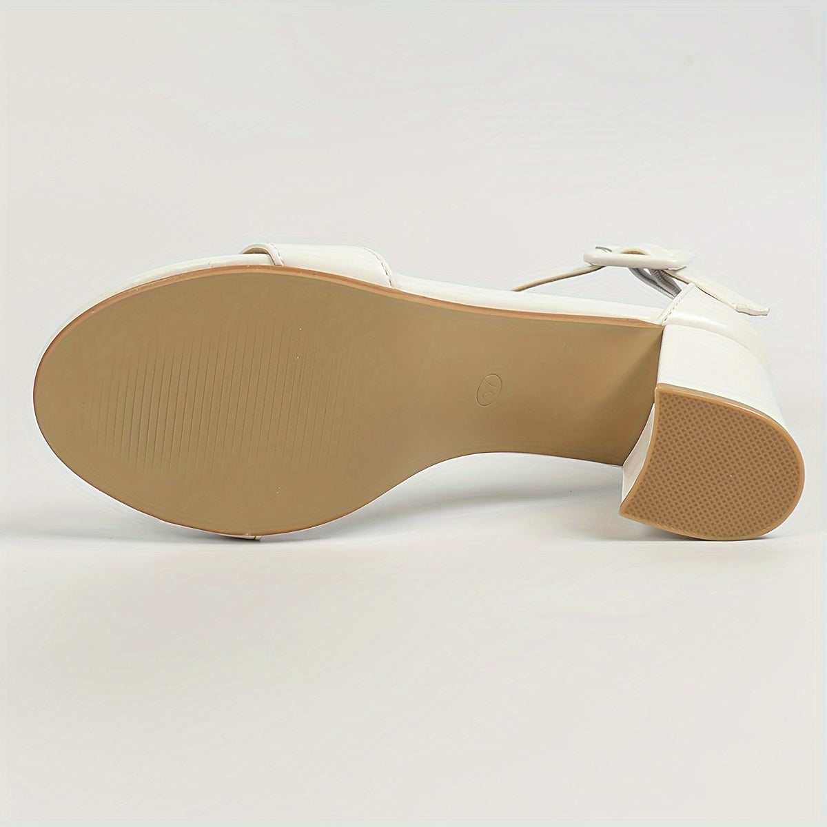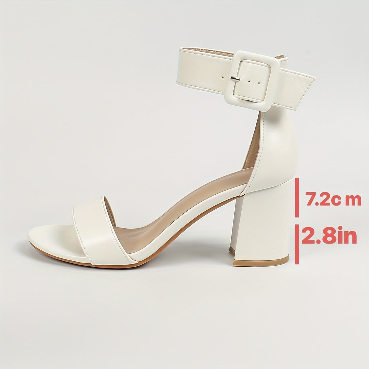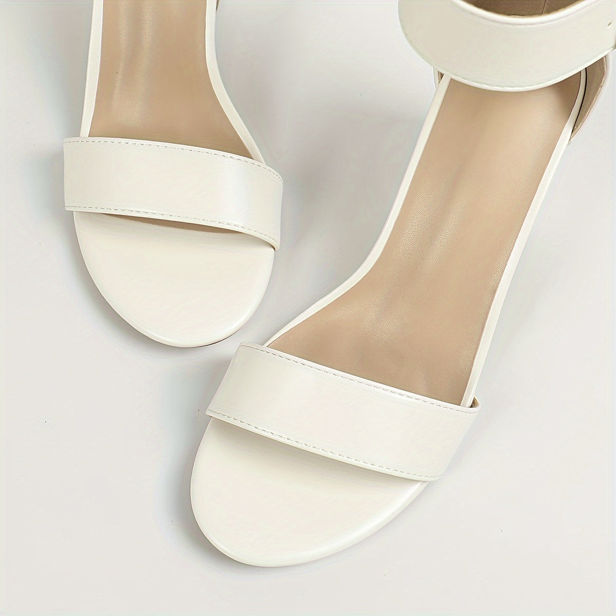 Qulupnay oyoq bilagida tasma va ochiq barmoq bilan zamonaviy oq blok tovonli sandlelar, har qanday holat uchun mos va qulay.