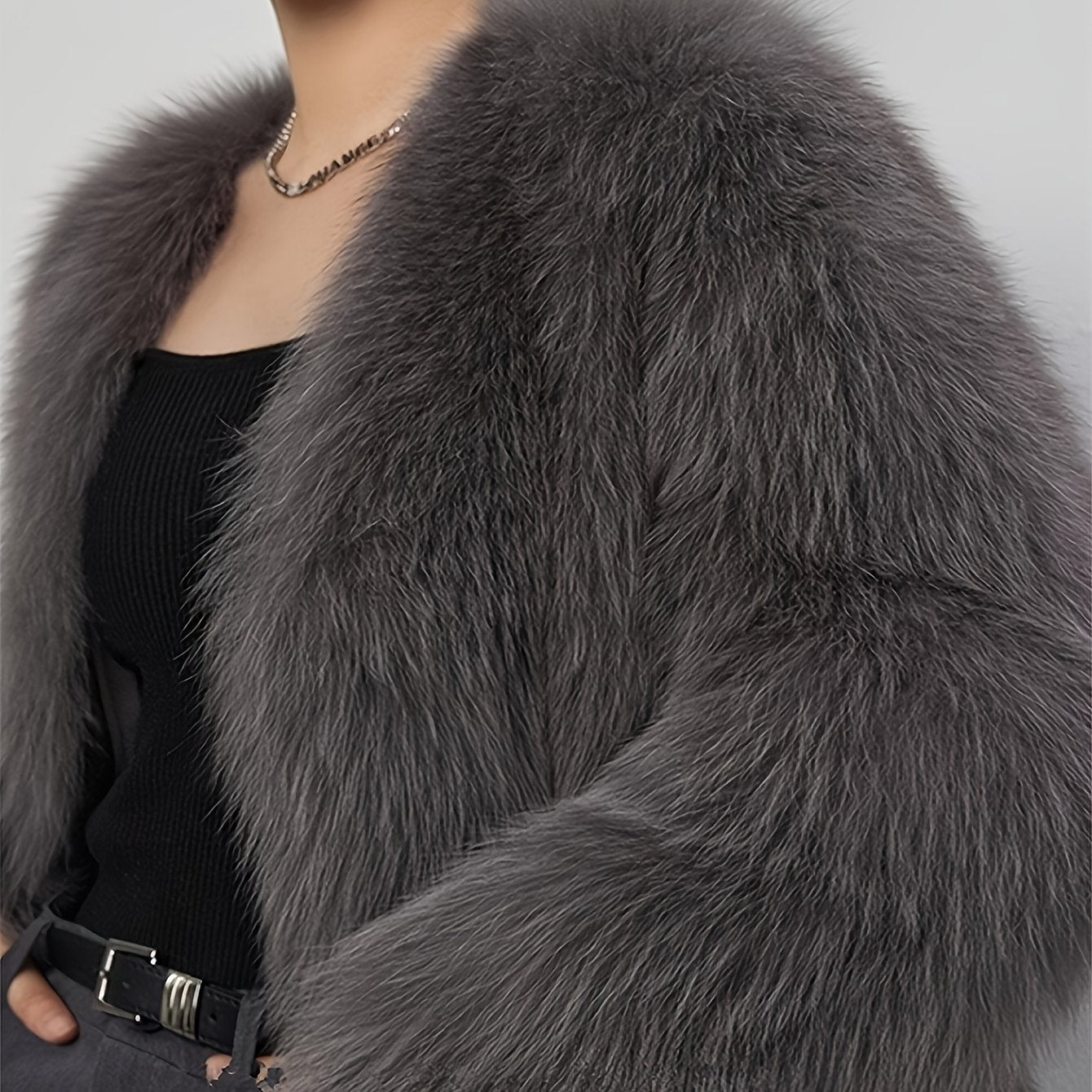 Yengil kulrang sun'iy mo'yna bilan zamonaviy ayollar jaketi, uzun yengli, kuz va qish uchun mukammal. Yumshoq polyesterdan tayyorlangan, to'qimachilik mato tafsilotlari bilan.