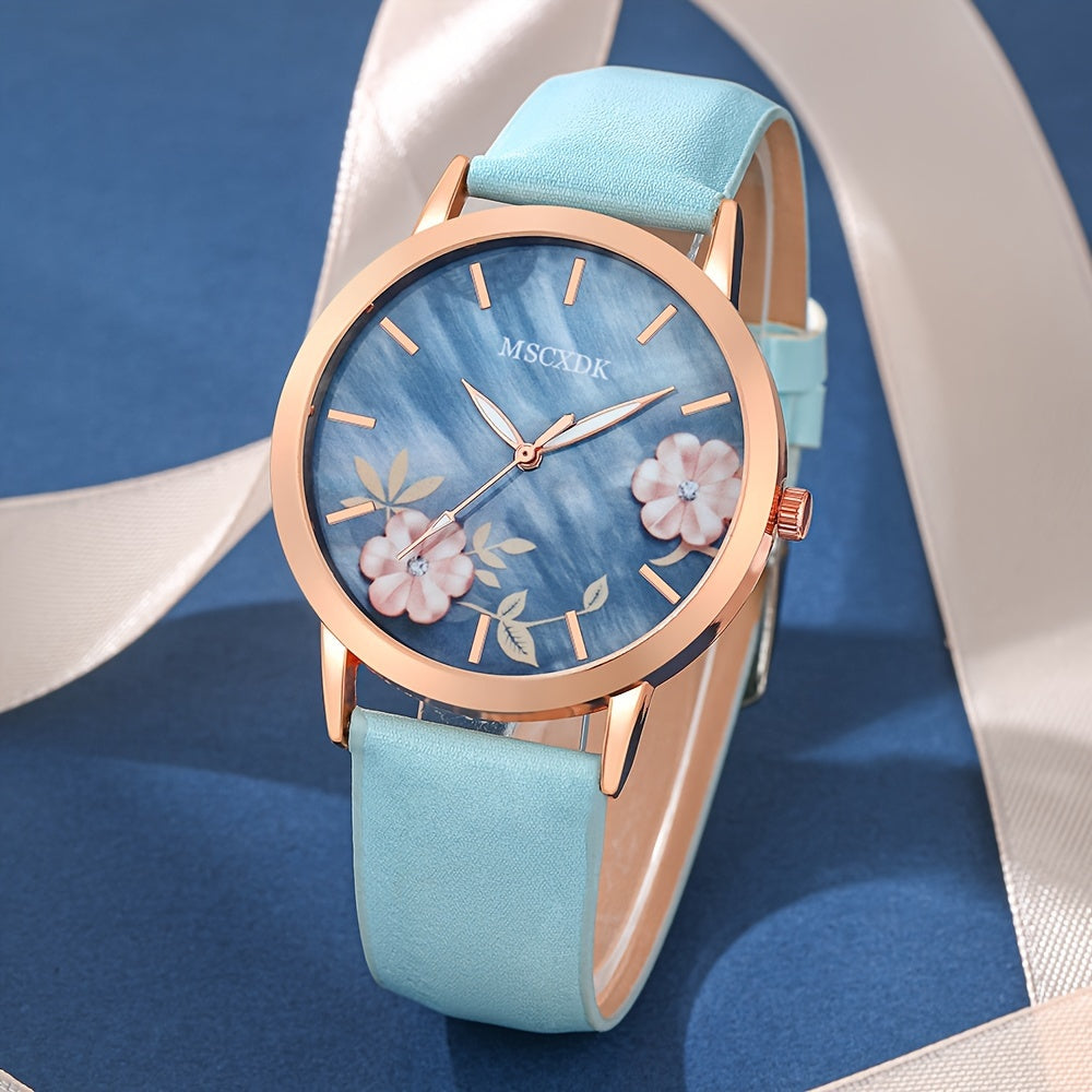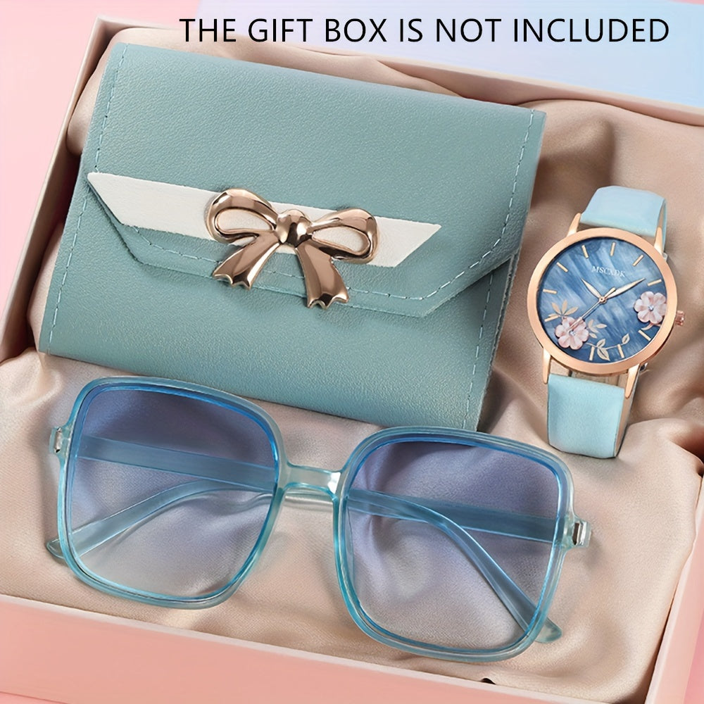 Ayollar uchun kvarts soat va moda ko‘zoynaklar to‘plami, bukletli hamyon va sun’iy charm bilan ta’minlangan strap