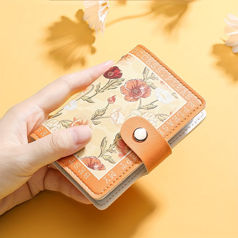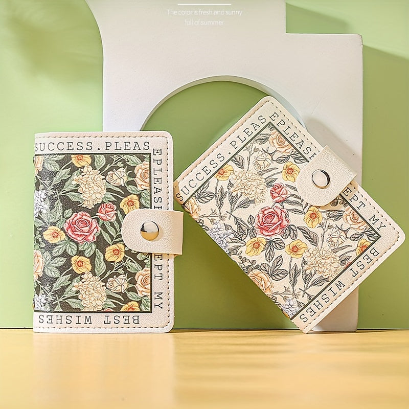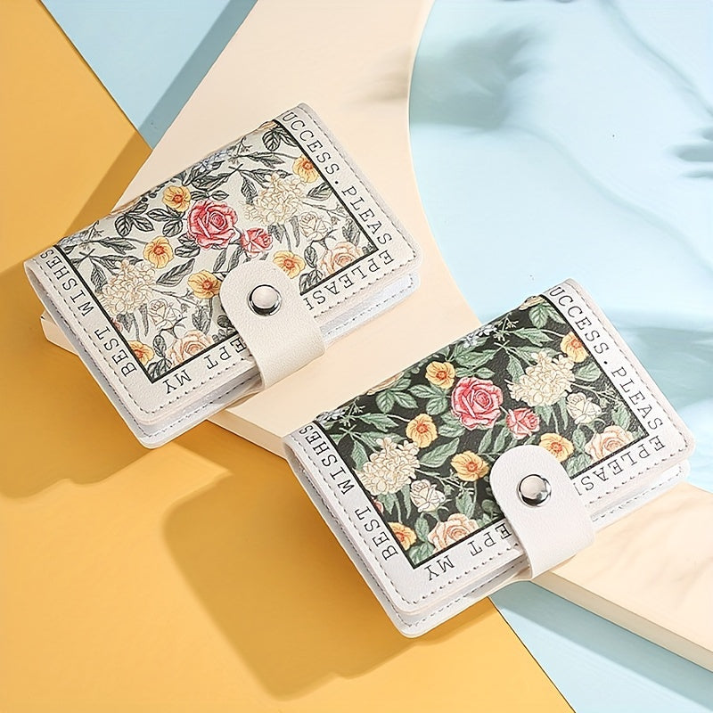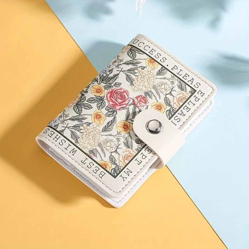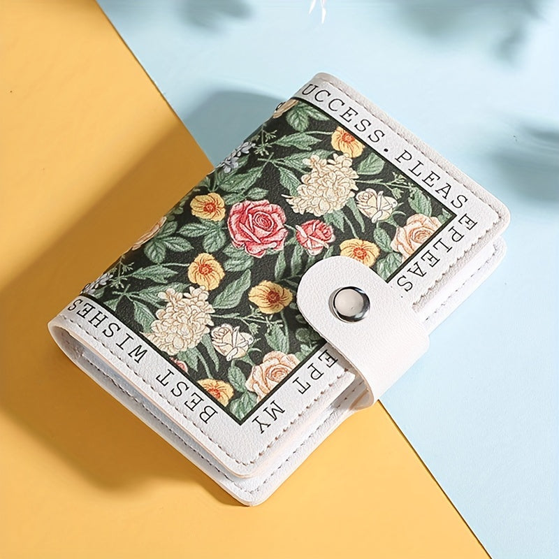 Sintetik charmli ayollar uchun hamyon, bir nechta karta joylari, tugmachali yopilish va yorqin atirgul dizayni bilan.