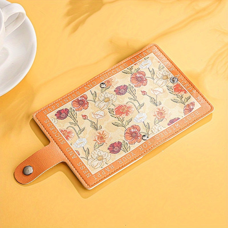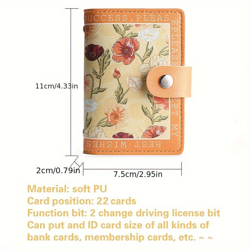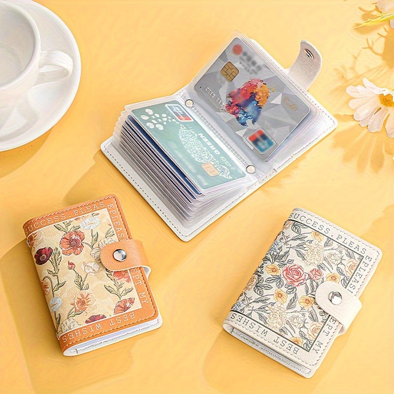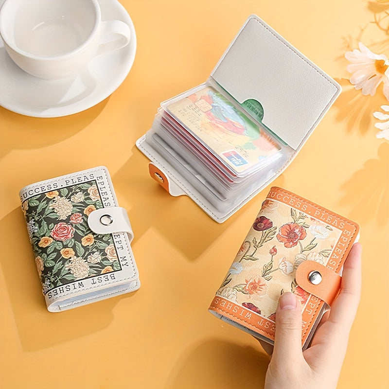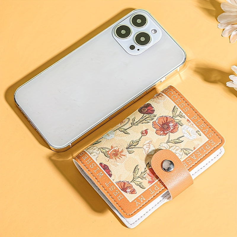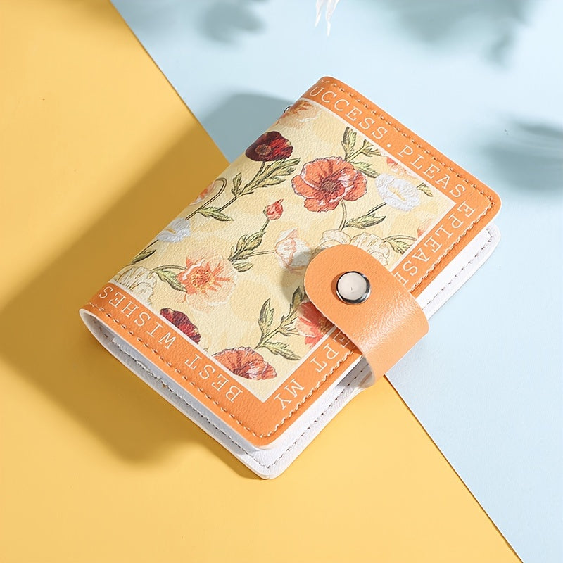Sintetik charmli ayollar uchun hamyon, bir nechta karta joylari, tugmachali yopilish va yorqin atirgul dizayni bilan.