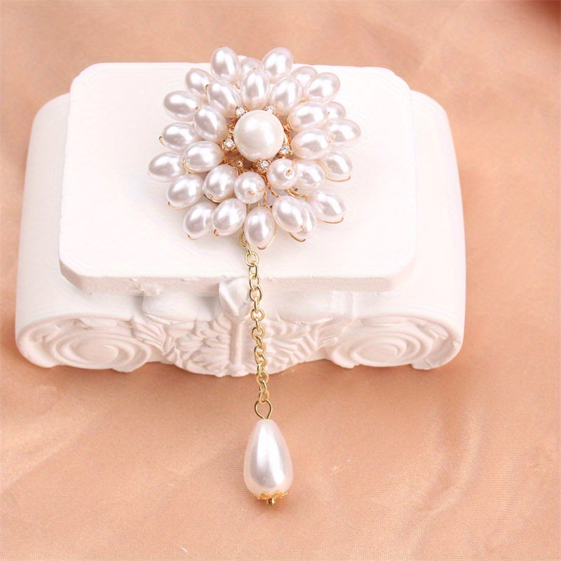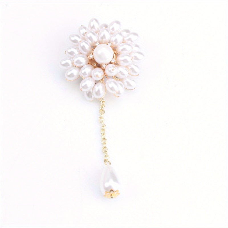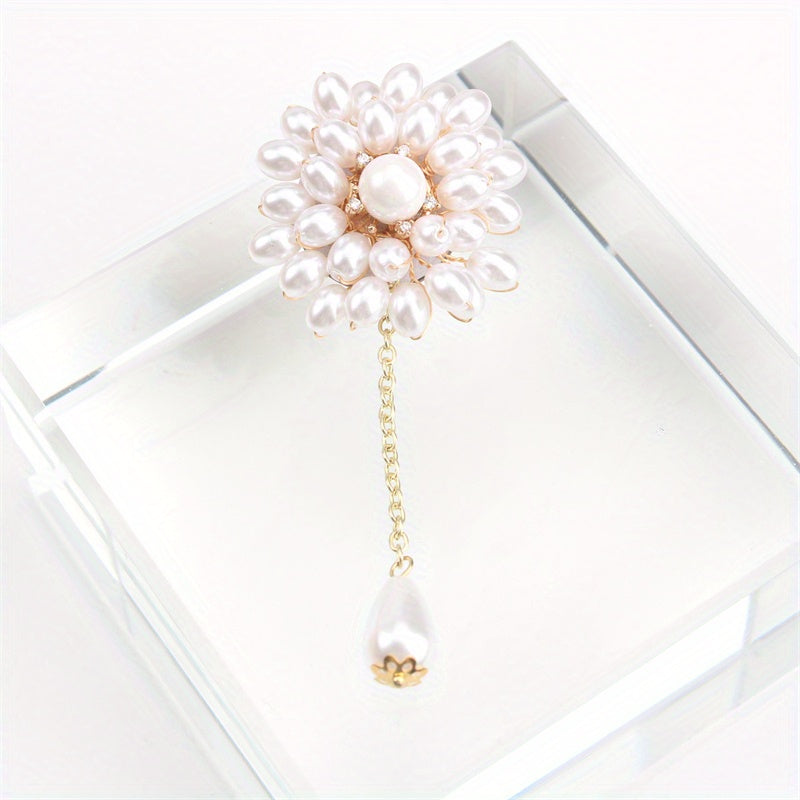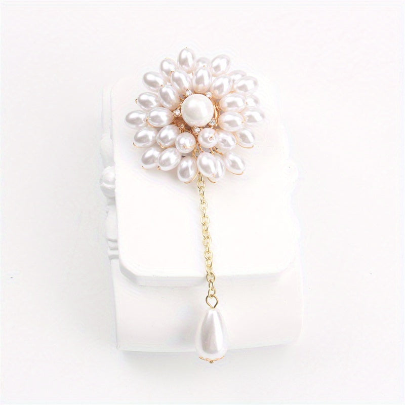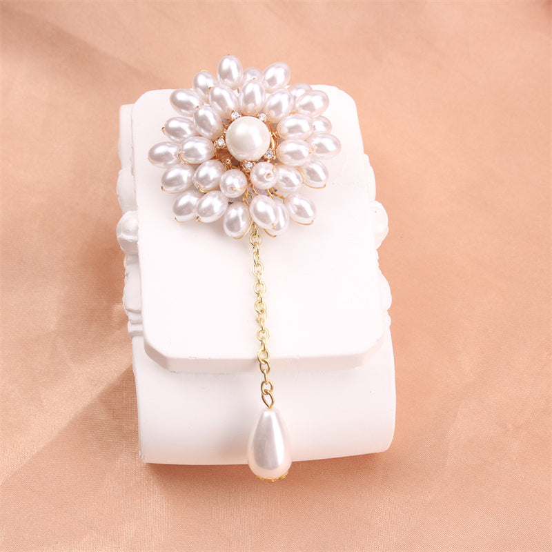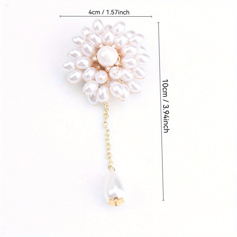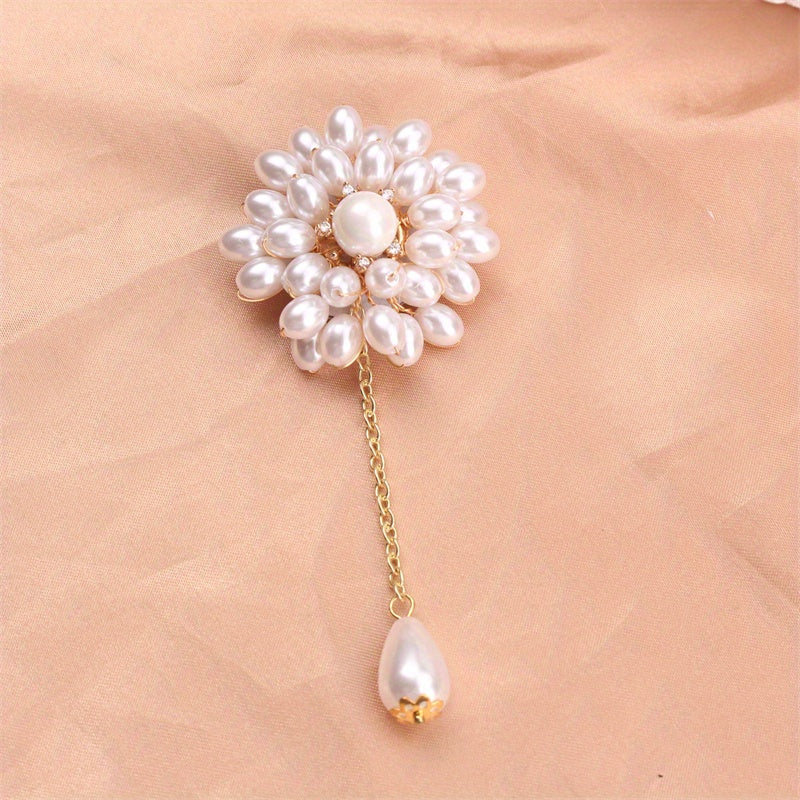 "Zarif marvarid gullari brosh pin franj zanjiri bilan jozibador va noyob moda aksessuari. Noaniq shakldagi sun'iy marvaridlar bilan tayyorlangan ushbu brosh, qo'shimcha nafislik uchun haqiqiy marvarid materialini o'z ichiga oladi."