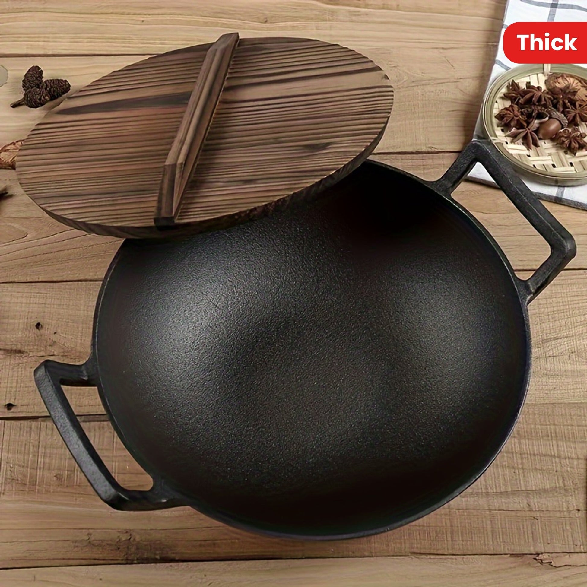 Katta temir wok, pin yog'och qopqog'i bilan, ikki tutqichli, gaz va elektr pechlariga mos