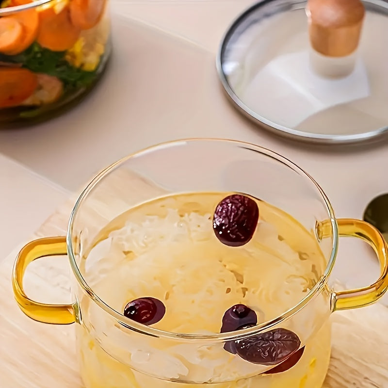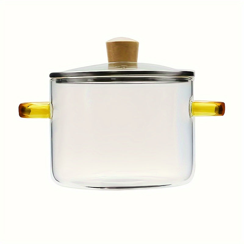 Borosilikat shisha sho‘rva qozoni 1.5L Sariq tutqichli, yuqori haroratga chidamli, qopqog‘ bilan