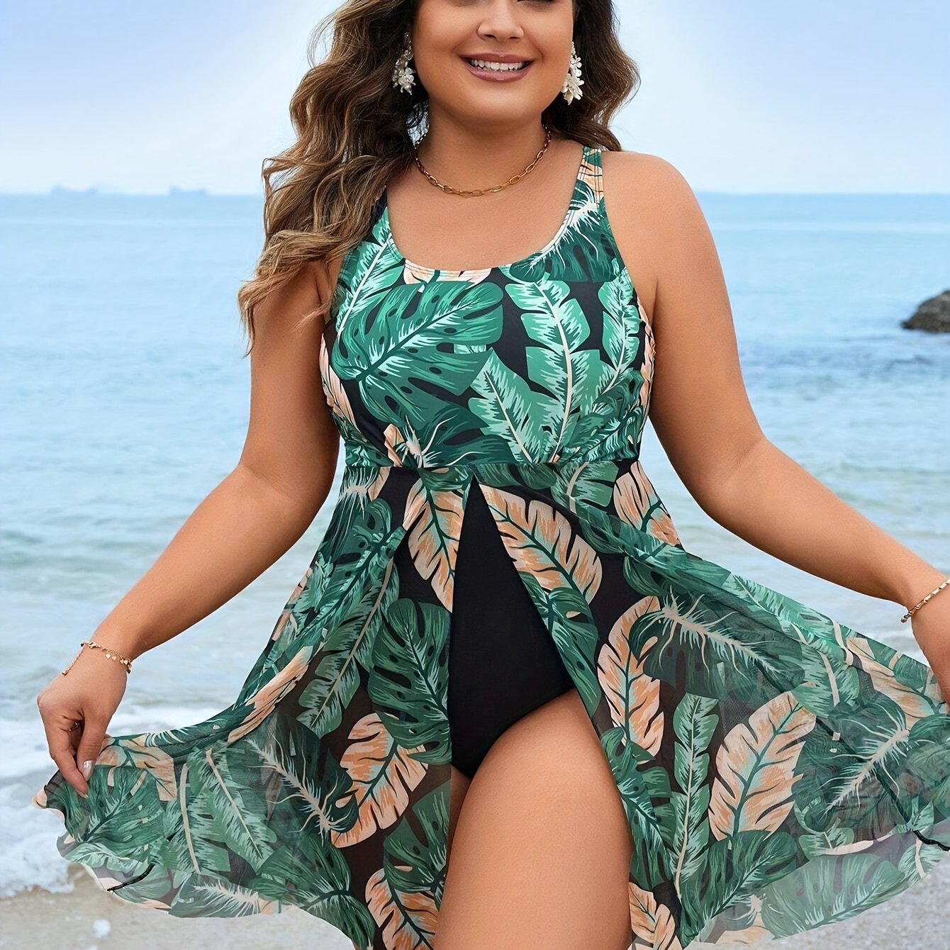 Tropik barg naqshli bir qismli suzish kiyimi, to'r tafsiloti bilan, yozgi plyaj kiyimlari uchun mukammal.