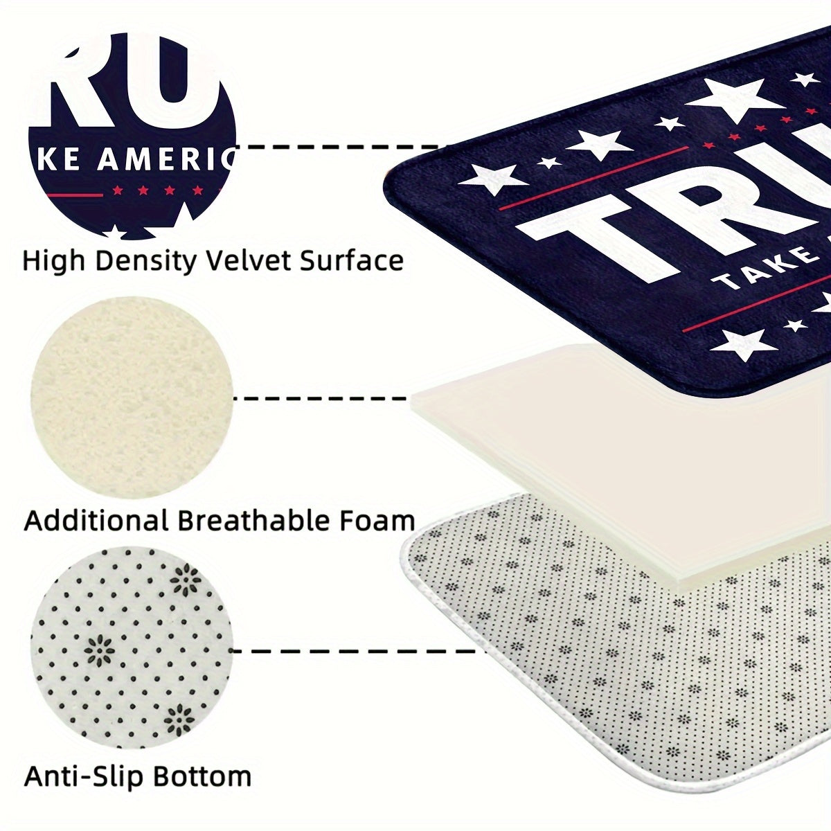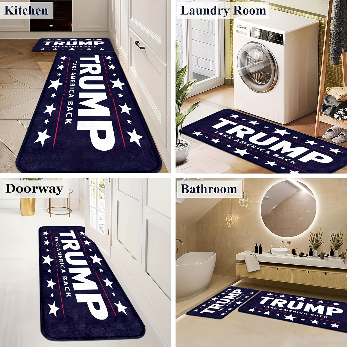 "Trump Amerika qaytarish" eshik tagliklari ikki o'lchamda mavjud: 74.93 sm x 44.96 sm va 119.89 sm x 44.96 sm. Xususiyatlari: Mashinada yuvish mumkin, sirpanmaydigan va uzoq muddatli foydalanish uchun bardoshli.