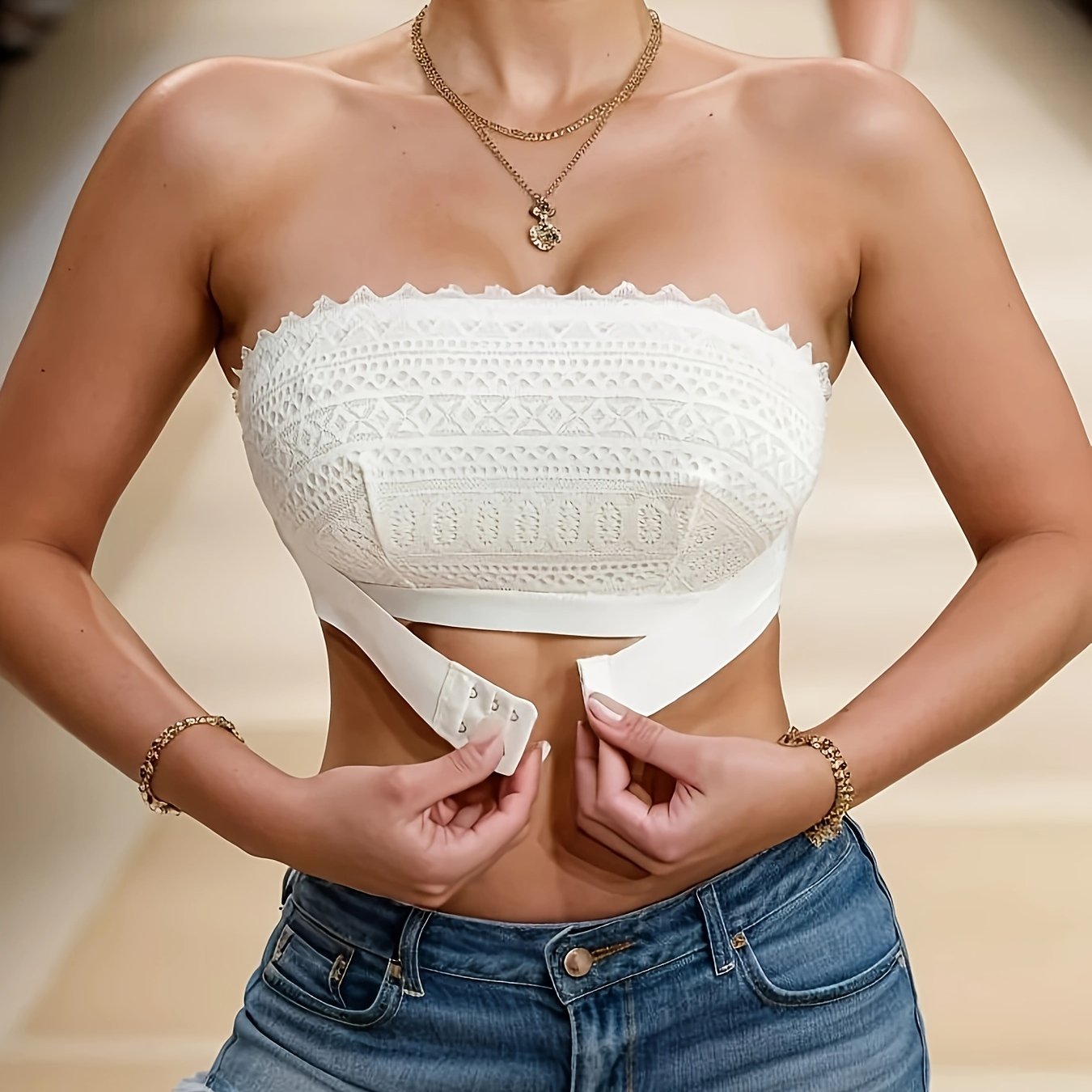 Old qismidagi tugma bilan, gullar bilan bezatilgan dantel va ko'rinmas kamarlar bilan, ayollarning ichki kiyimlarini kiyish uchun mukammal tube brasi.