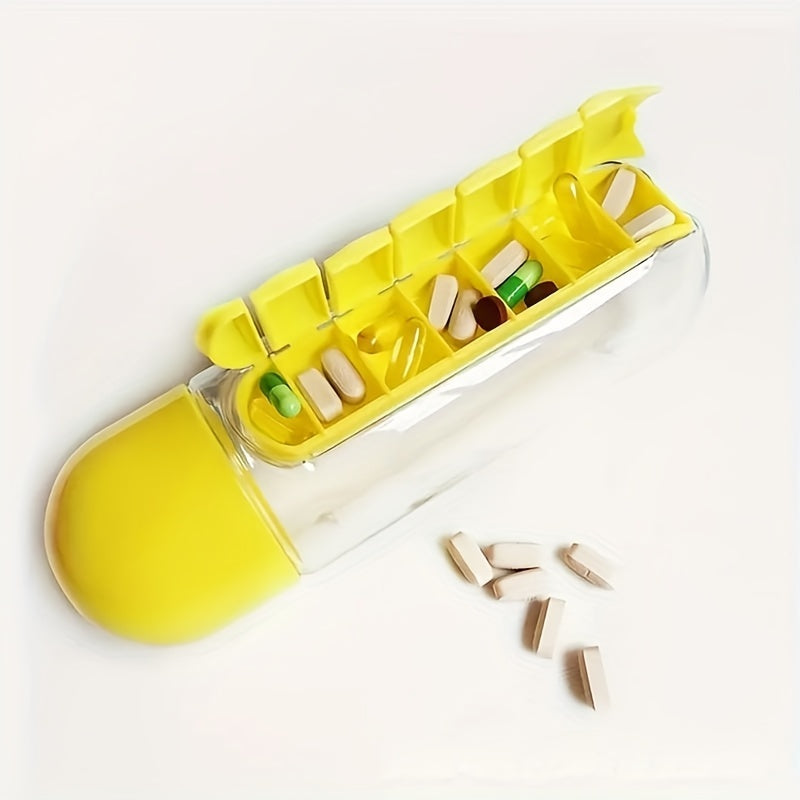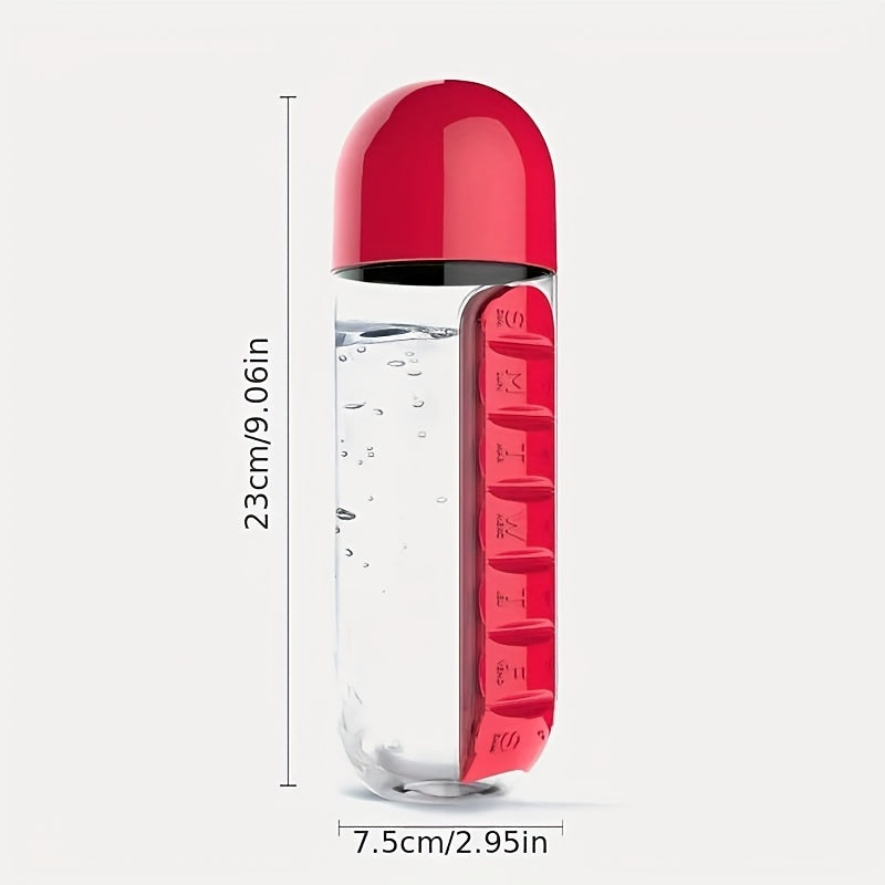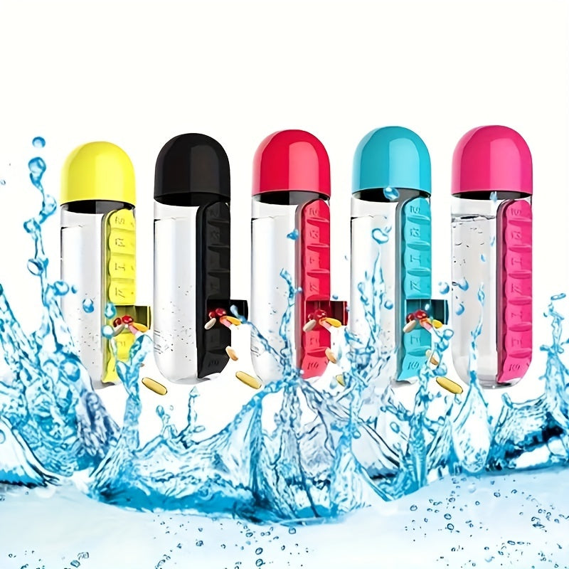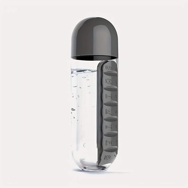 Ikki-in-bir portativ suv shishasi va yetti kunlik bo'linmaga ega dori qutisi.
