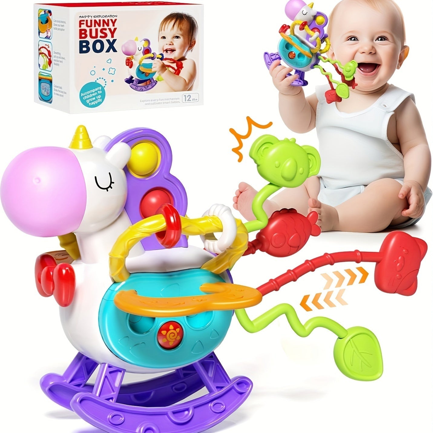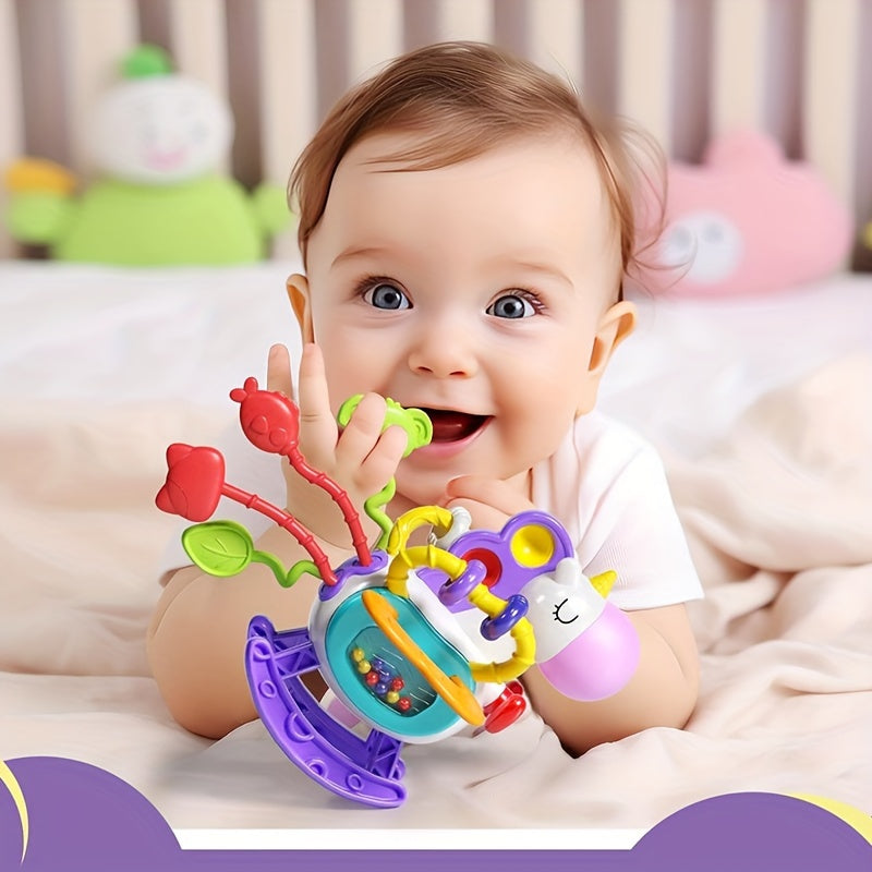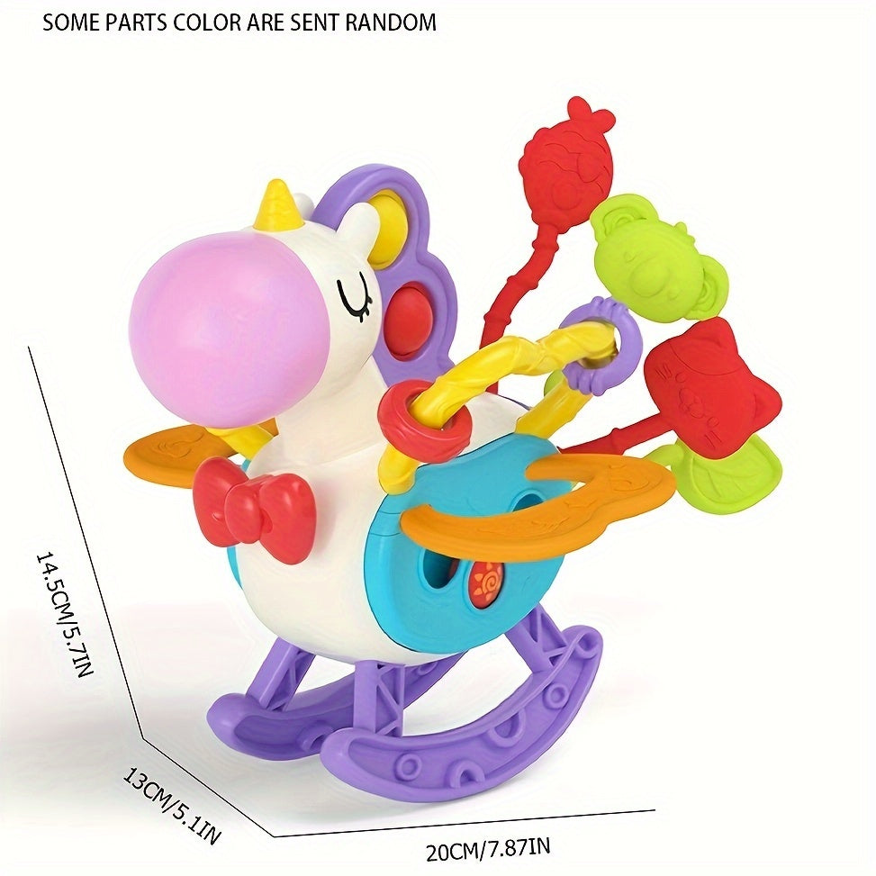 Unicorn mavzusidagi sezgi o'yinchoqlari, bolalar uchun mo'ljallangan, ta'limiy o'yin va tish chiqishida yordam berish uchun silikon tortish ipi faoliyatlari bilan. 6, 9, 12 va 18 oylik o'g'il va qizlar uchun mukammal tug'ilgan kun sovg'alari.