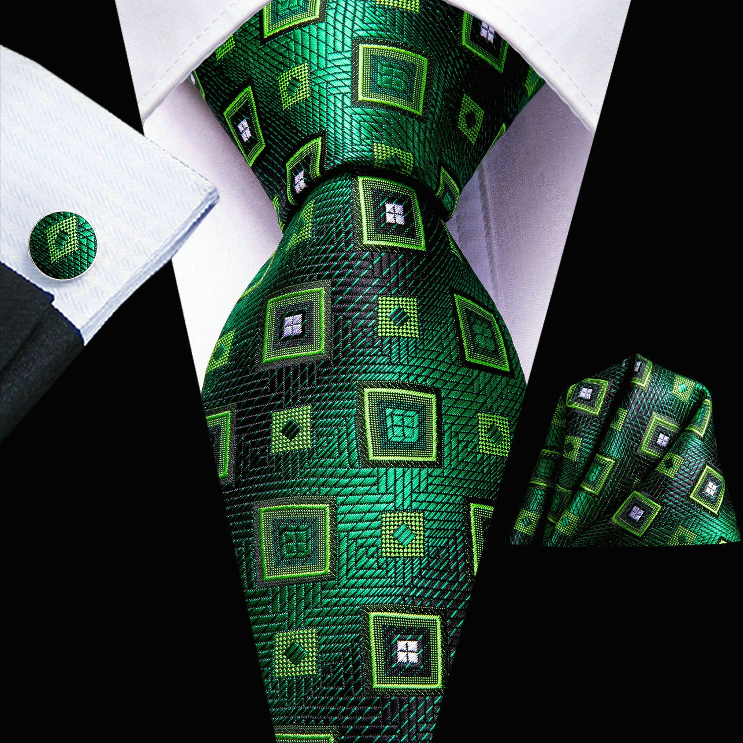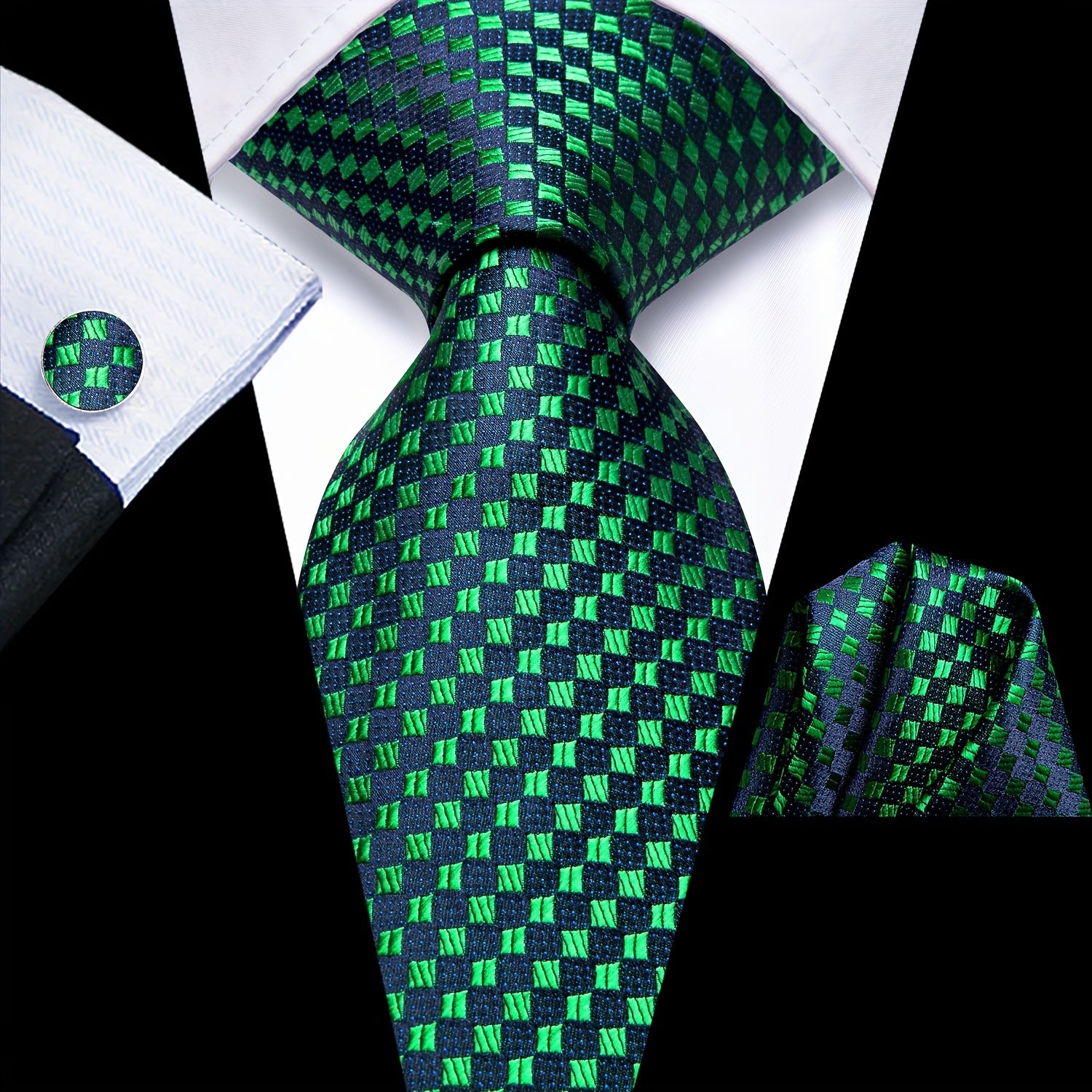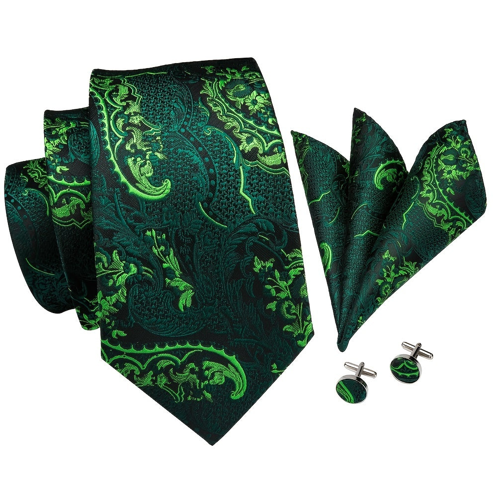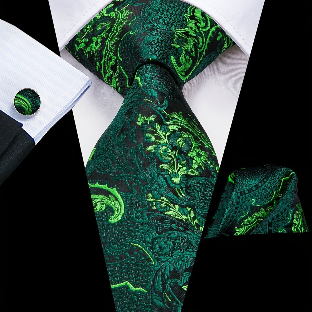 Erkaklar uchun yashil galstuk to'plami, manşetli bog'lamlar va cho'ntak sharf bilan, to'ylar va biznes uchun