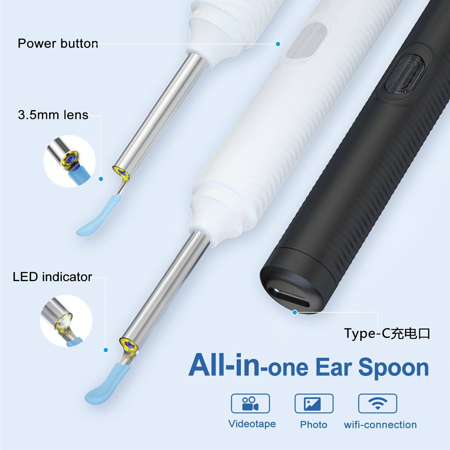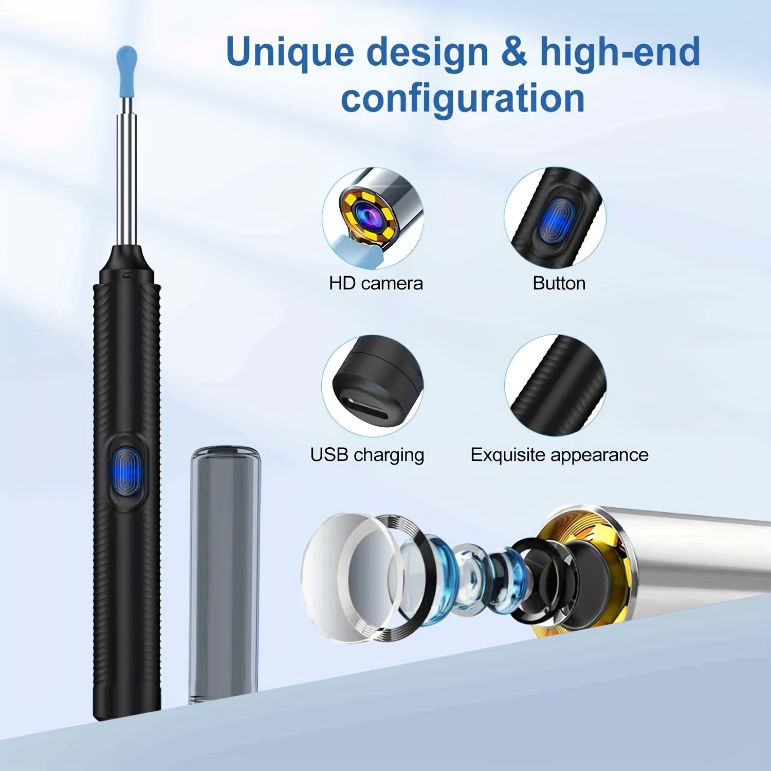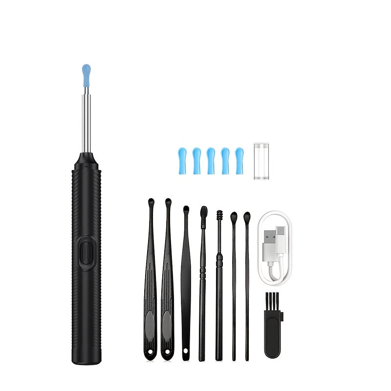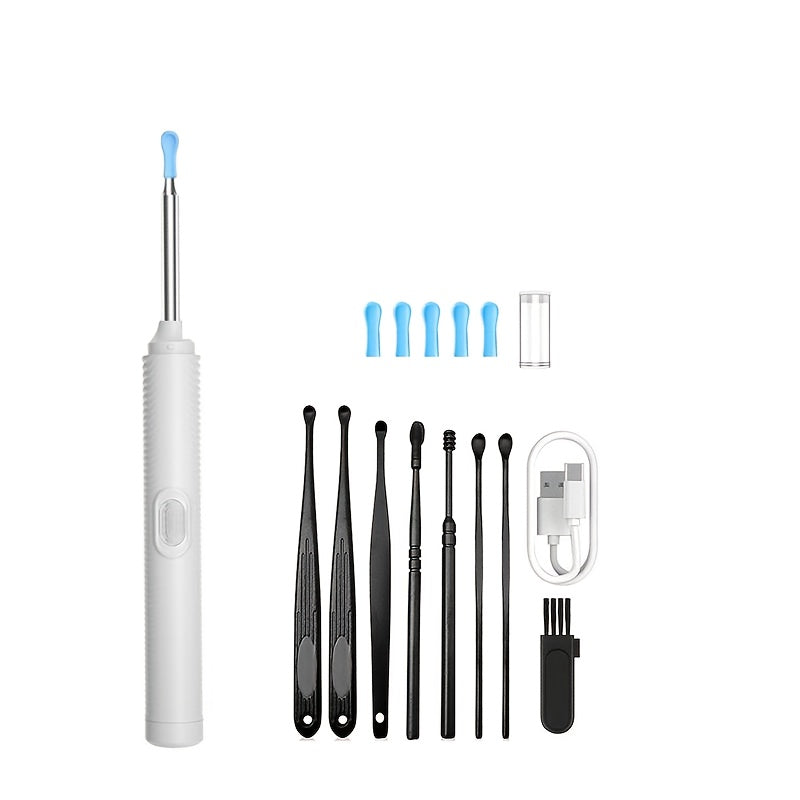 USB orqali zaryadlanadigan LED quloq mumini olib tashlash to'plami, litiy polimer batareyasi, vizual quloq tozalash vositasi, uyda foydalanish uchun bir nechta ucliklar va cho'tkalar.