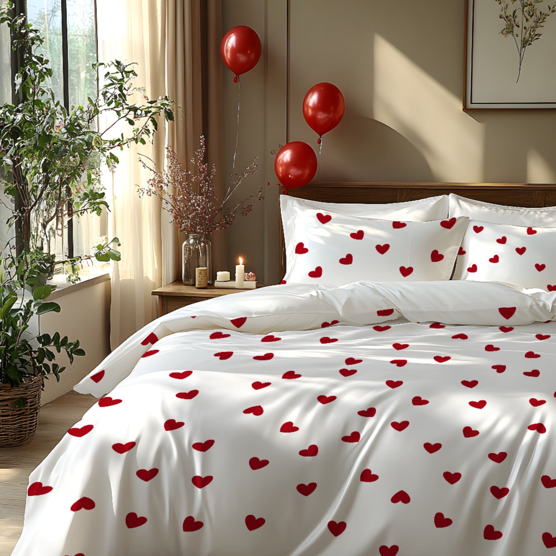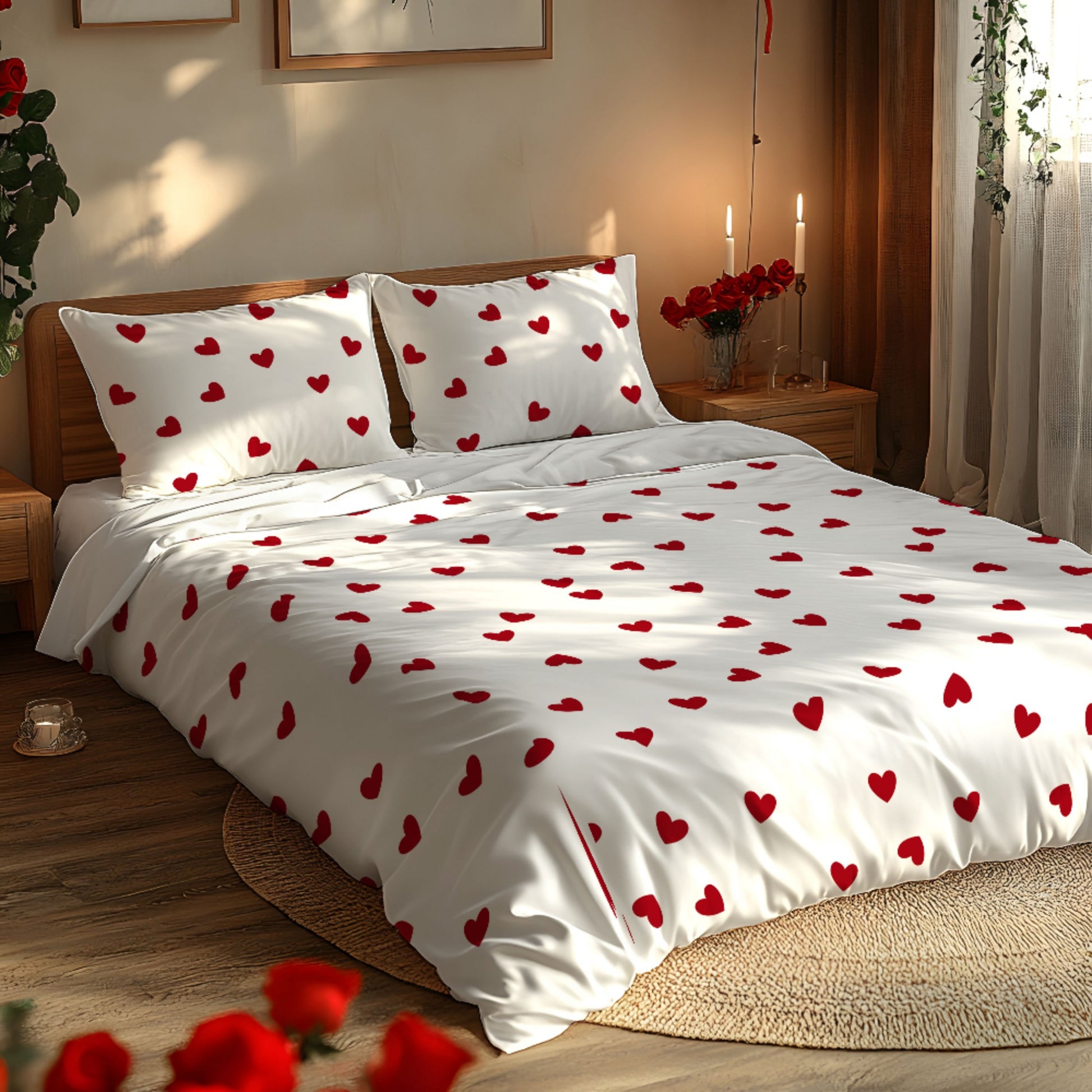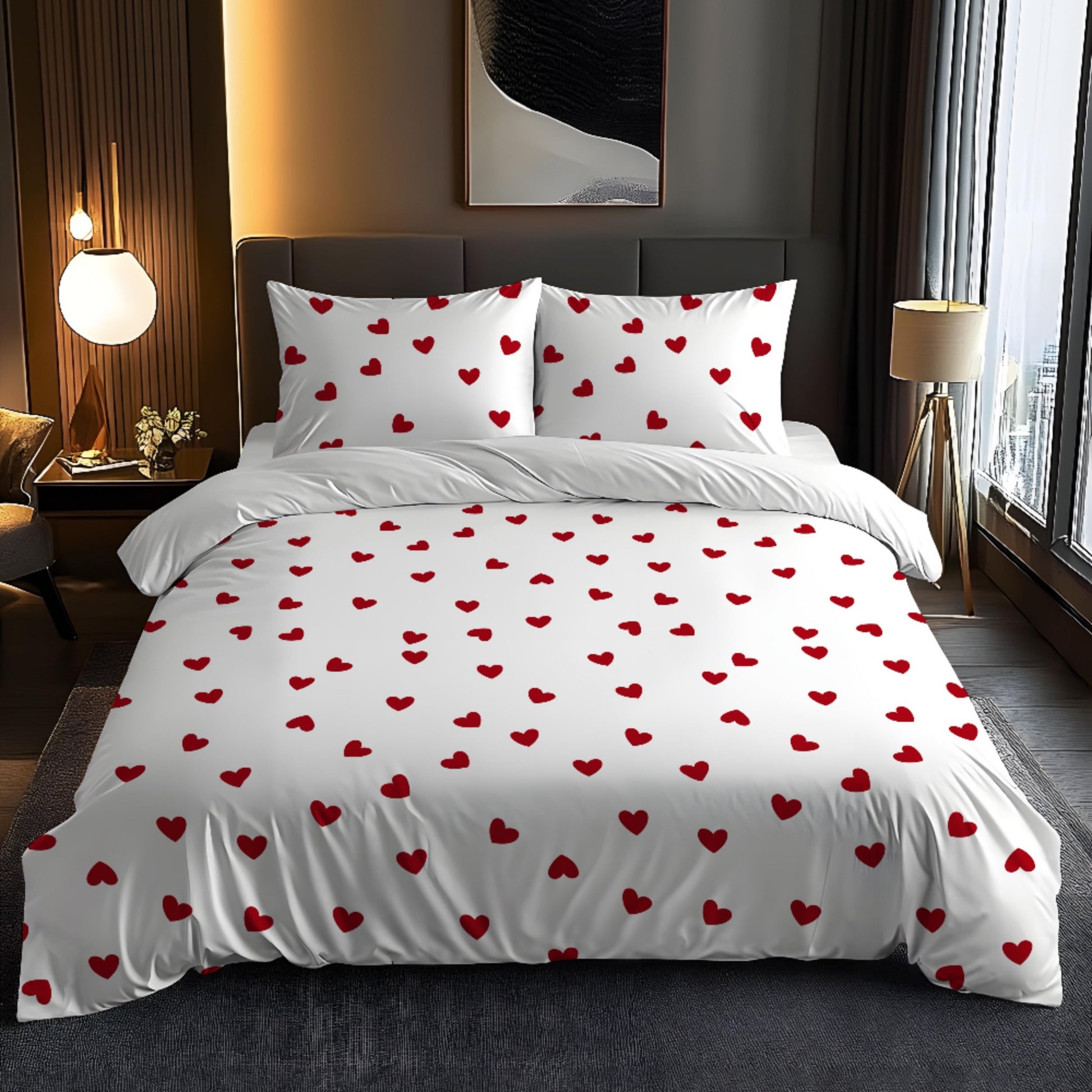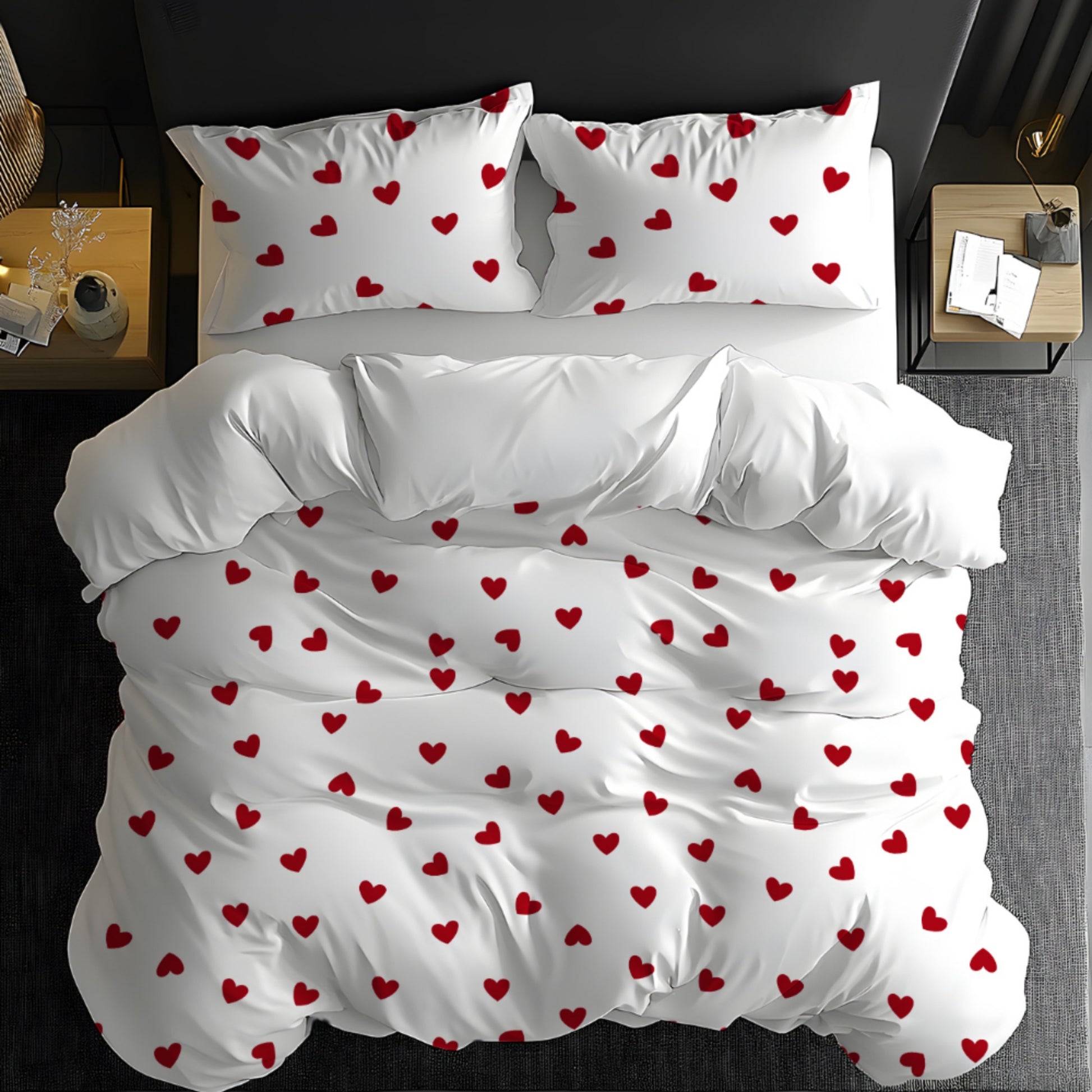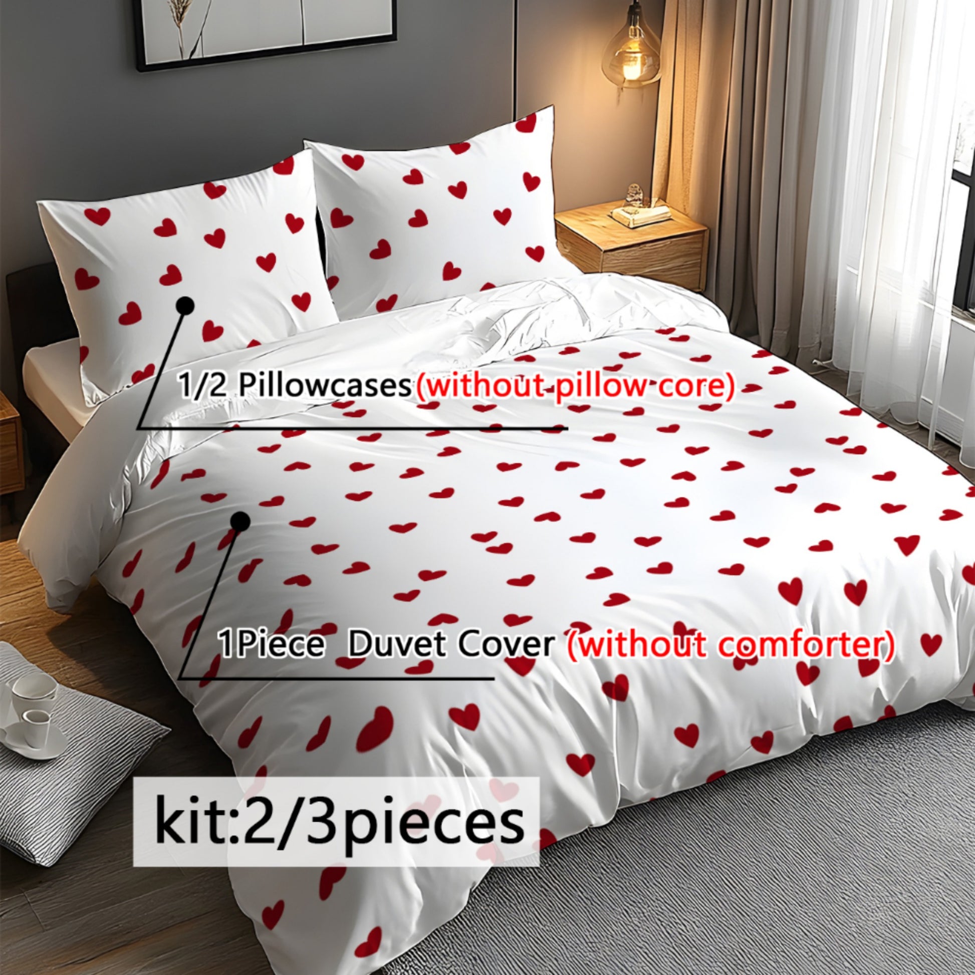 Sevgi mavzusidagi 3 qismli yotoq to'plami, yumshoq fleece matodan tayyorlangan, 3D raqamli bosma bilan bezatilgan. 1 qopqoq va 1-2 yostiq qopqog'ini o'z ichiga oladi. Mos keladi