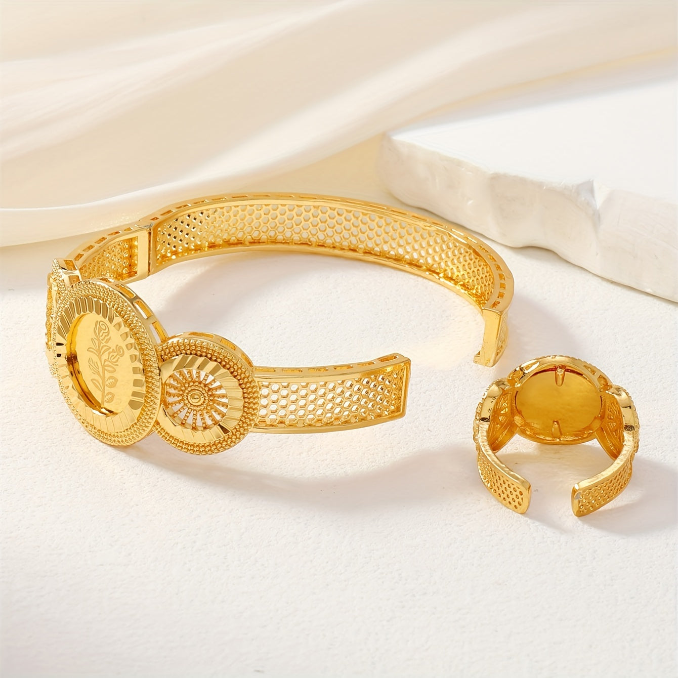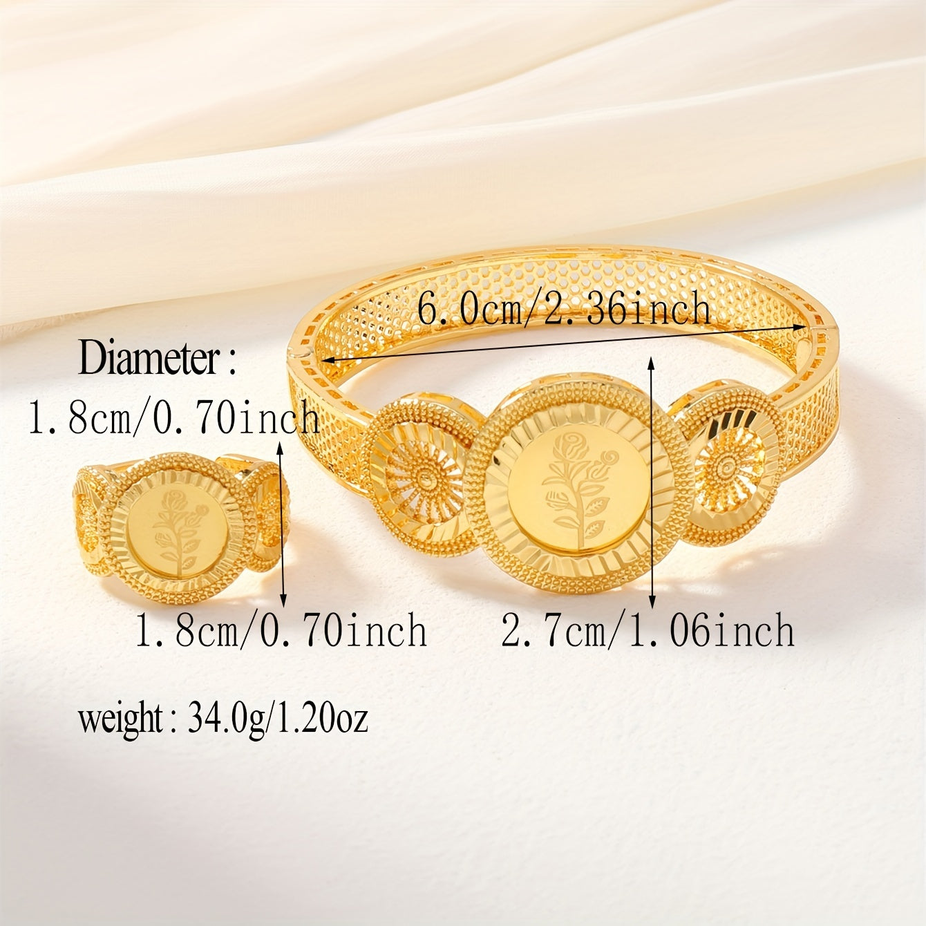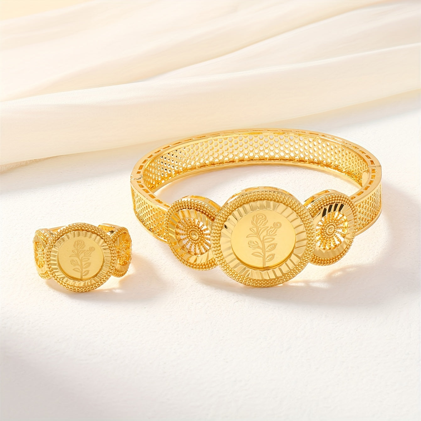 Vintage uslubidagi mis zargarlik to'plami, dumaloq Udan gul dizayni bilan, ayollar uchun 1 dona bilaguzuk va uzukni o'z ichiga oladi.