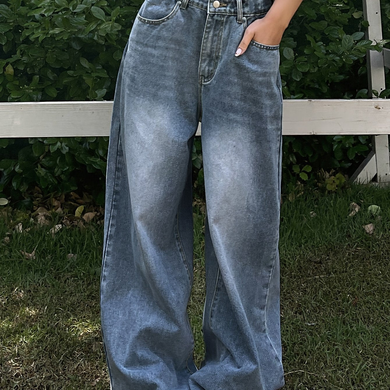 Ayollar uchun suvda yuvilgan ko'k rangdagi juda uzun keng oyoq jinsilari, tasodifiy kuz kiyimlari uchun mukammal.