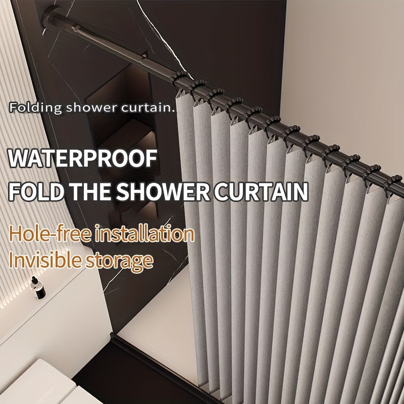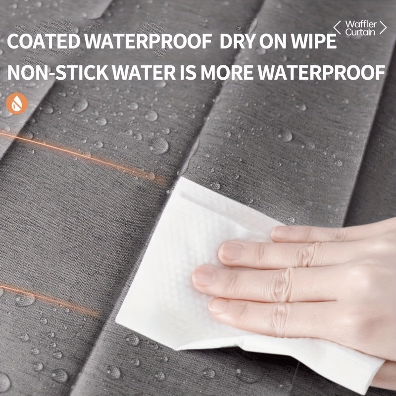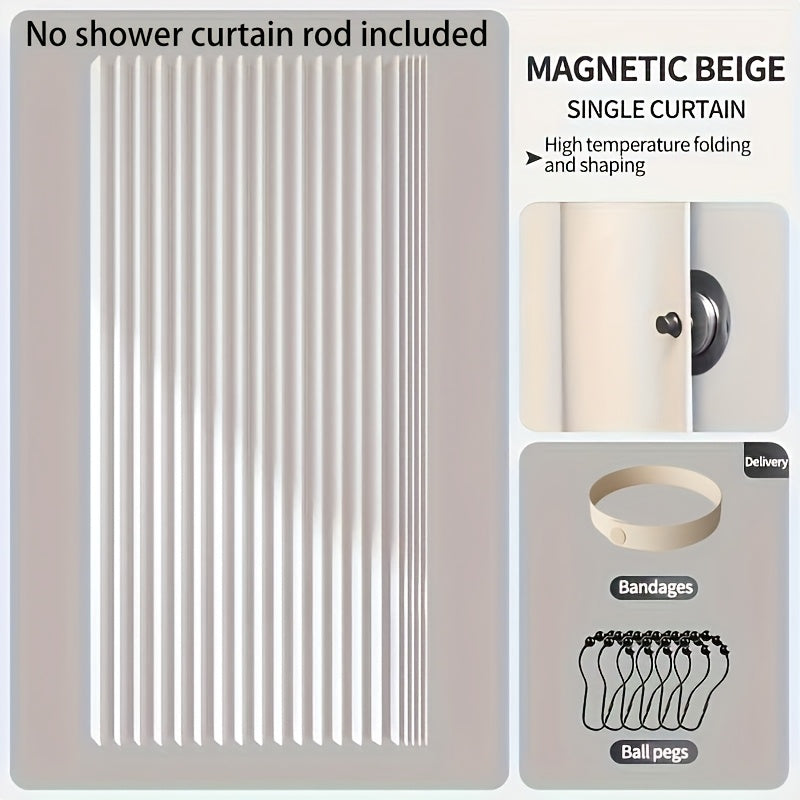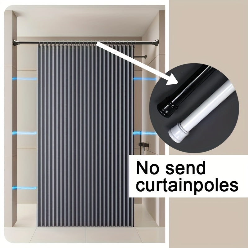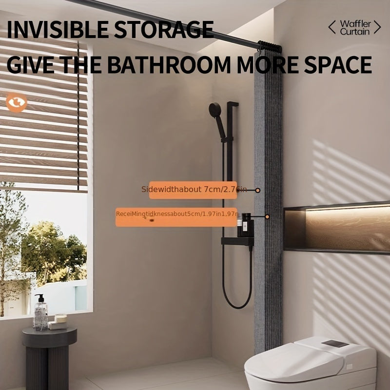 Suv o'tkazmaydigan kulrang egiluvchan dush pardasi, magnit bog'ich bilan, polyester to'lqin ekrani, qora ilgichlar kiritilgan, barcha mavsumlar uchun mashinada yuvish mumkin.