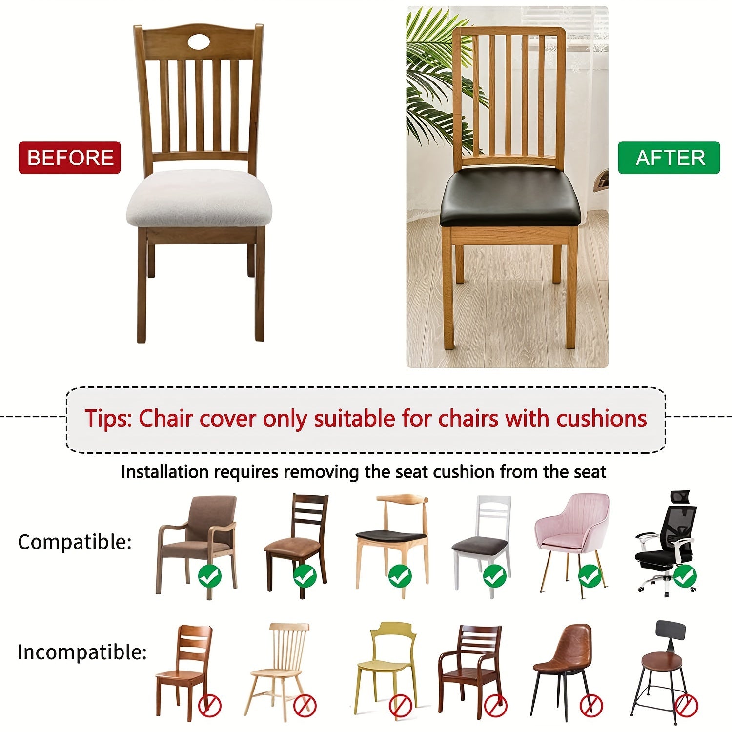 Ovqatlanish xonasi, oshxona, mehmonxona va uy bezaklari uchun suv o'tkazmaydigan PU charm stul qoplamalari.