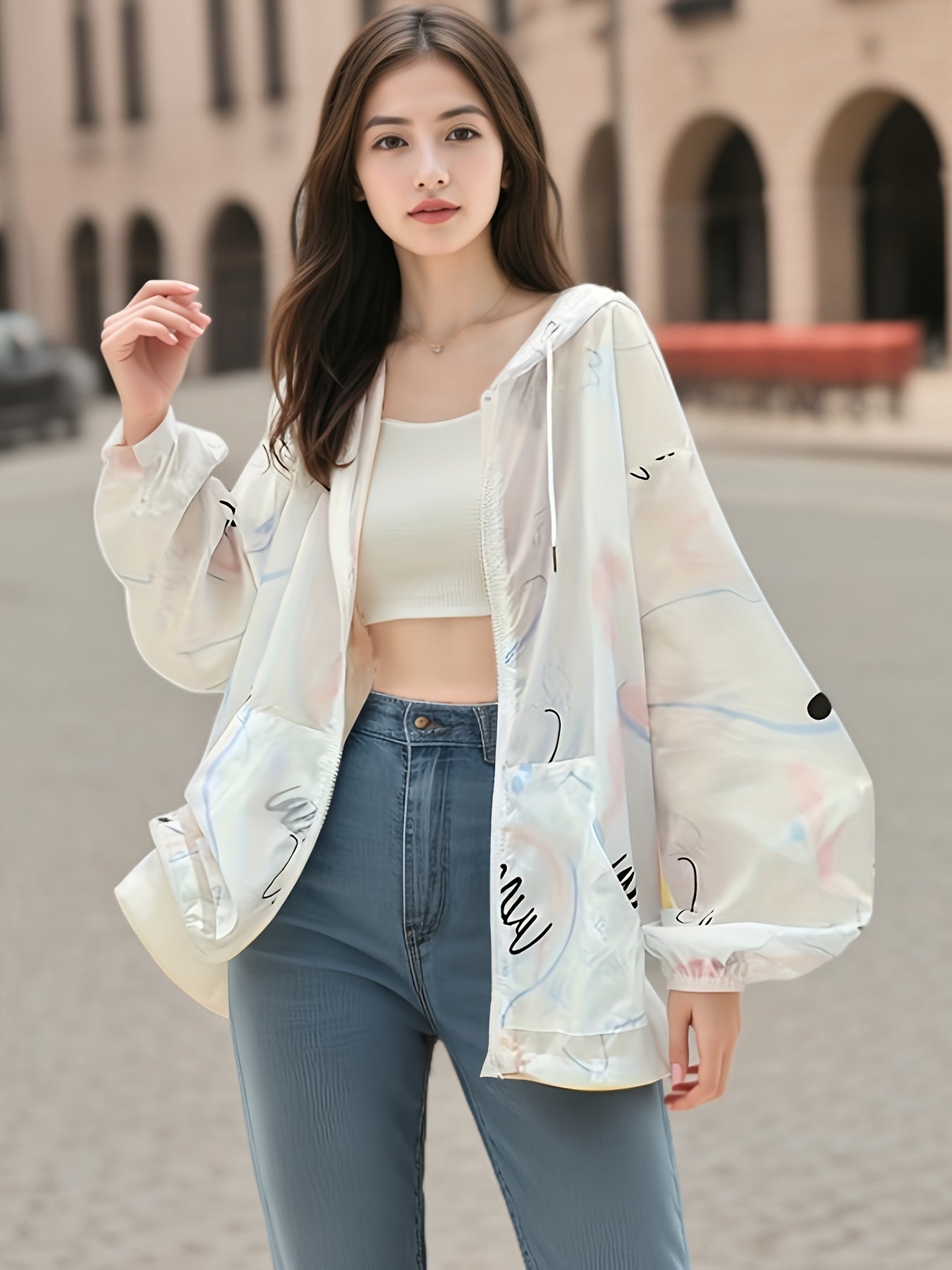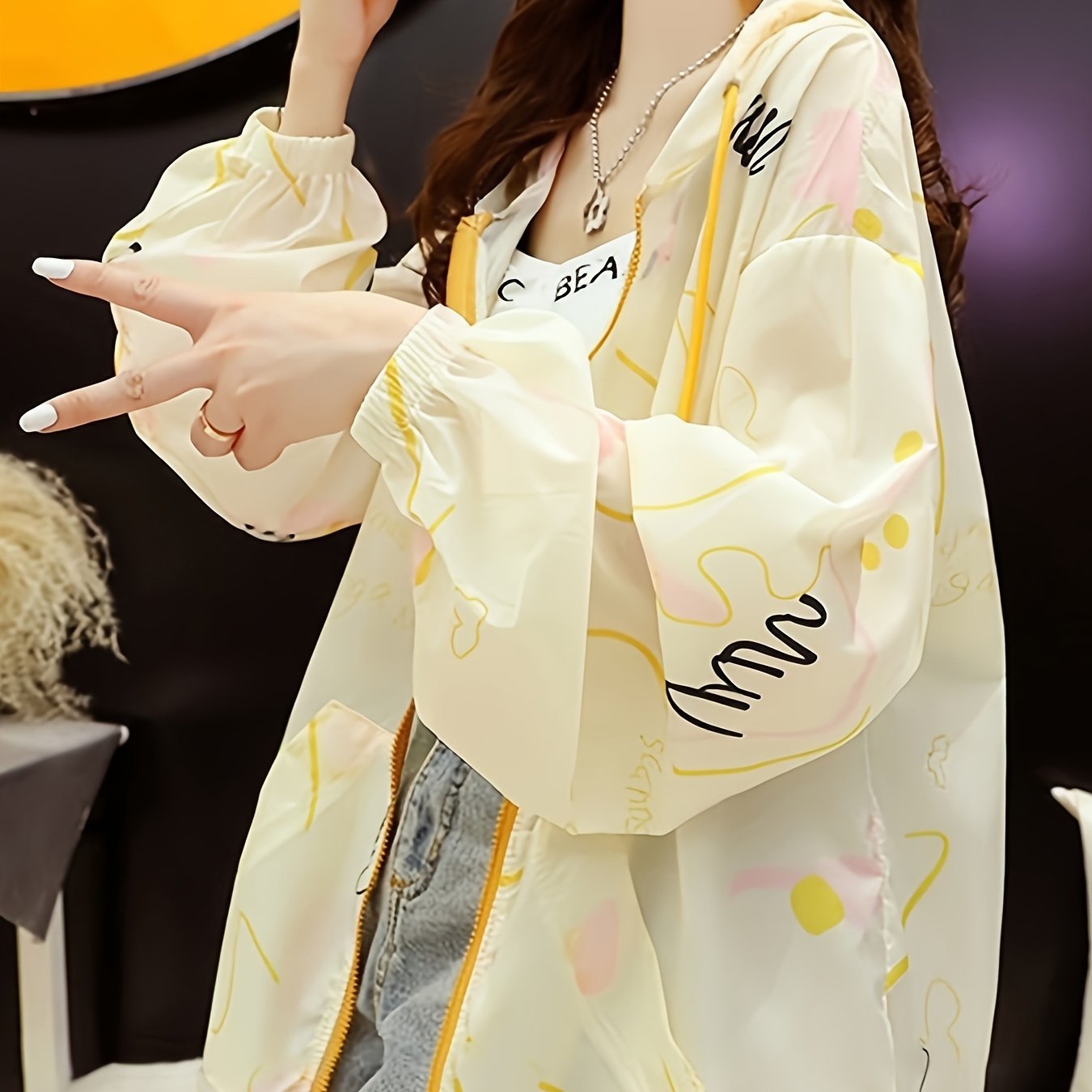 Ayollar uchun oq kaputli jaket, sariq aksentlar bilan va quyoshdan himoya, sport uslubidagi Koreya dizayni bilan chiziqli uzun yenglar bilan. Nafas oladigan polyester aralashmasidan tayyorlangan, bahor uchun mukammal.