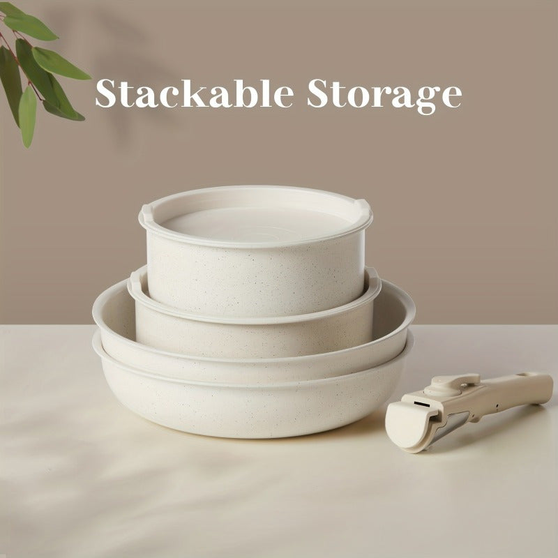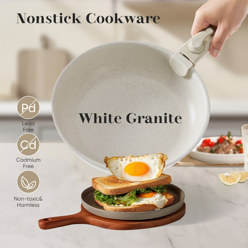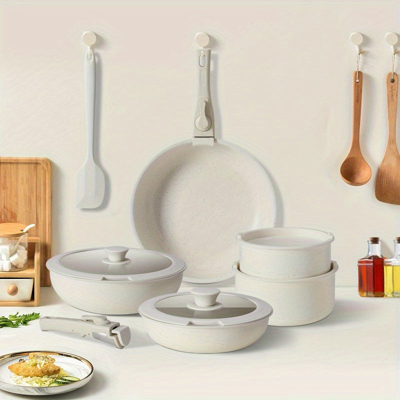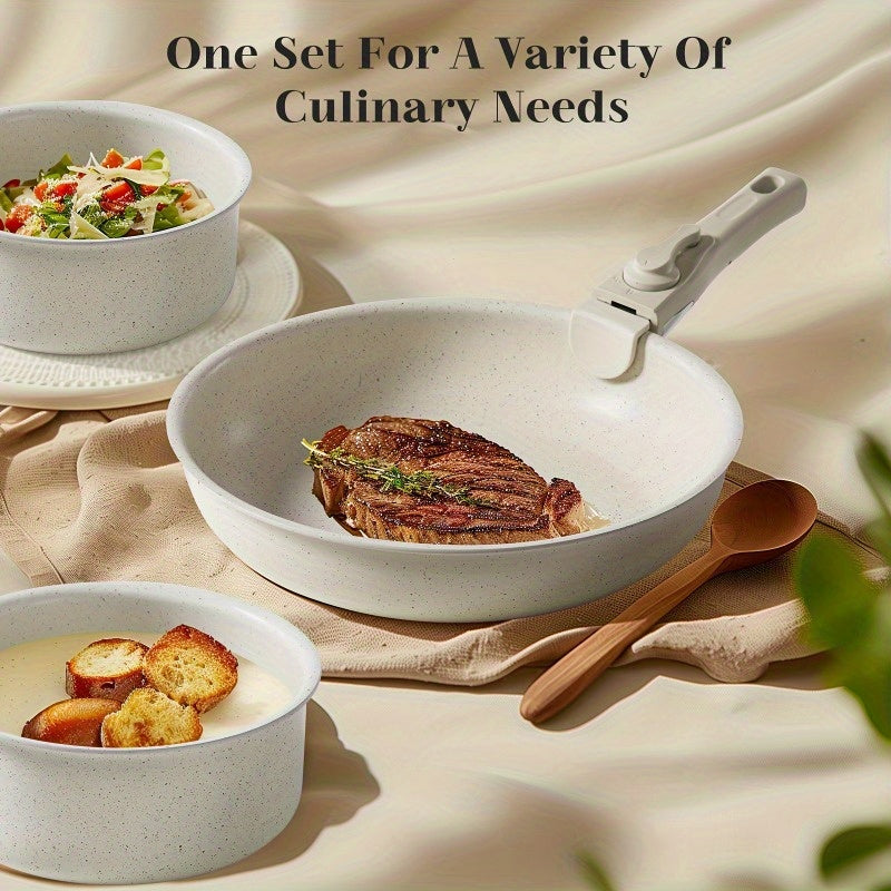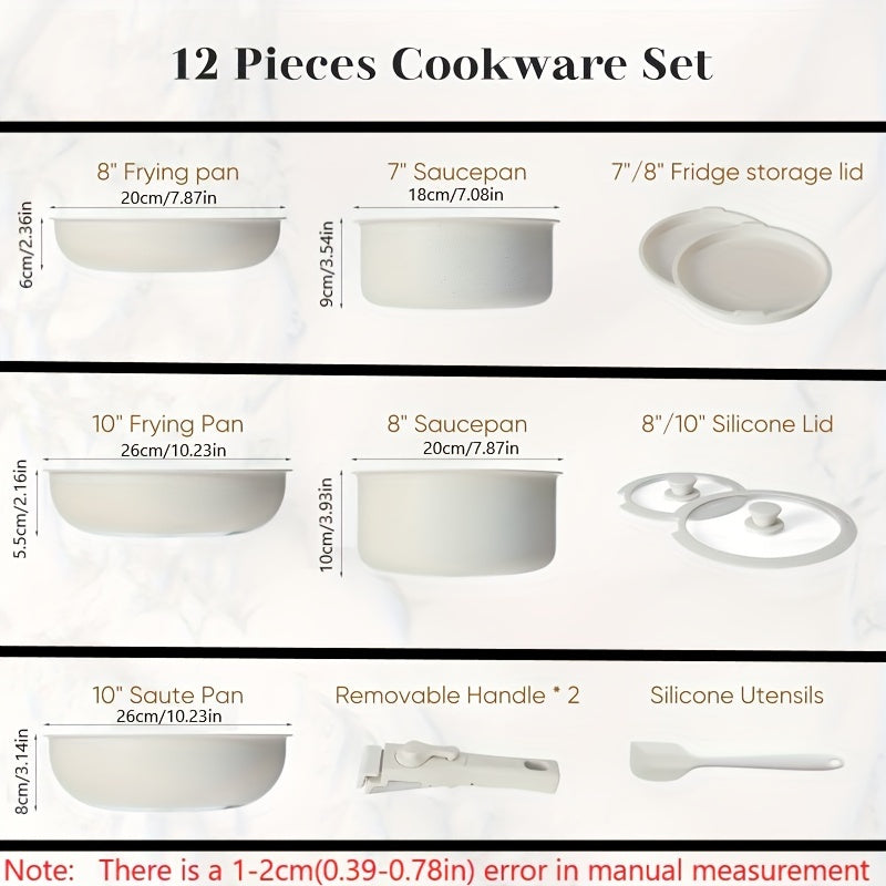 Oq yopishqoq idish-to'plami 12 dona, induksion pishirish uchun mos. Ajratiladigan tutqich, pechda xavfsiz qurilish va qulay saqlash uchun yig'iladigan dizayn bilan ajralib turadi. Uydagi oshxonalar va RVlarda foydalanish uchun ideal.