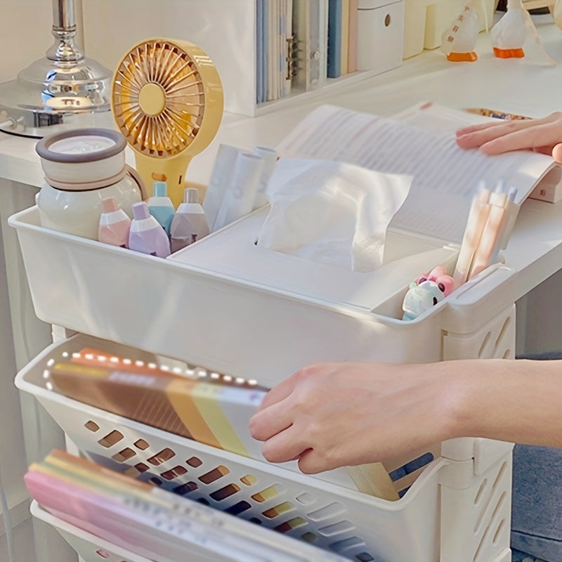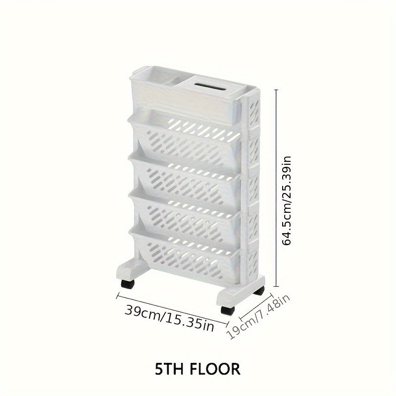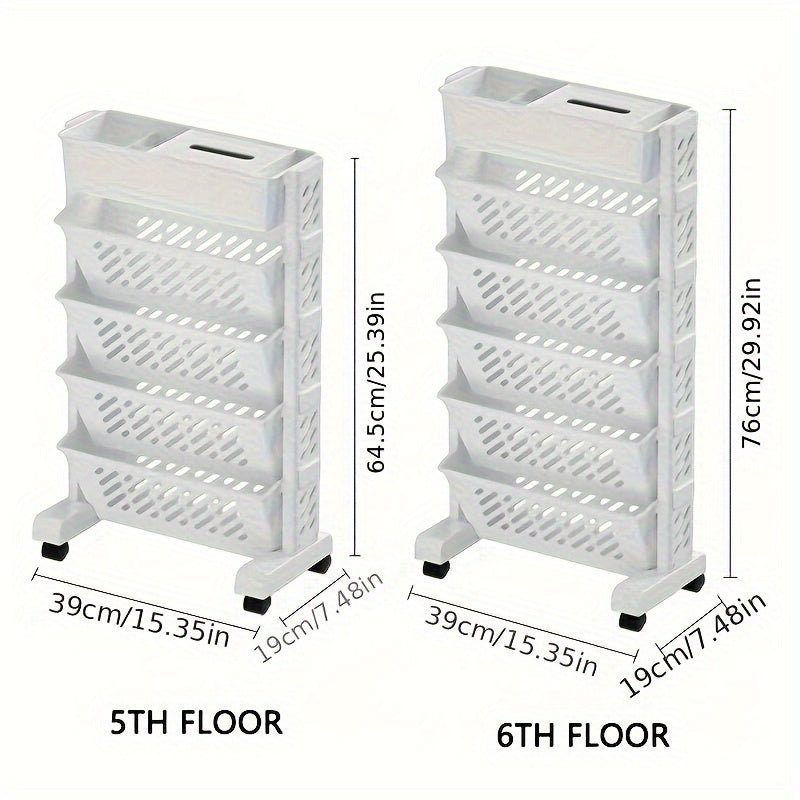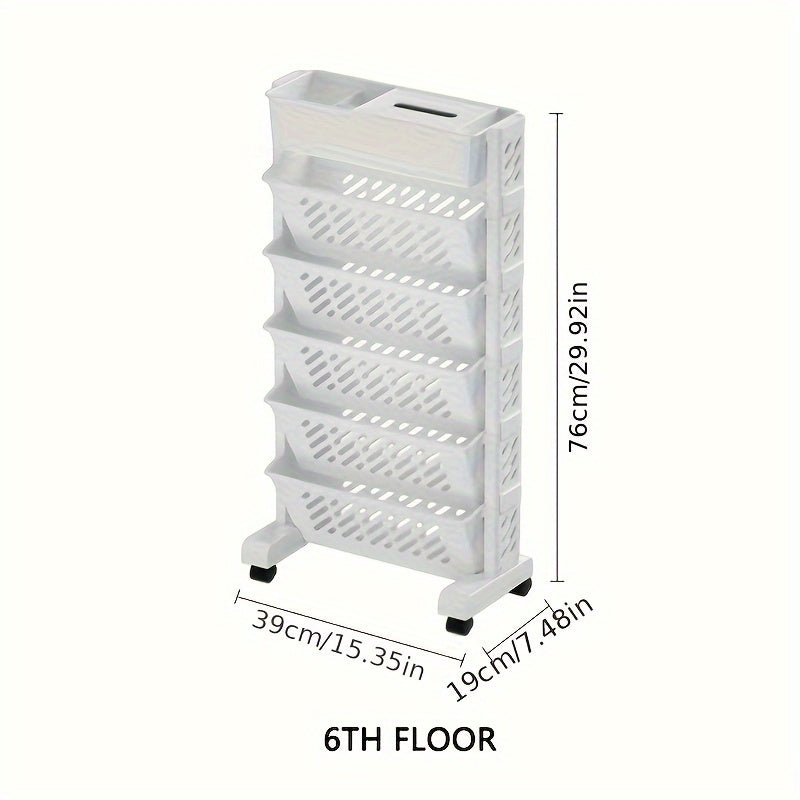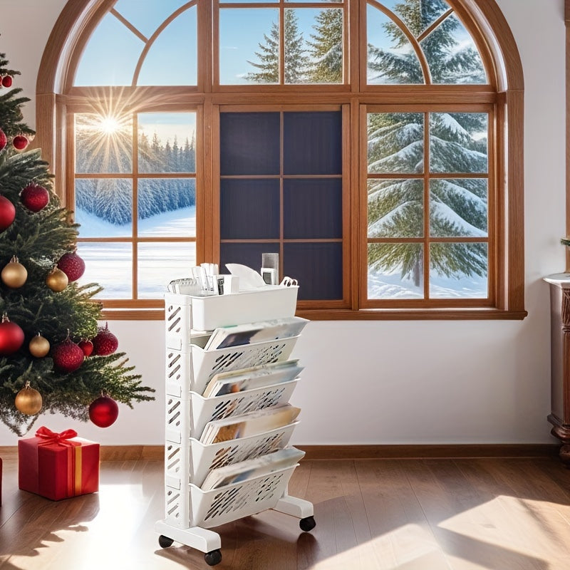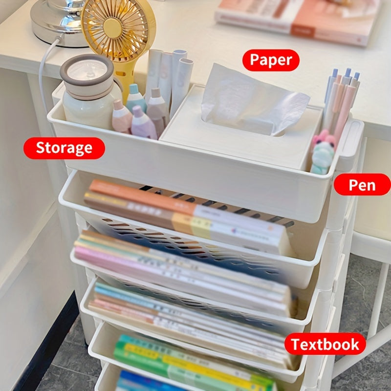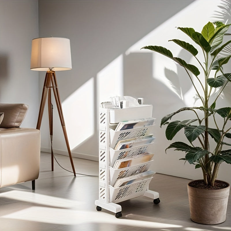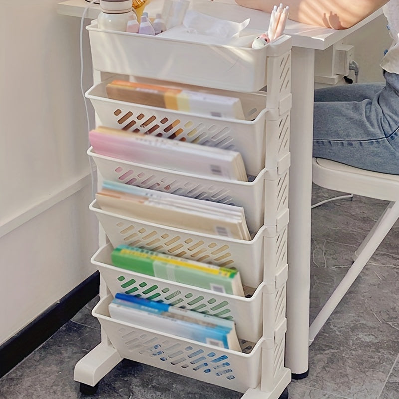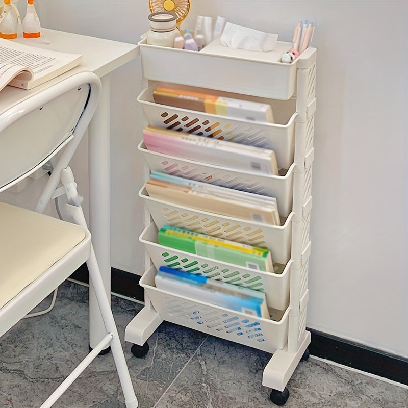 O'ffisda buyumlarni tartibga solish uchun 5 yoki 6 qatlamli oq plastik saqlash javoni.