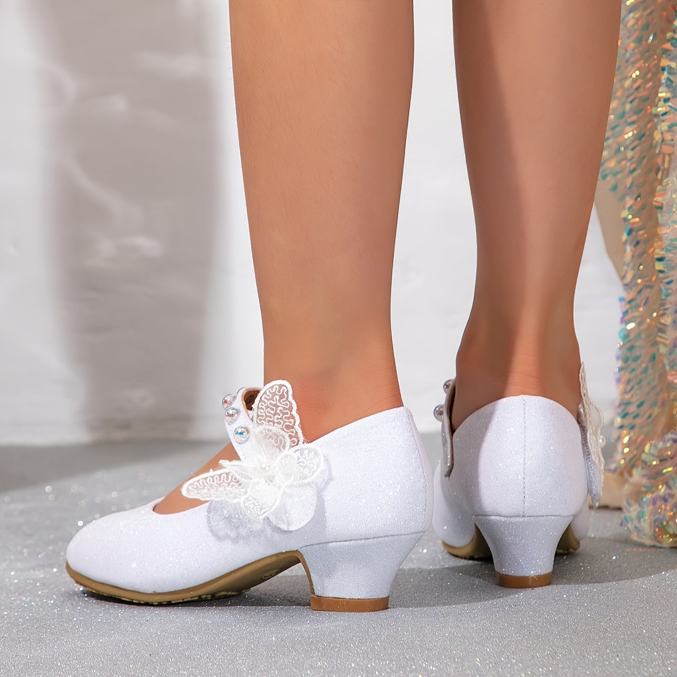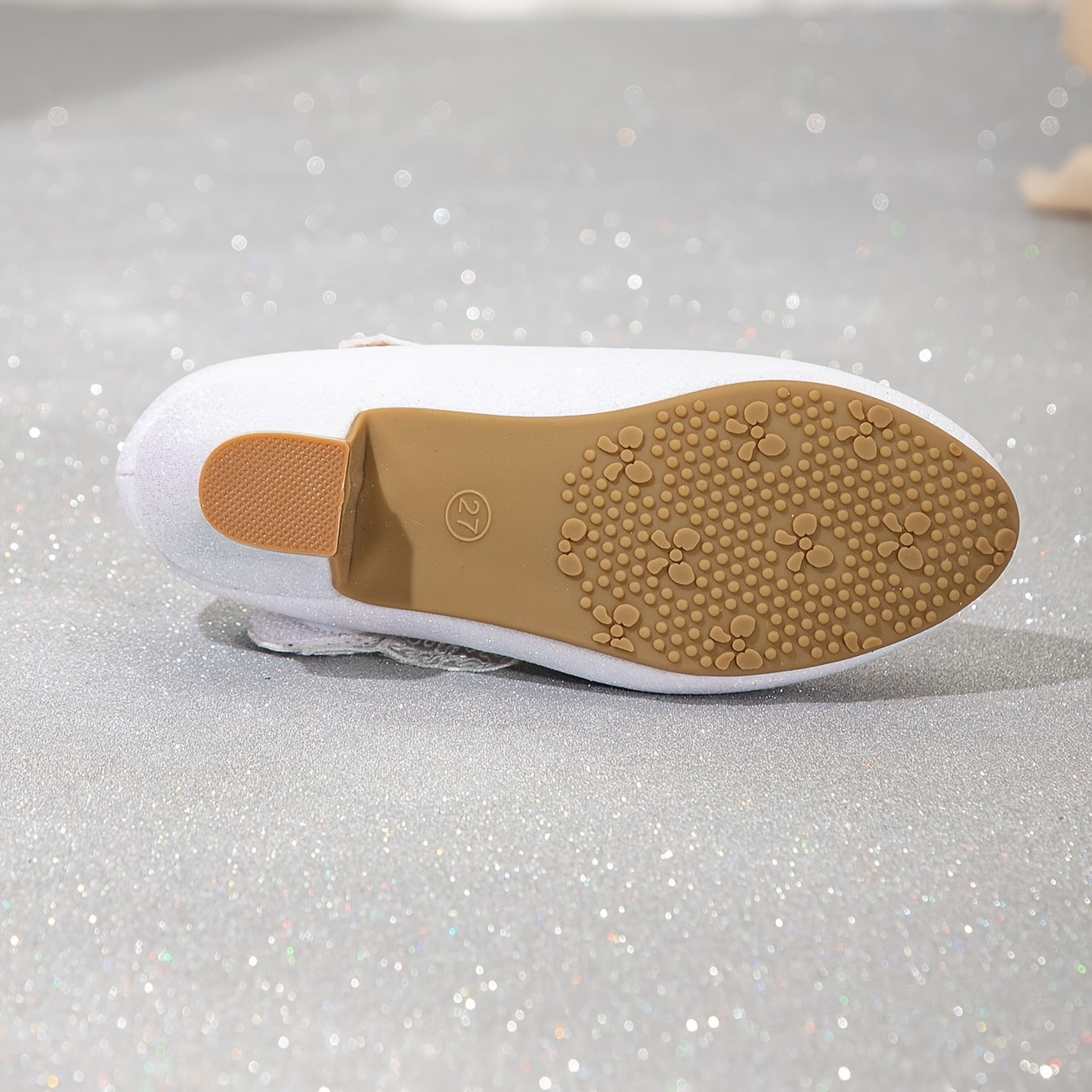 Marvarid kamonli oq payetli malika poyabzallari, raqs chiqishlari uchun ideal, baland tovonlar.