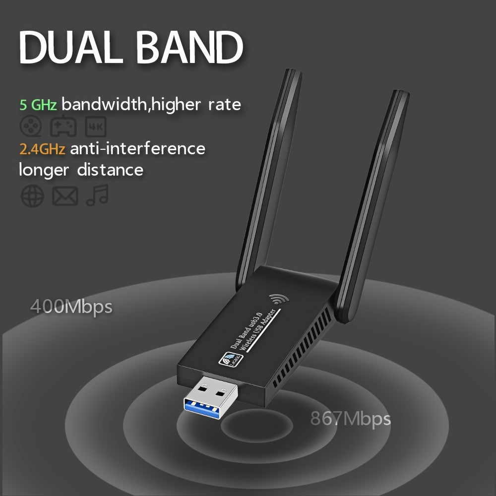 Windows MacOS uchun 5dBi antennalar bilan 1300Mbps Dual Band USB WiFi adapteri