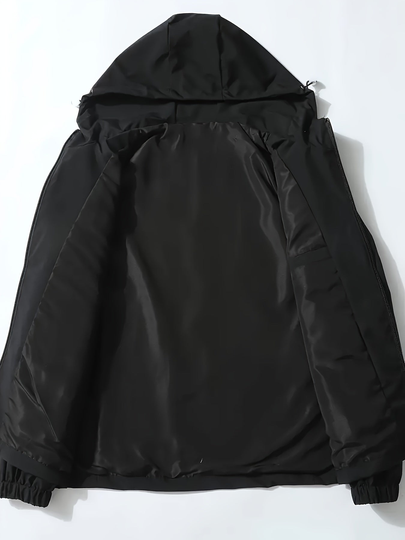 Yozgi va kuz mavsumlari uchun mo'ljallangan, tikuvli detali bo'lgan erkaklar uchun shamol o'tkazmaydigan kapüşonli jaket.