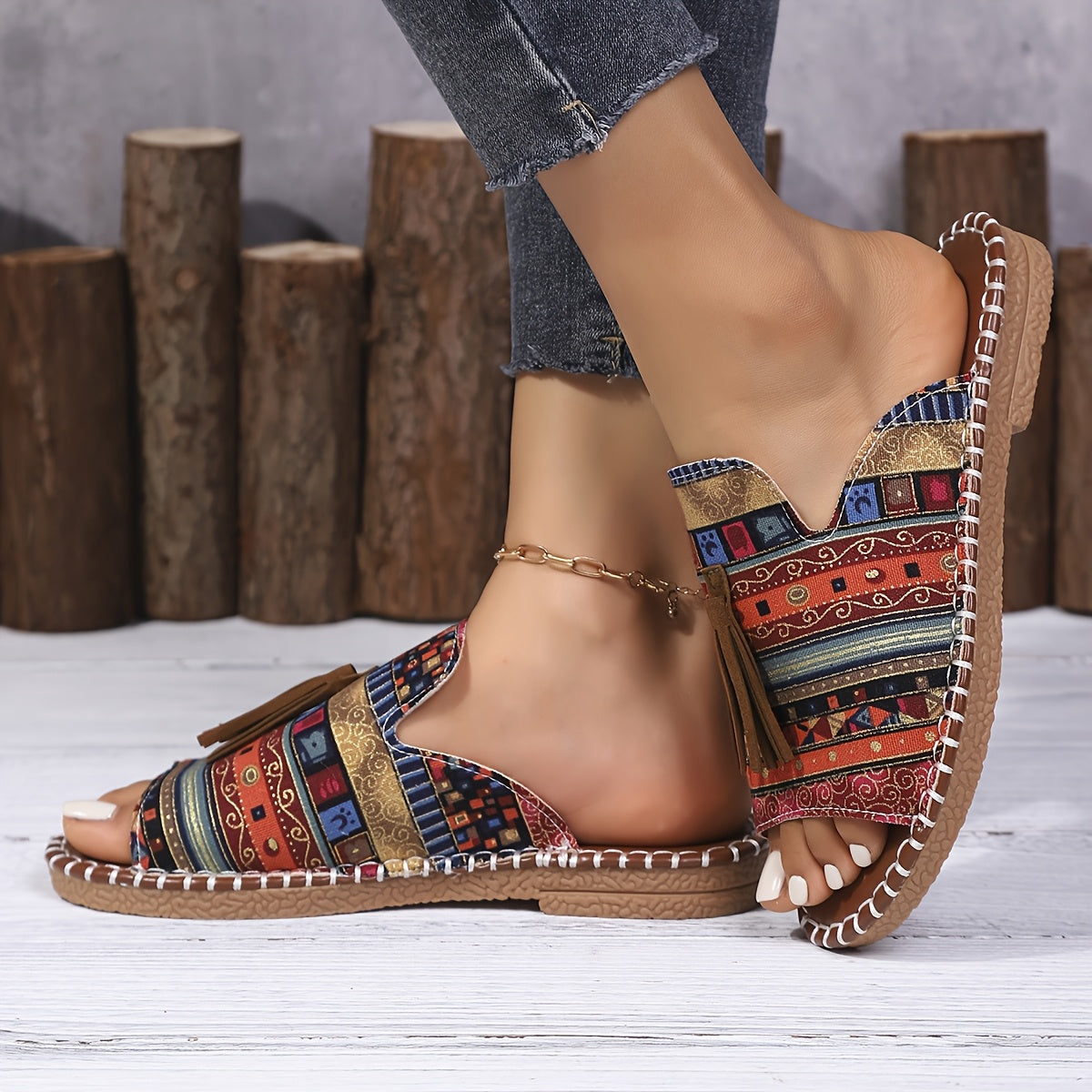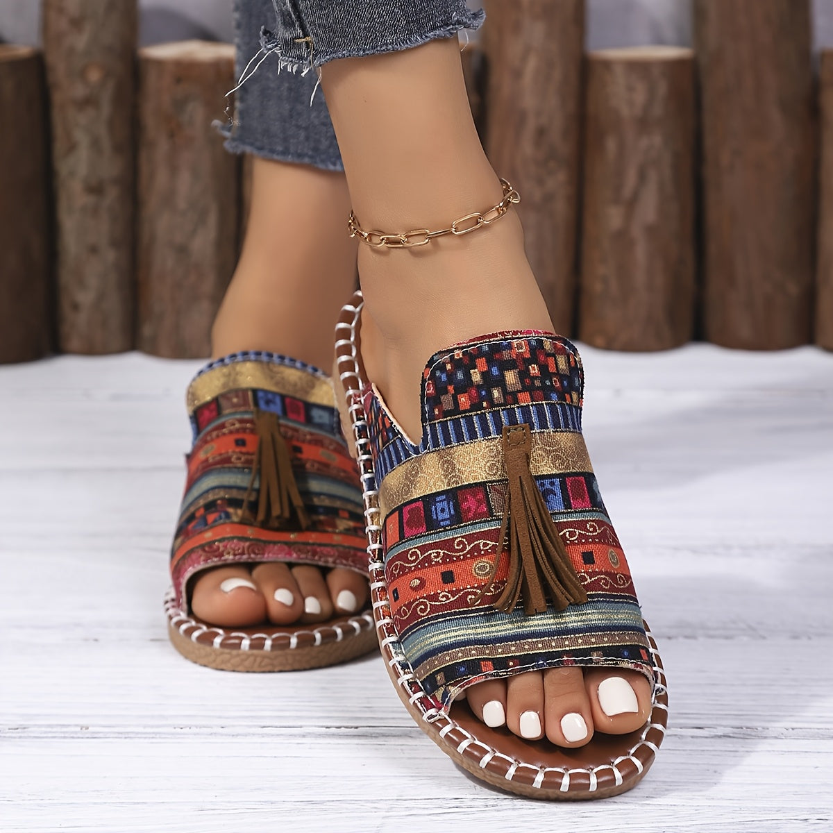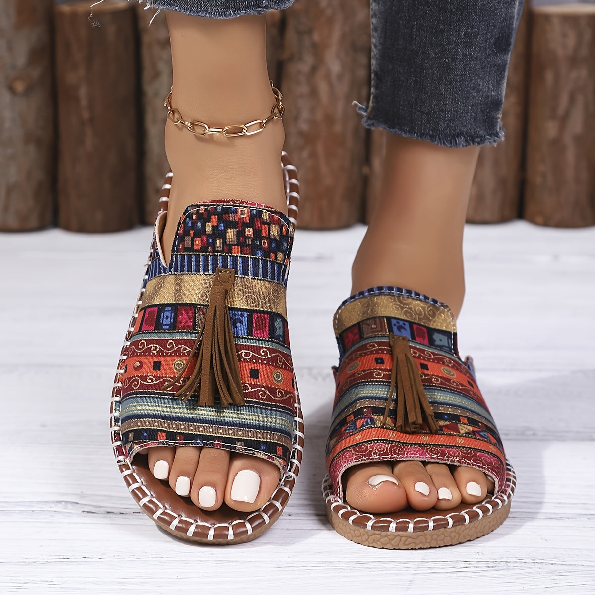 Ayollar uchun Bohemia tekis sandalki, etnik tassel, sirpanchiq bo'lmagan rezina, kundalik plyaj