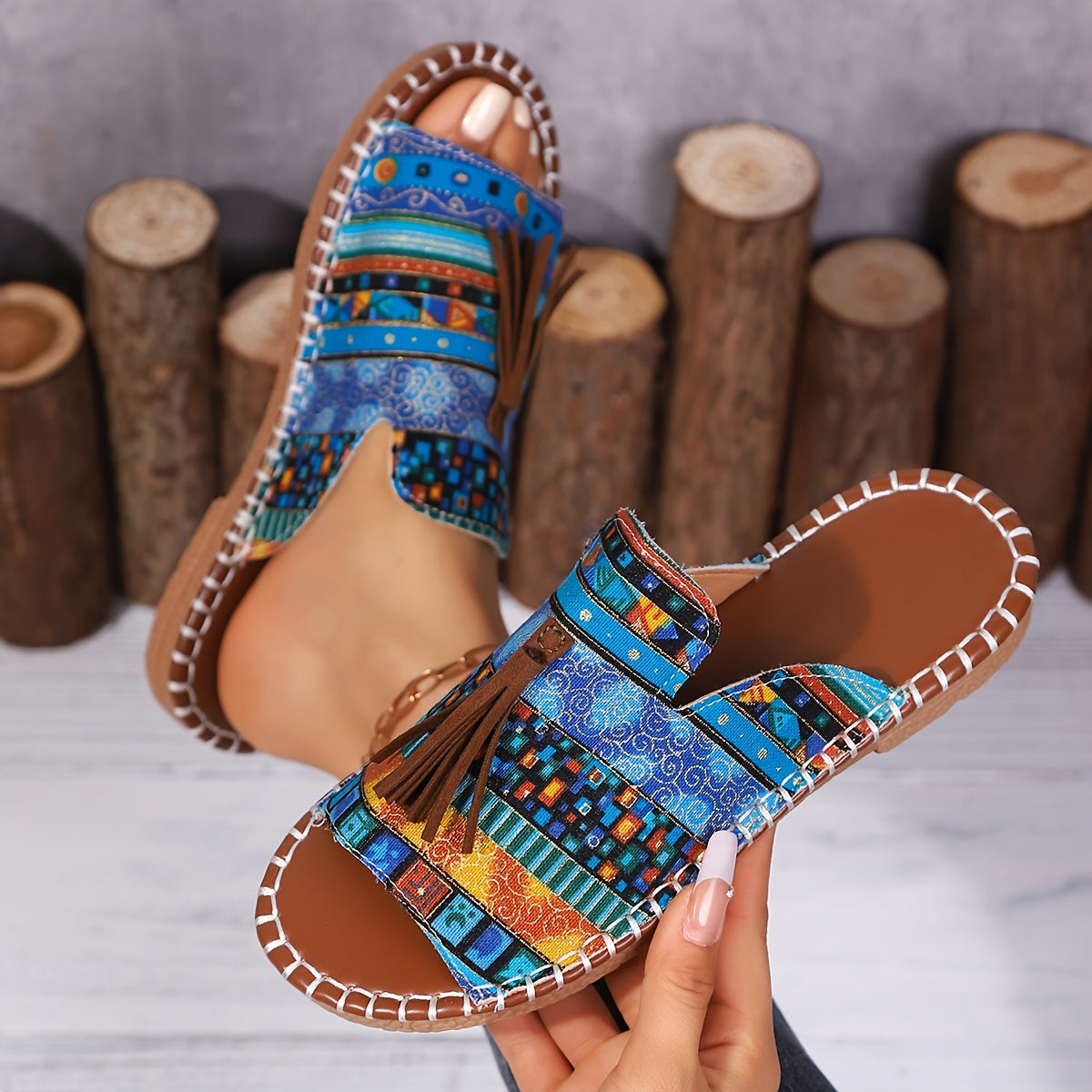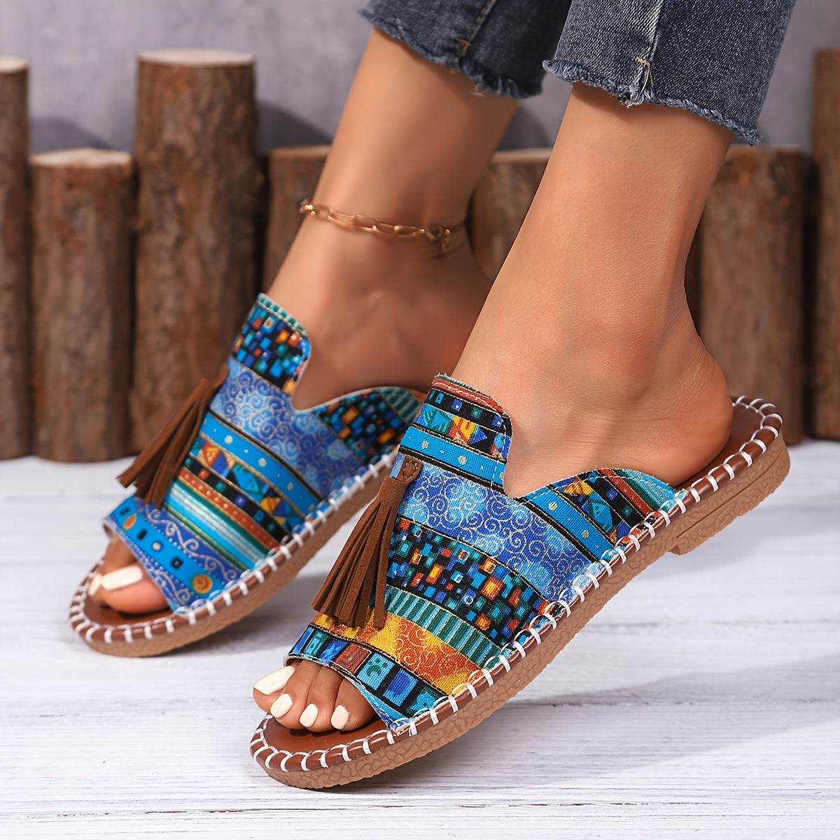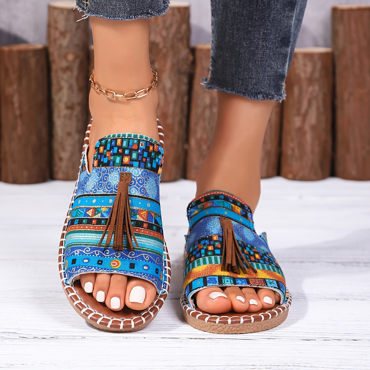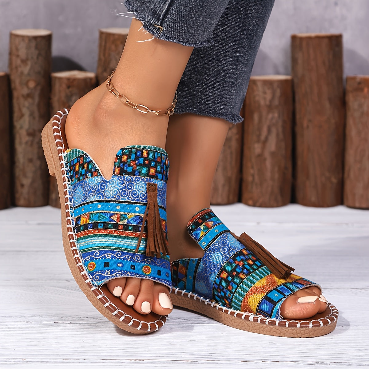 Ayollar uchun Bohemia tekis sandalki, etnik tassel, sirpanchiq bo'lmagan rezina, kundalik plyaj
