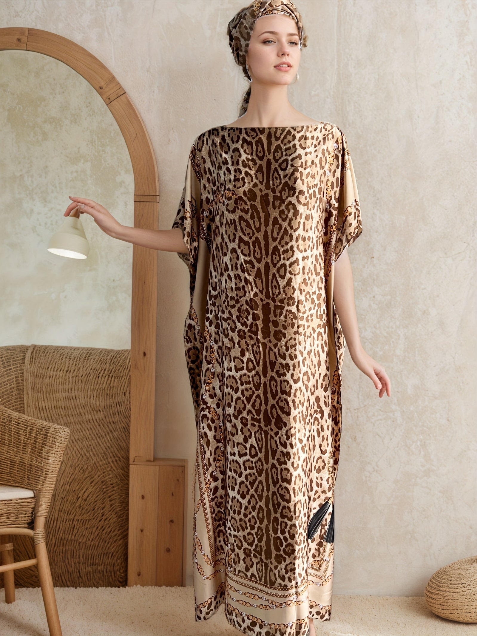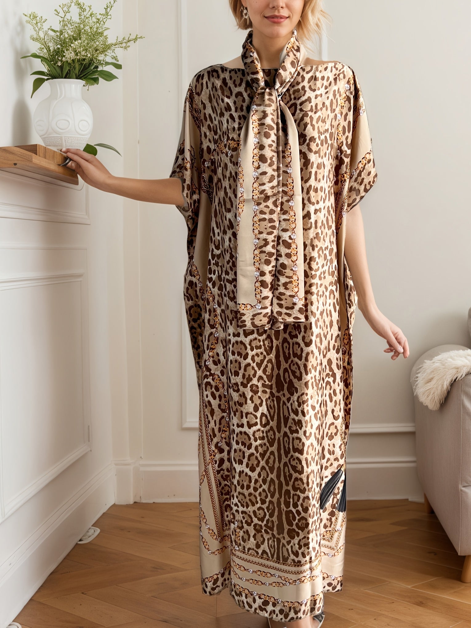 Ayollar uchun katta o'lchamli ikki rangli leopard bosimi bilan turk kaftan kiyi va sharf