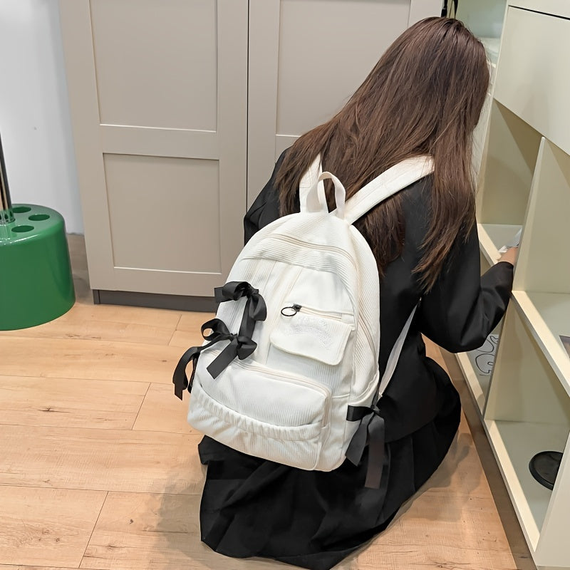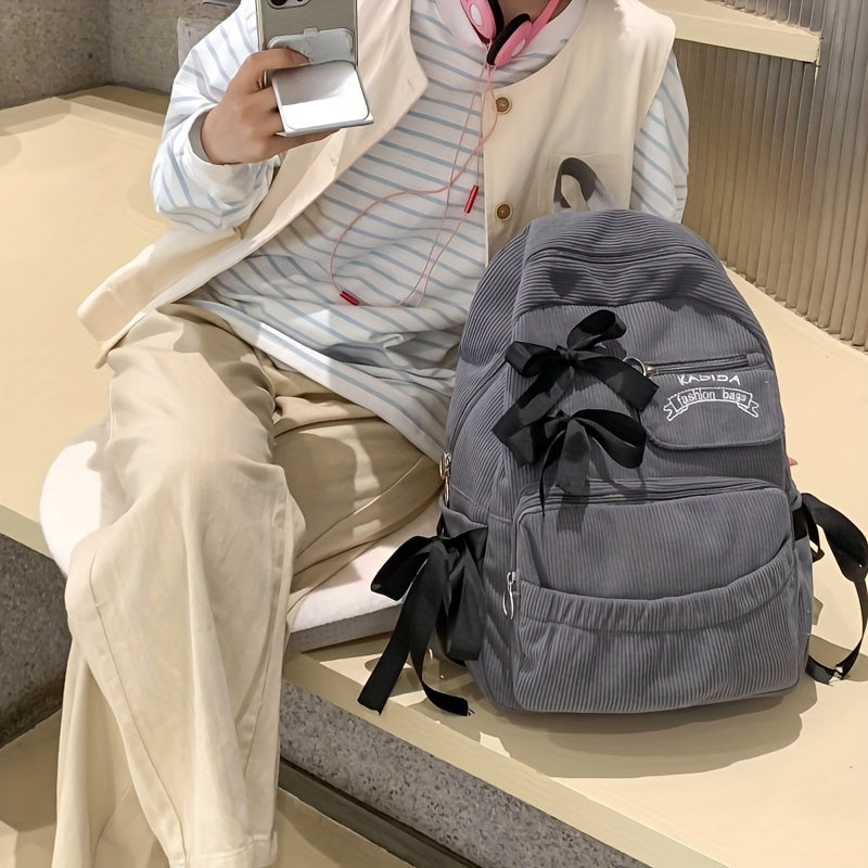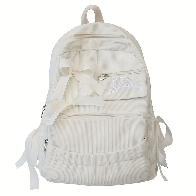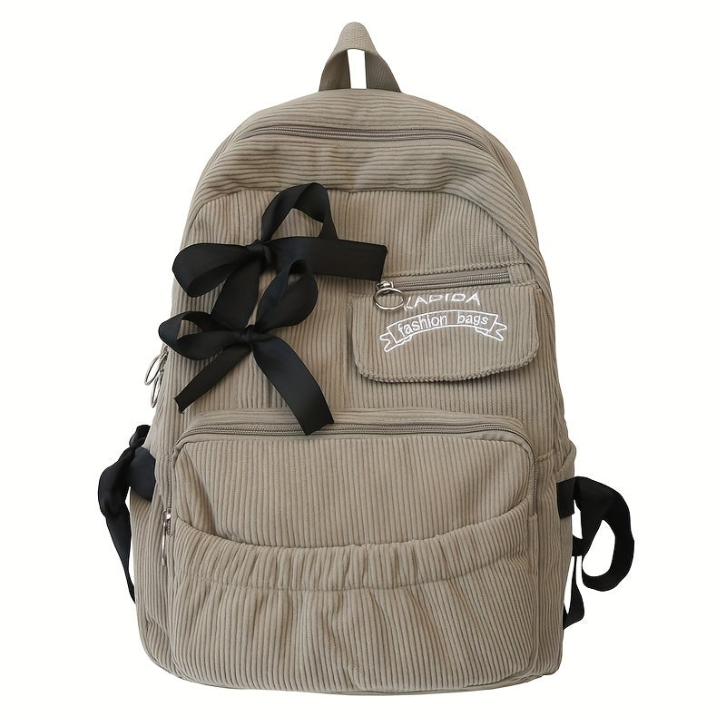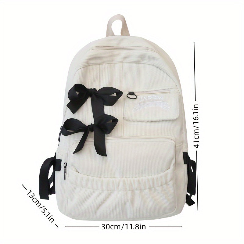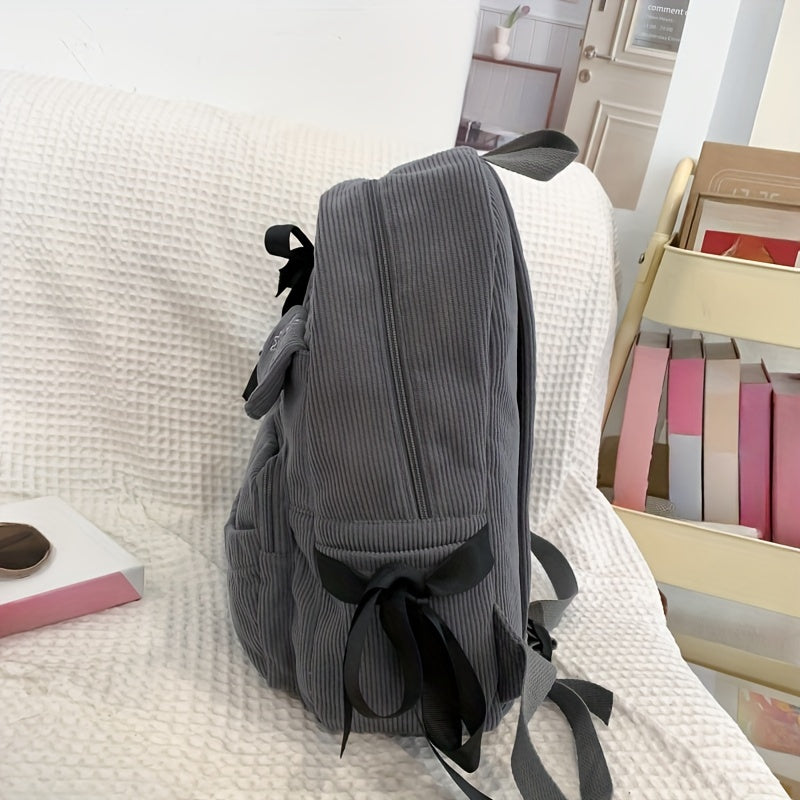 Ayollar uchun 1 dona korduroy bowknot ruksak, shirin uslub, chiziqli dizayn, sozlanadigan yelka tasmalari, noutbuk bo'limi, zip yopilishi, polyester astar, qo'l yuvish/quruq tozalash - Kundalik tasodifiy