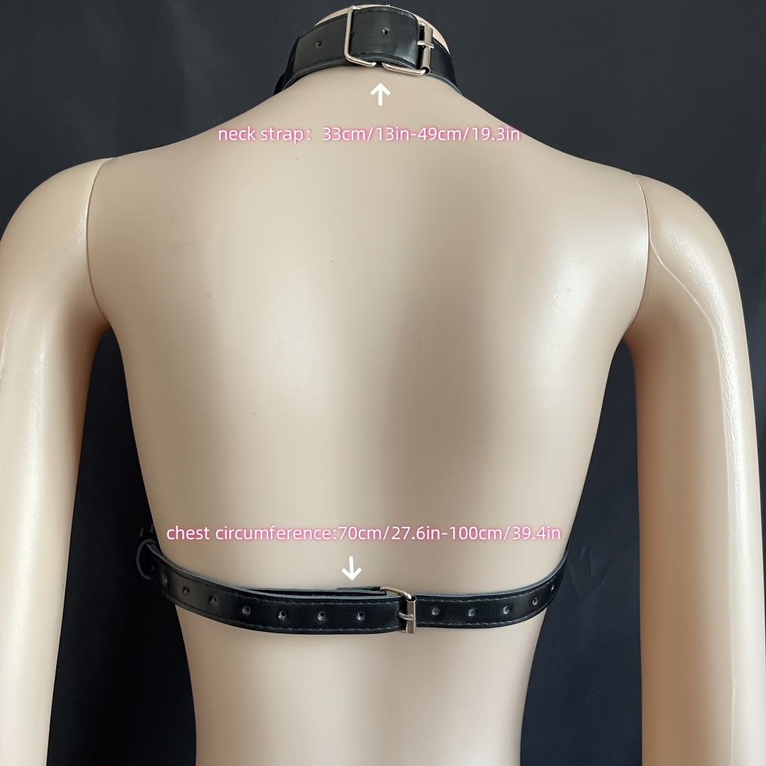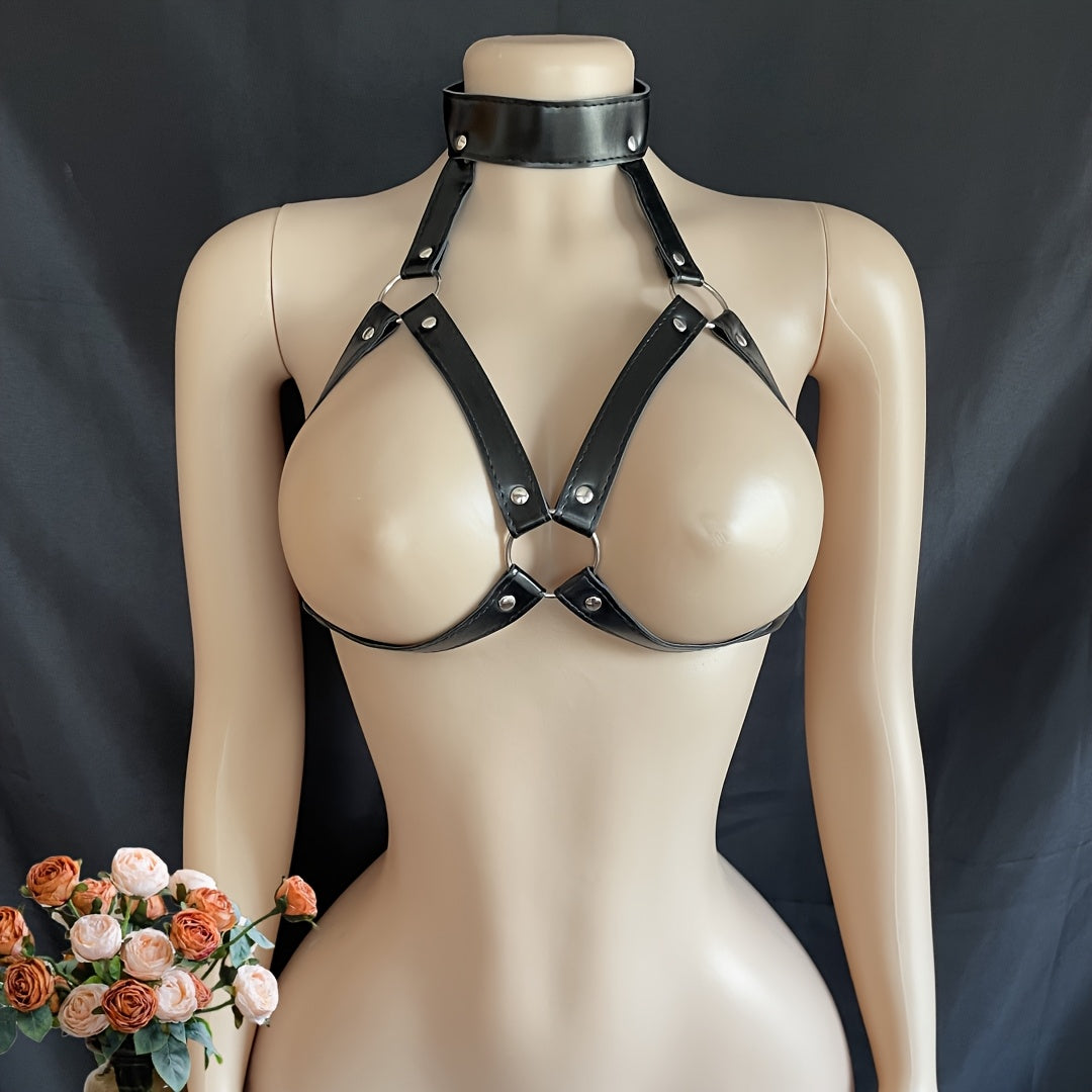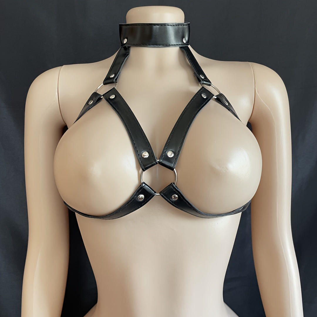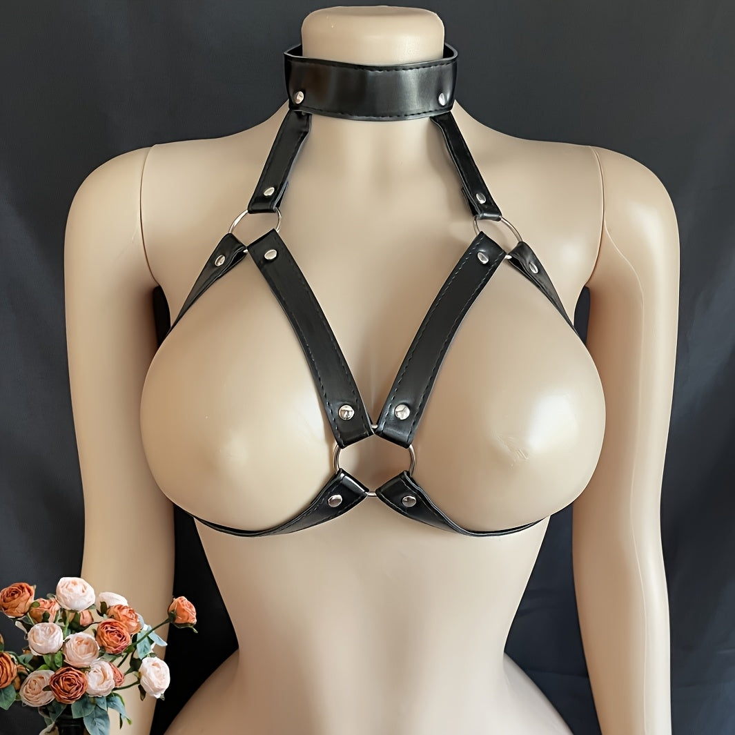 Ayollar uchun sozlanadigan bog‘lovchi qafasli bo‘yinbog‘i va ko‘krak qafasi, qora charm ko‘rinishida, metall halqalar bilan