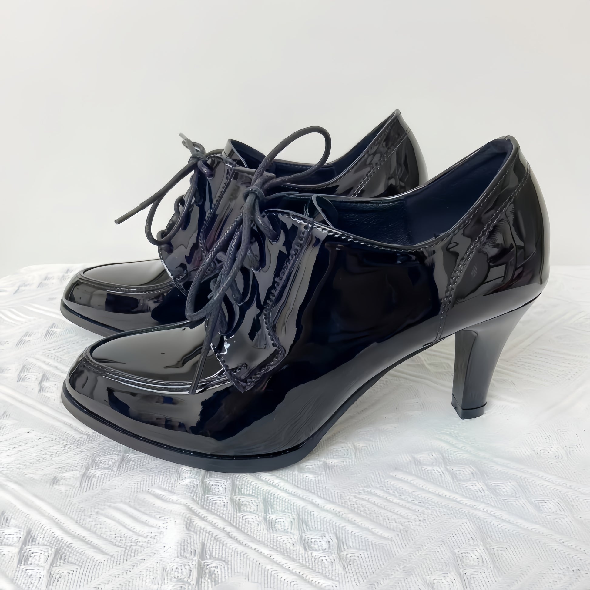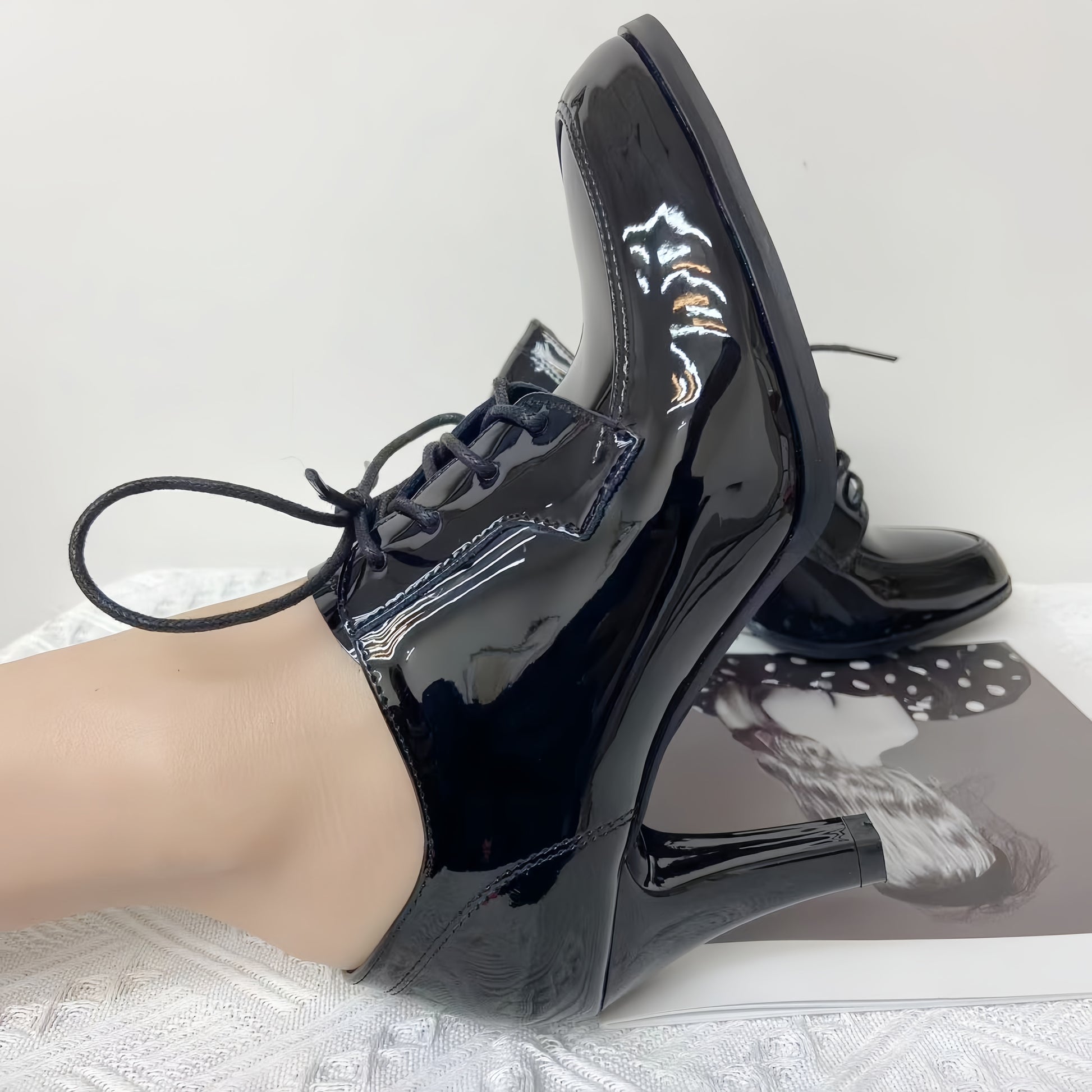 Women's Black Glossy Synthetic Pointed Toe High Block Heel Ankle Boots