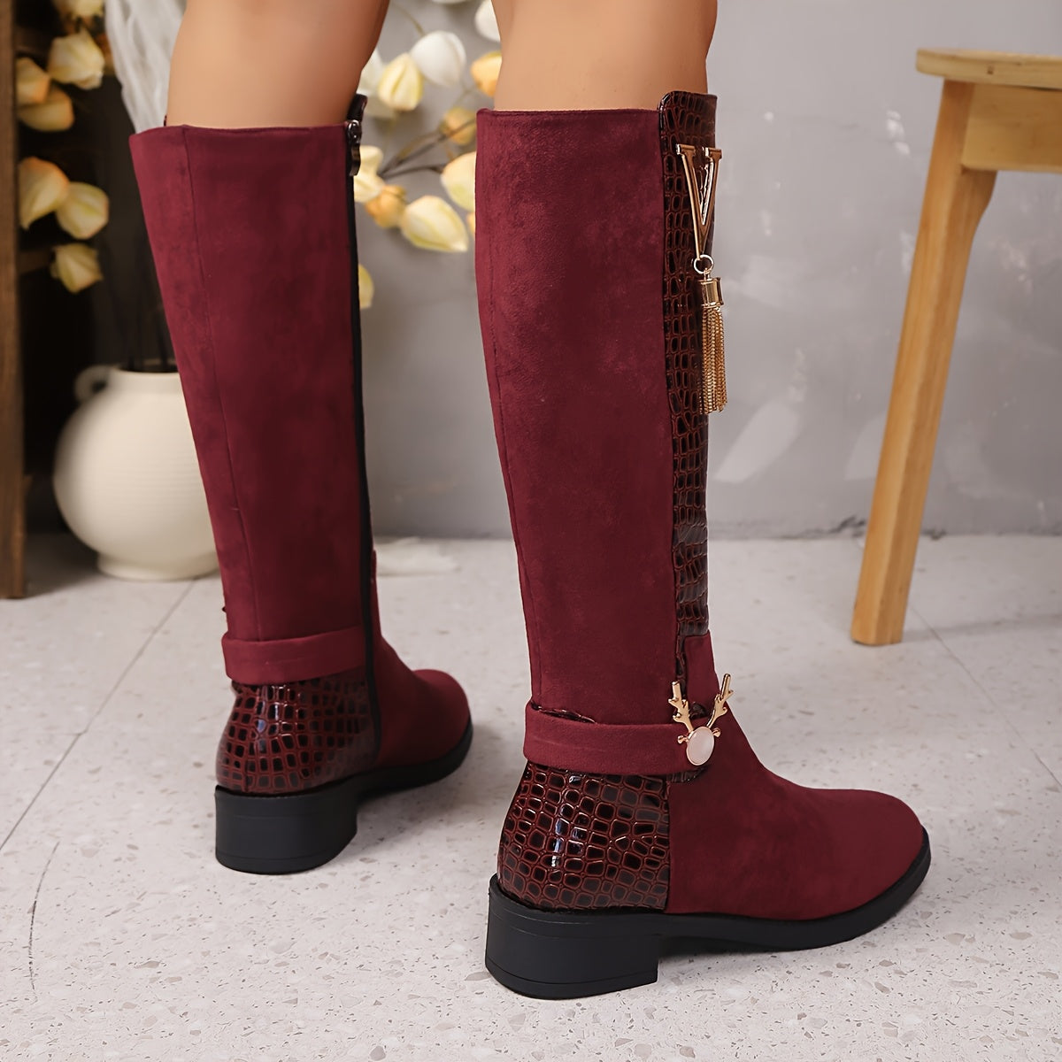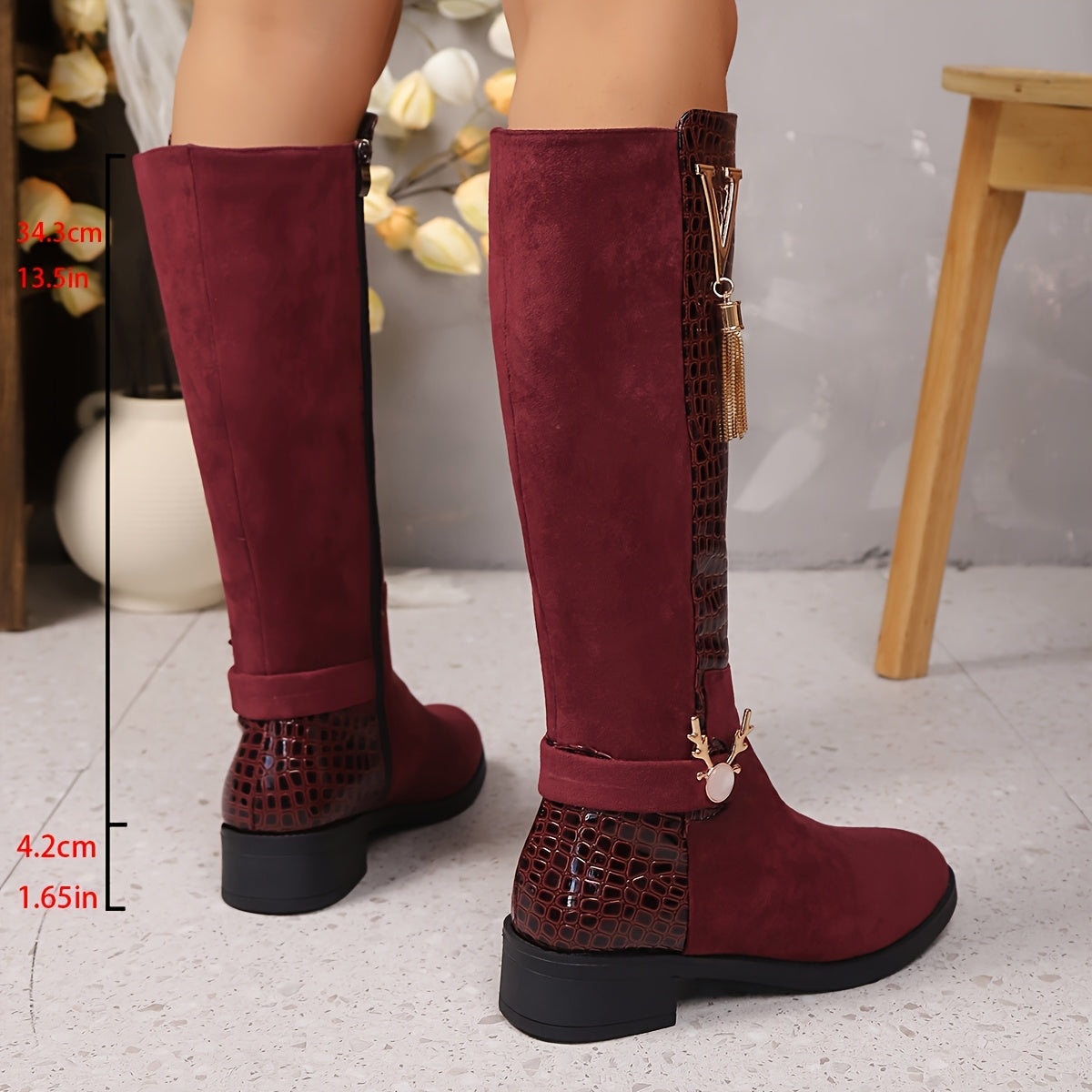 Ayollar uchun Burgundy yuqori bo‘yi sun’iy poyabzal, oltin V-zanjirli blok poyafzal bilan