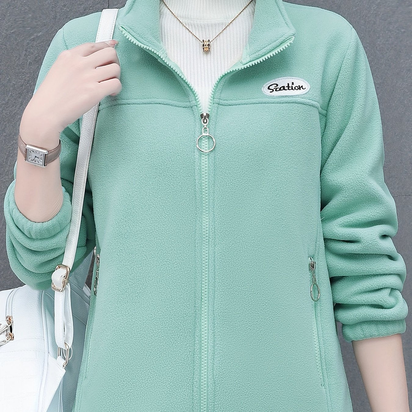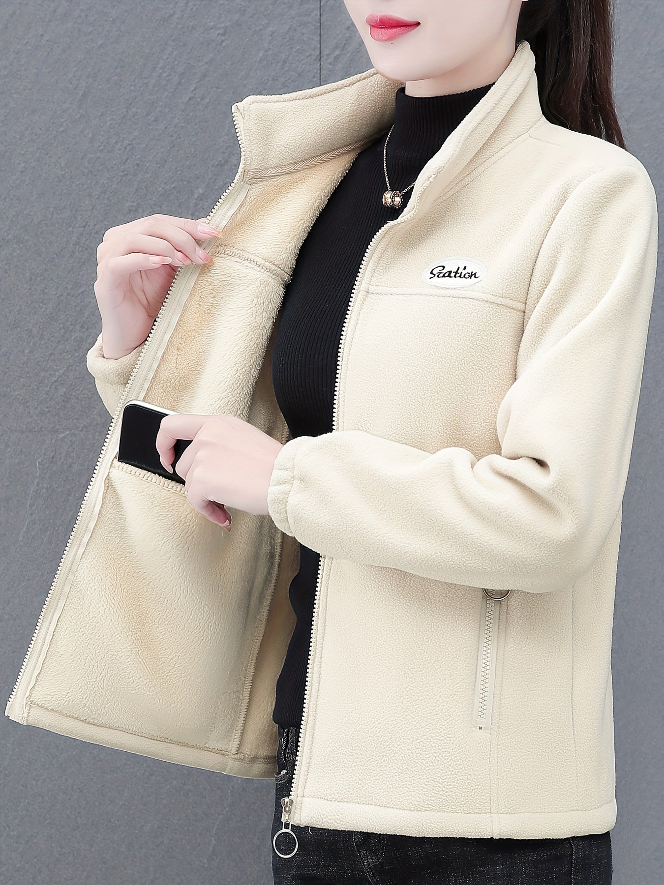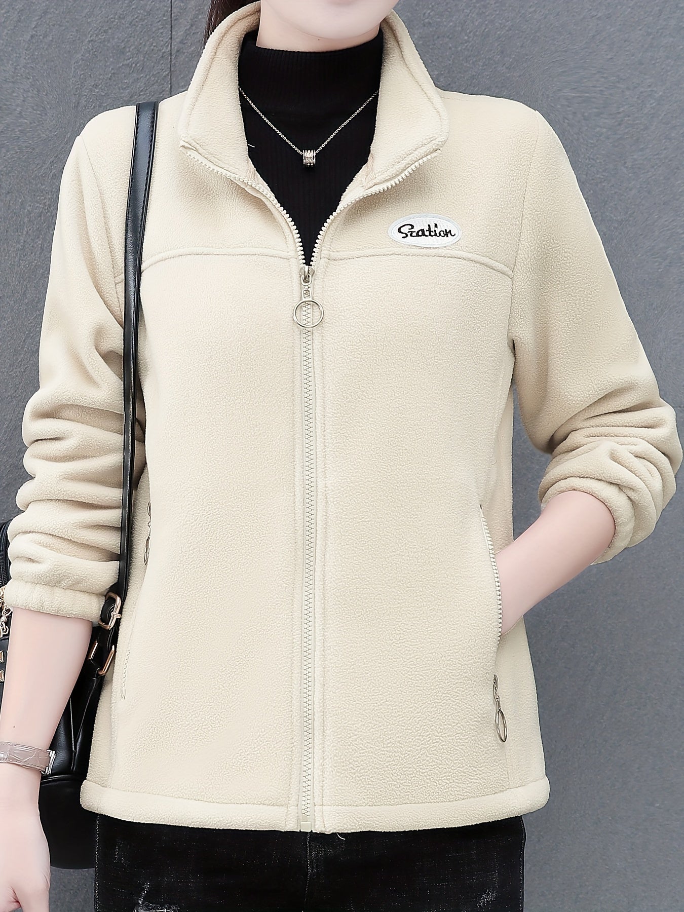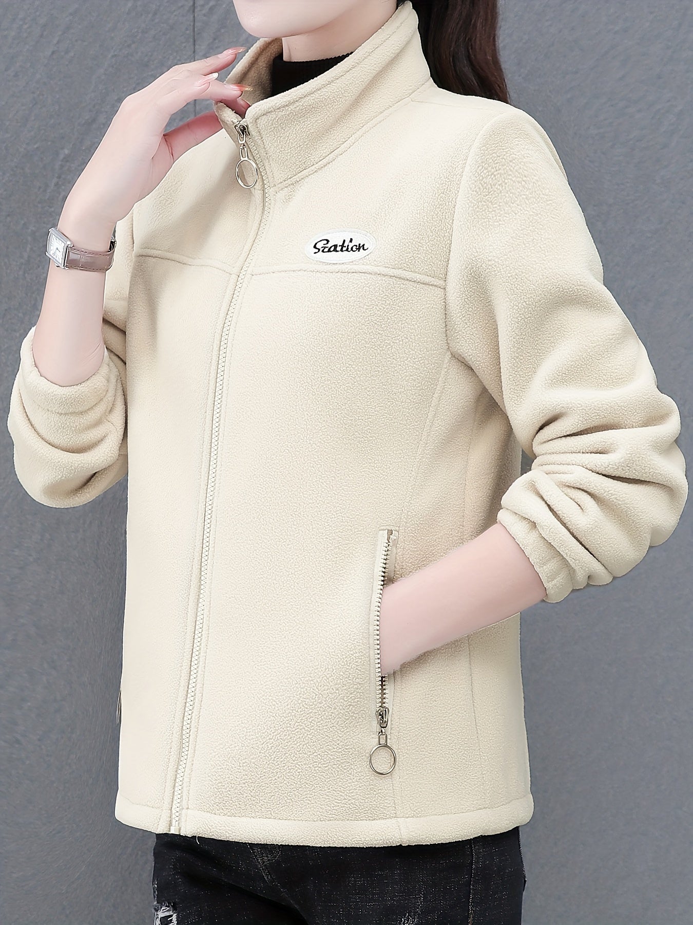 Ayollar uchun tasodifiy flis jakketi, alfavit naqshi, turli xil yenglar, oddiy moslashuv, kattalashtirilgan va zipper tafsiloti.