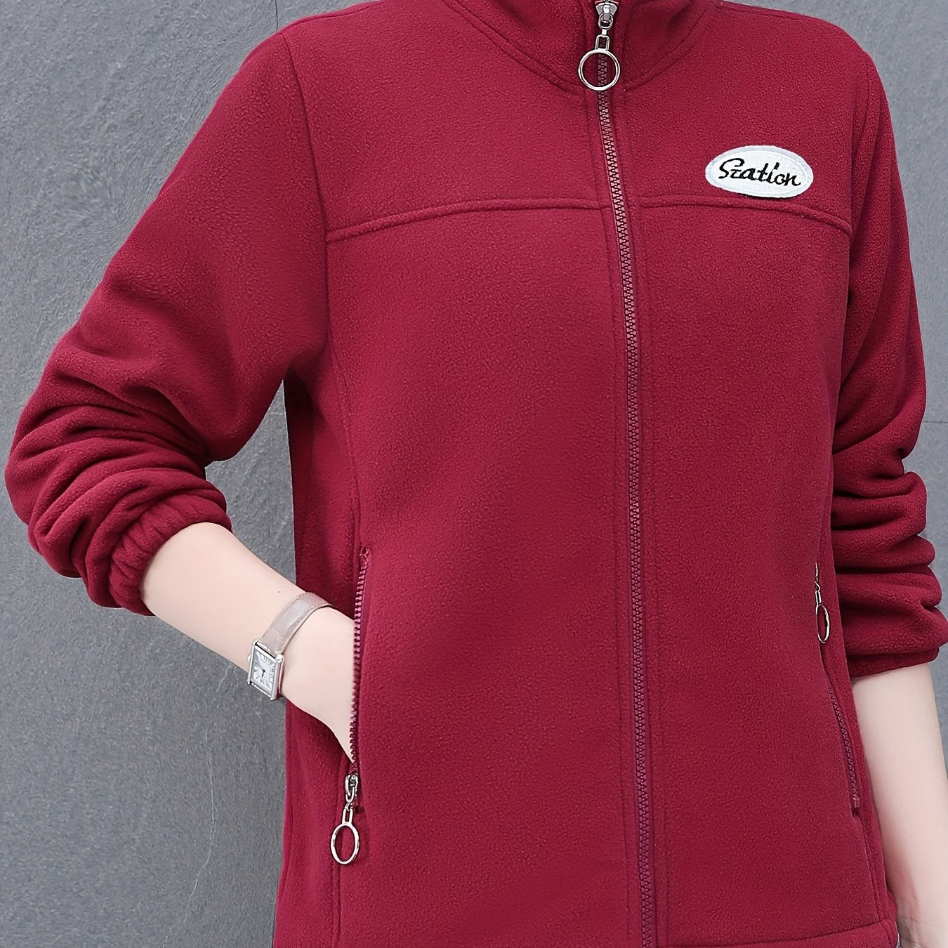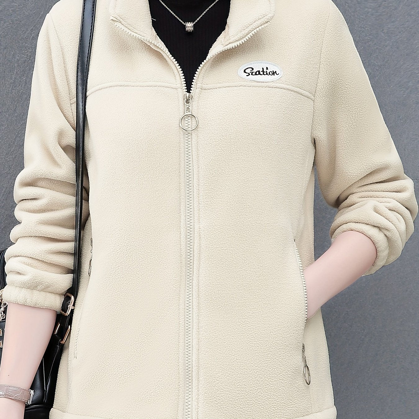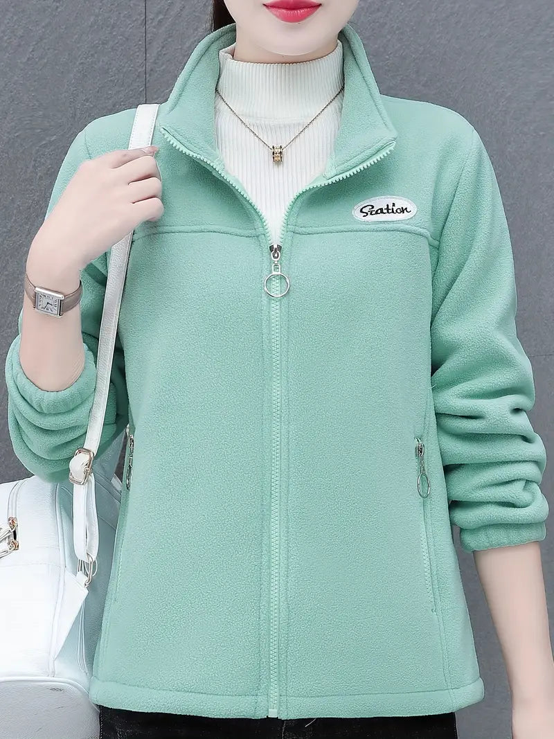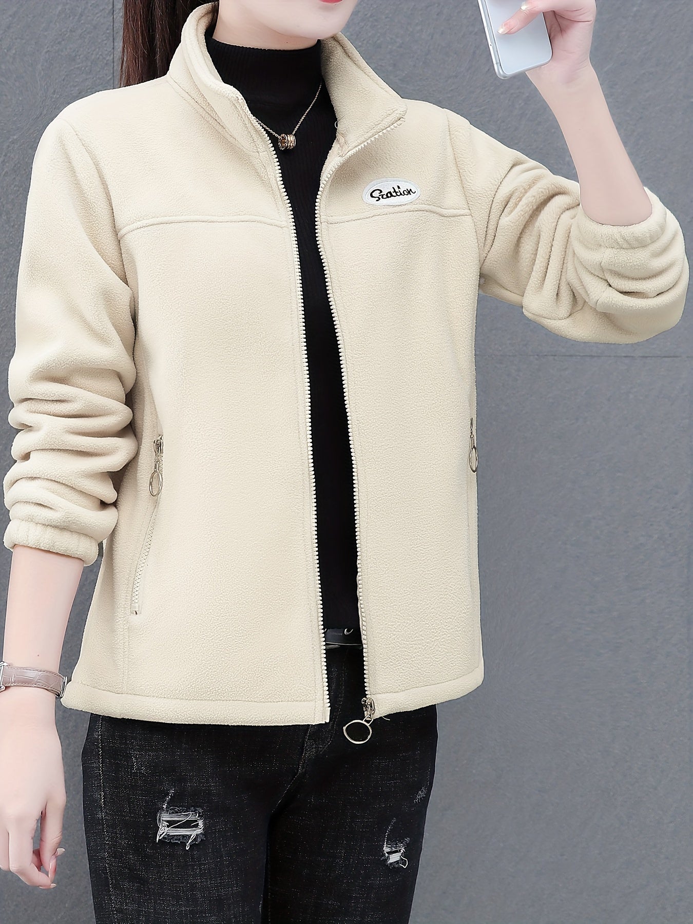 Ayollar uchun tasodifiy flis jakketi, alfavit naqshi, turli xil yenglar, oddiy moslashuv, kattalashtirilgan va zipper tafsiloti.
