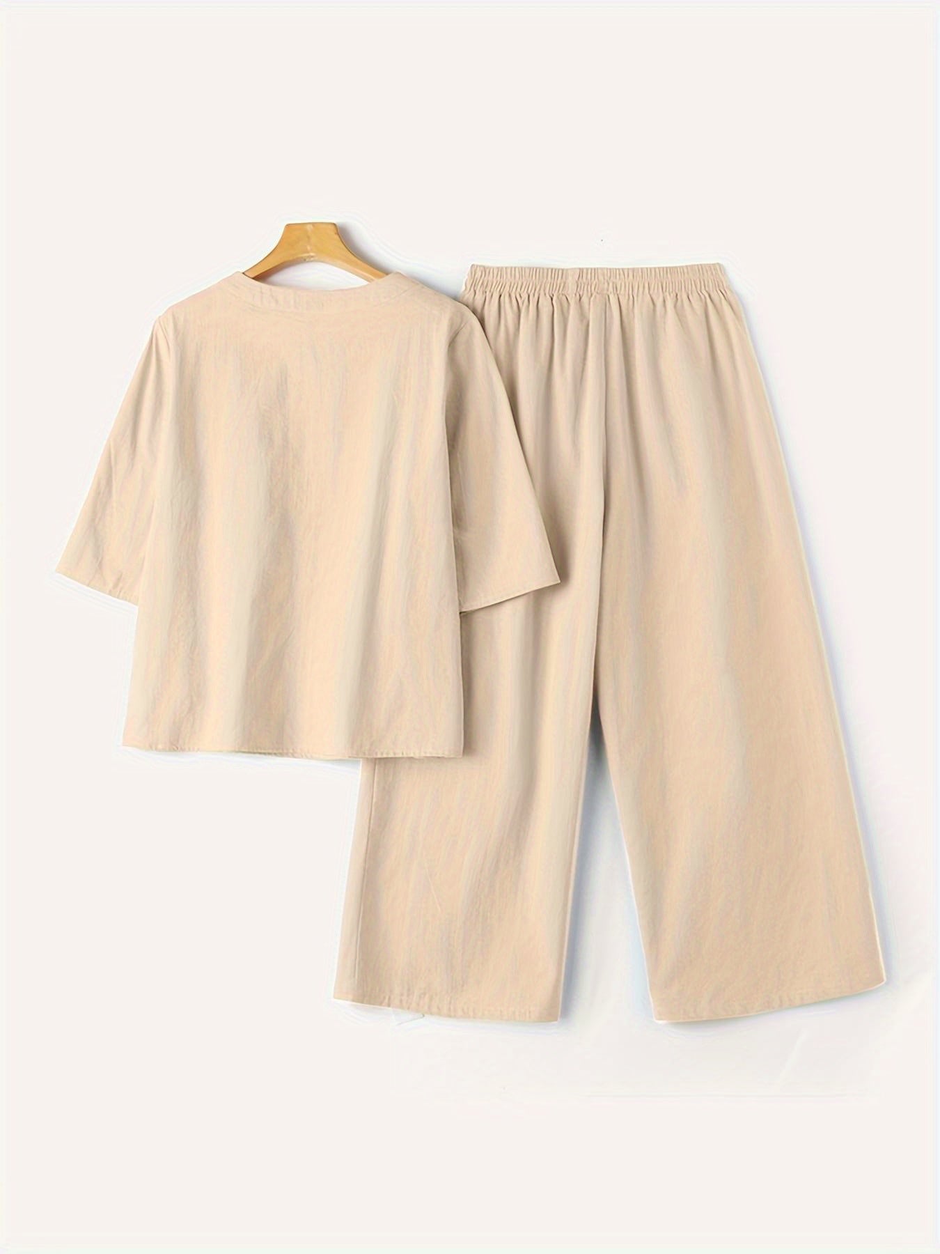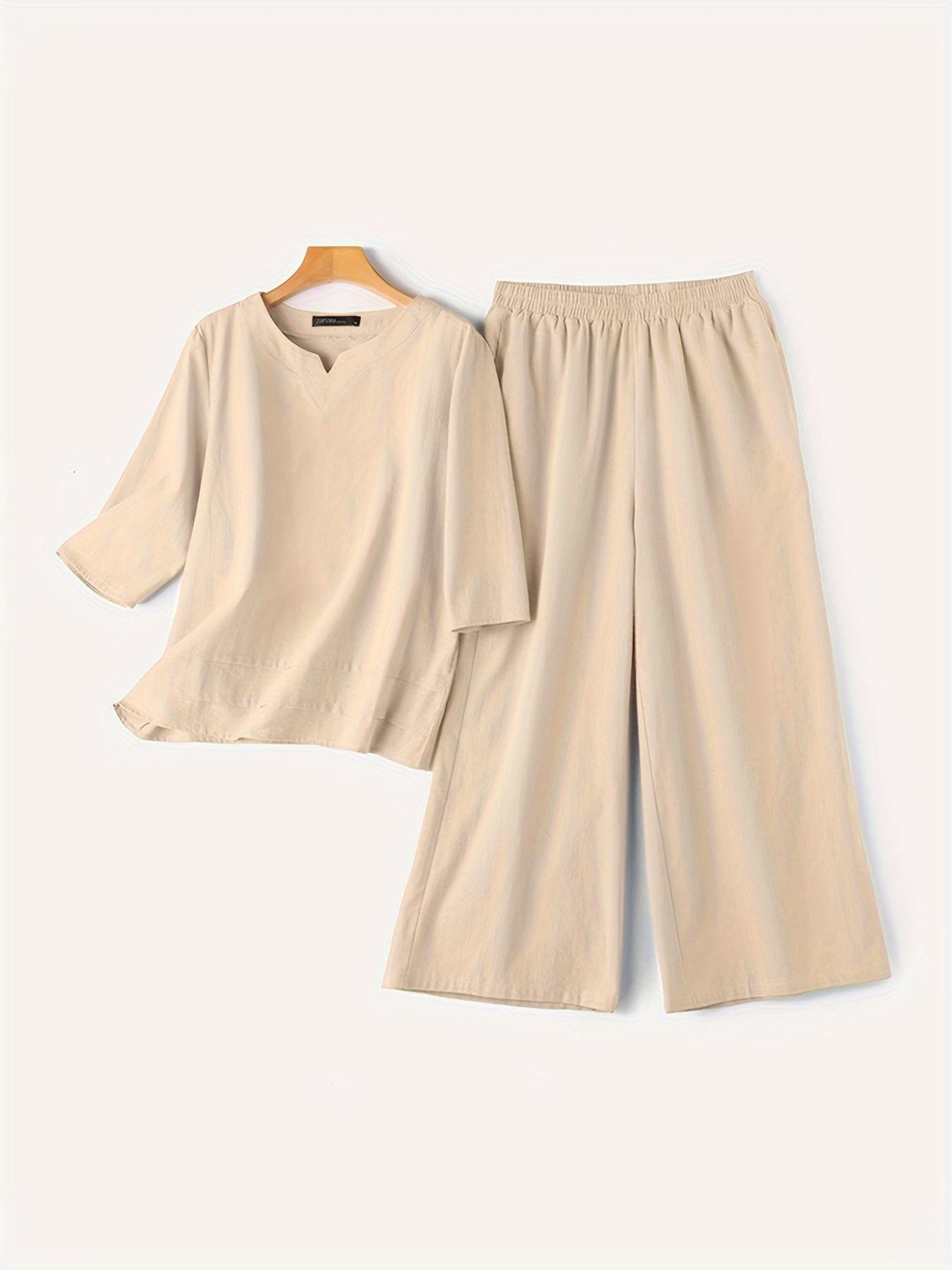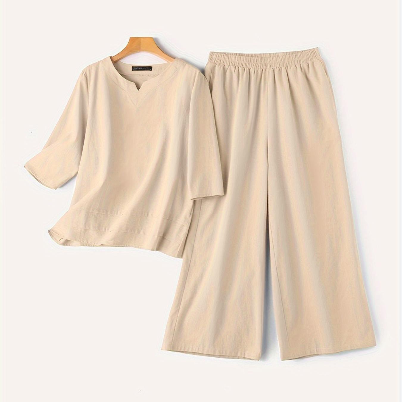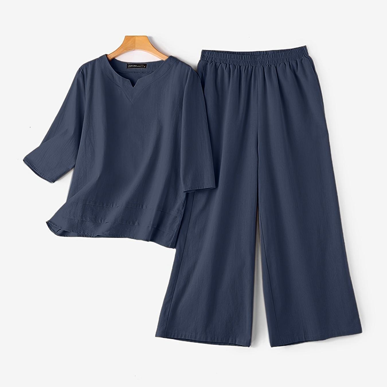 Ayollar uchun tasodifiy V-shaklidagi yuqori qism, 3/4 uzunlikdagi yenglar va keng oyoq shimlar to'plami, bir xil rang, cho'zilmaydigan mato, havo o'tkazuvchi, elastik belga ega shimlar, katta o'lcham.