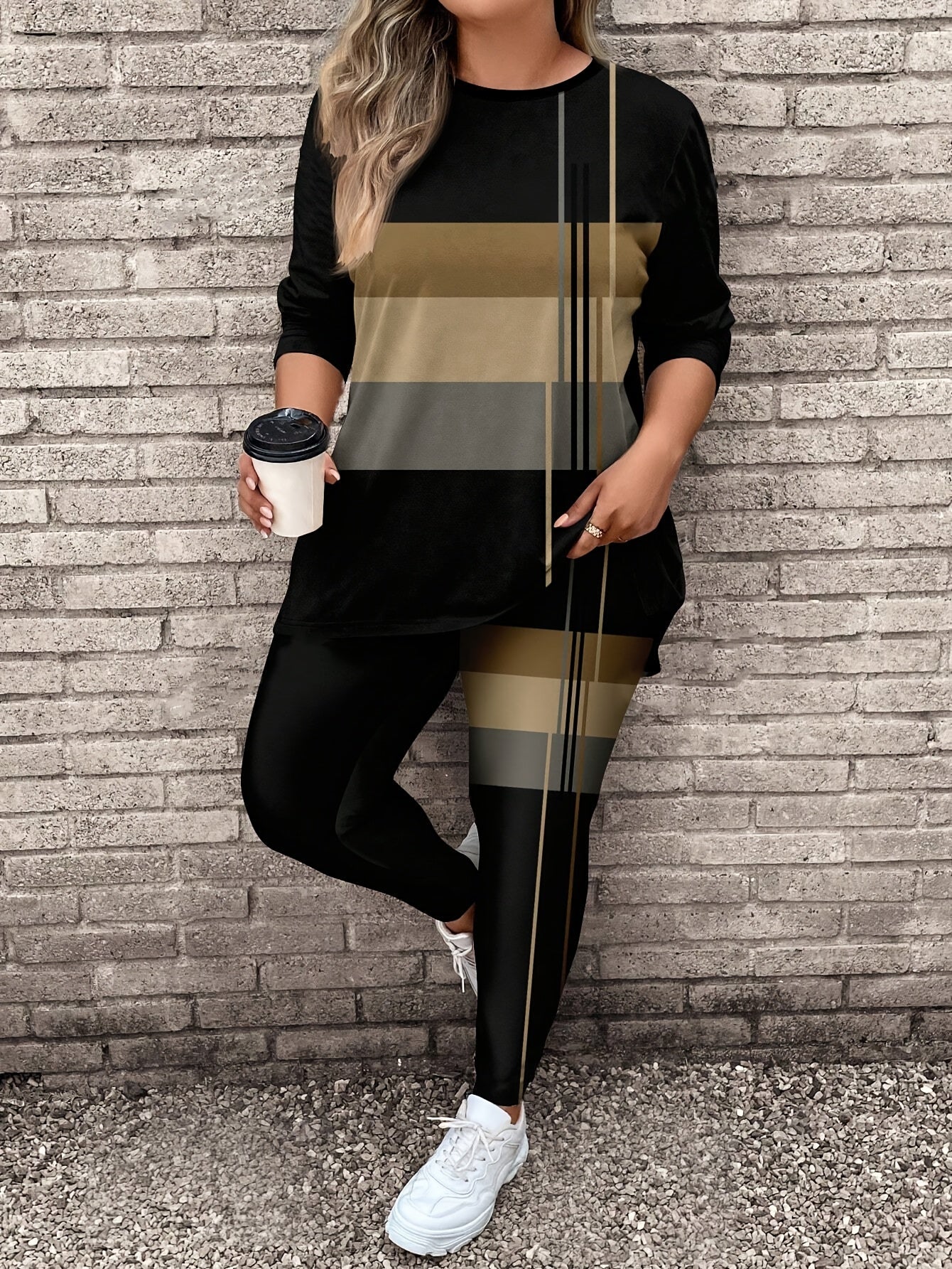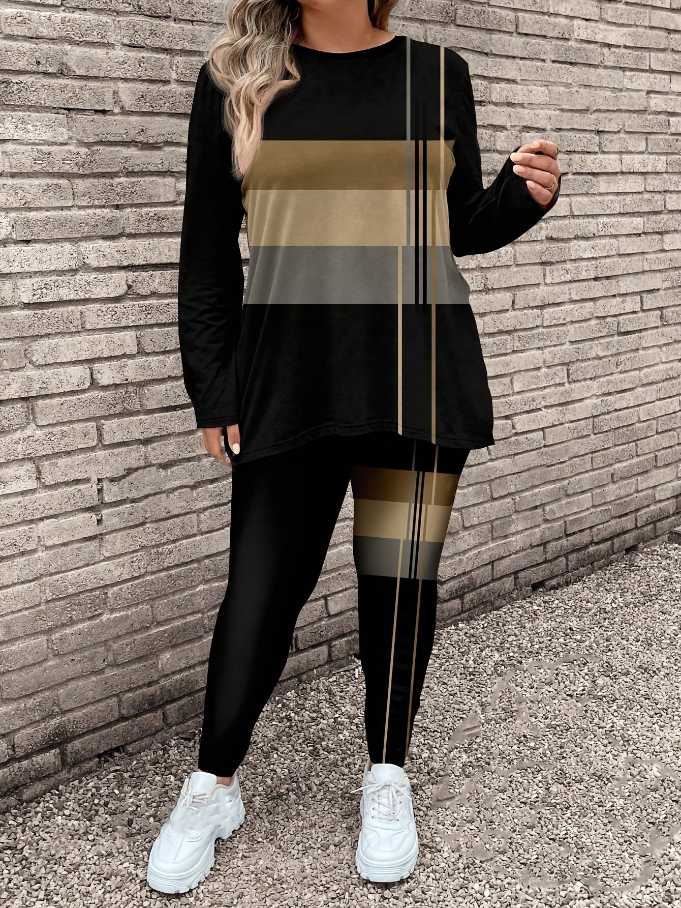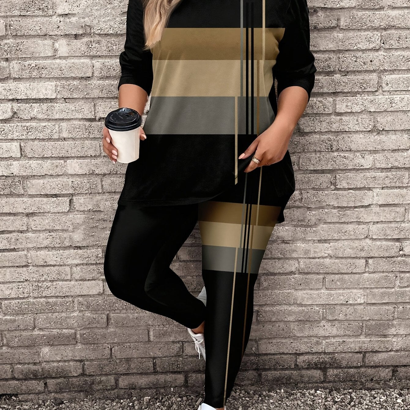 Ayollar uchun chiroyli 2 ta faoliyat kiyimlari to'plami, chiziqli rangli blokli yuqori va qora sport shimlar bilan. Qulay, shaffof bo'lmagan polyester materialdan tayyorlangan. Mashinada yuvish mumkin.