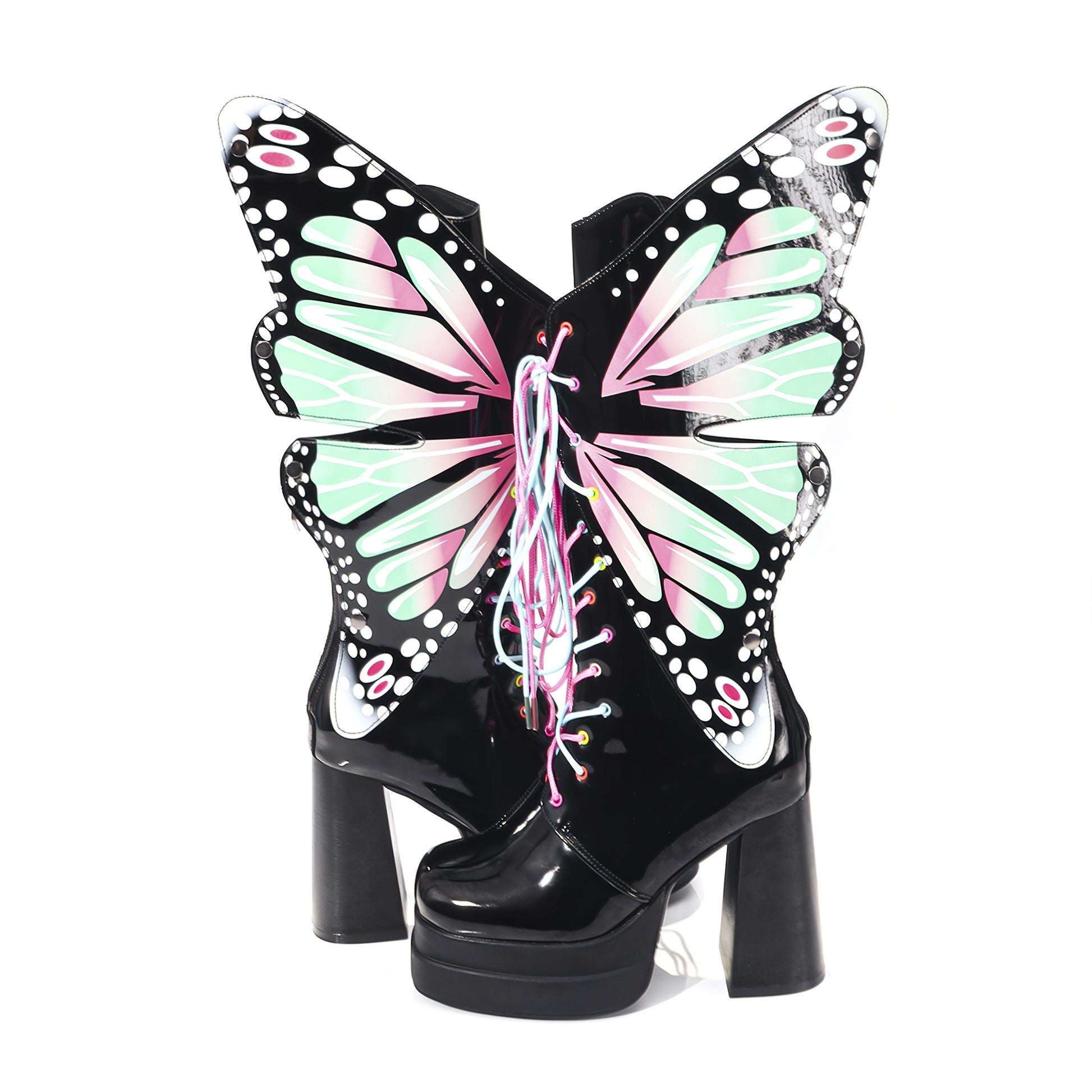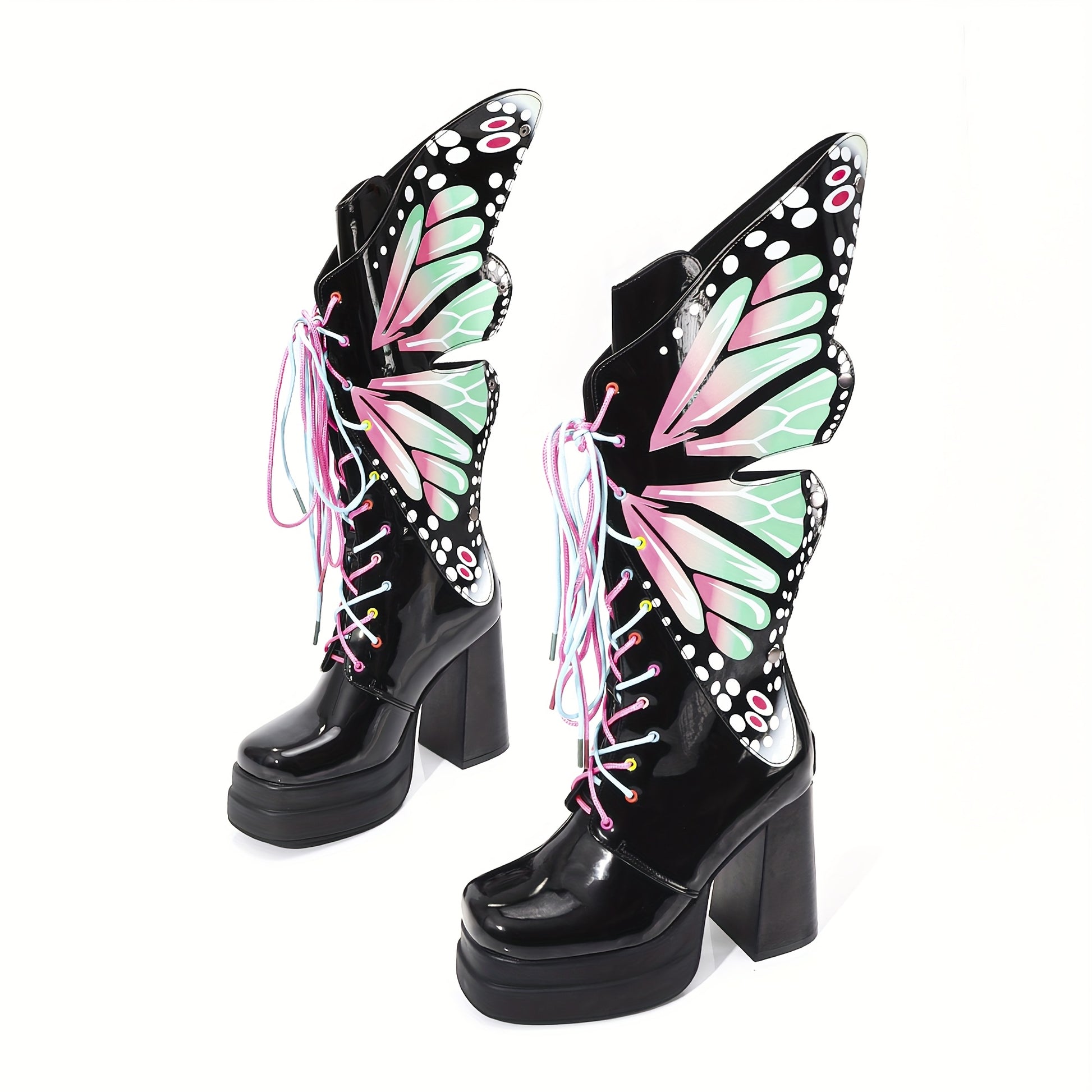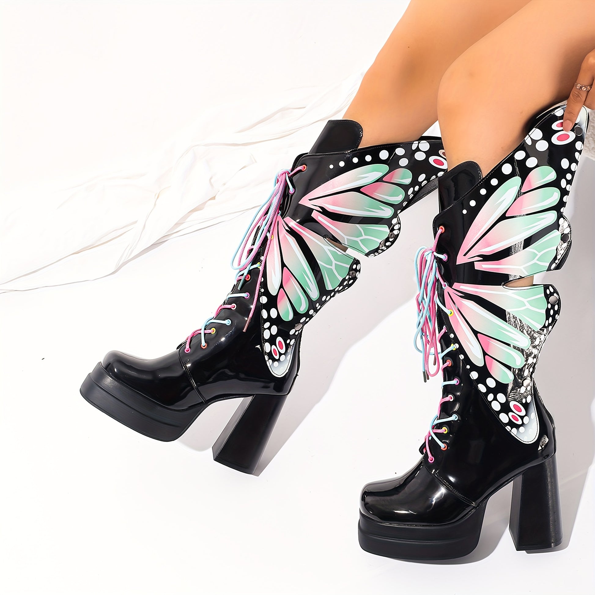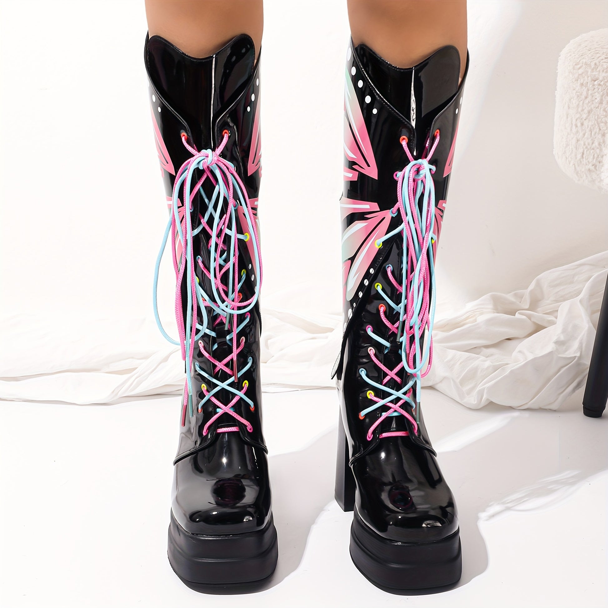 Ayollar uchun qalin platforma botinkalari, yaltiroq qora, gul naqshli, sirg‘alishga qarshi rezina