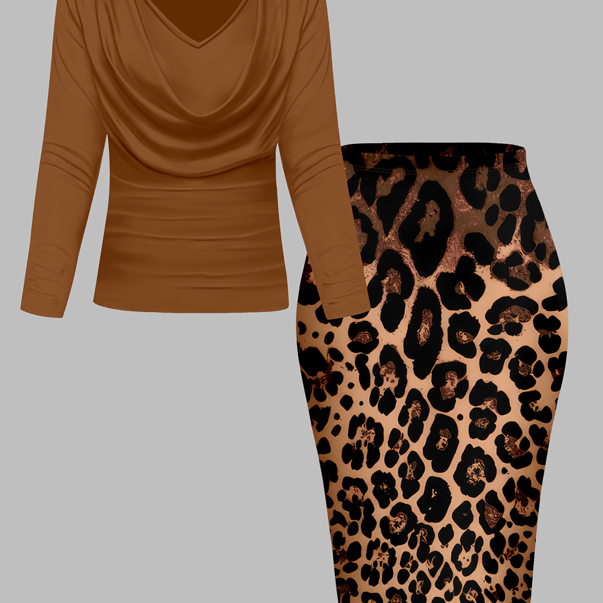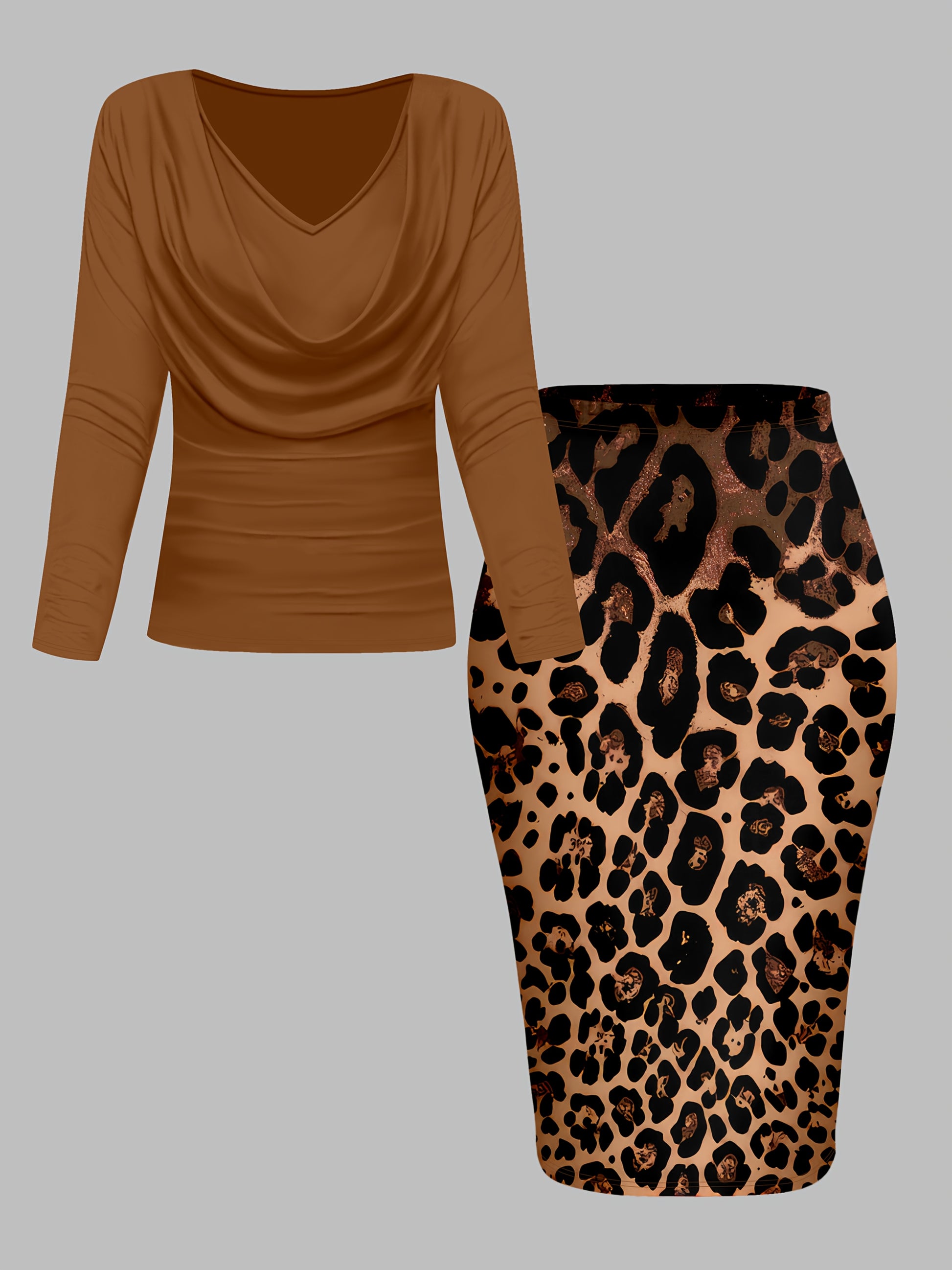 Ayollar uchun nafis 2 ta to'plam: V-shaklidagi uzun qo'lqonli bluzka va leopard naqshli qalam yubka, Polyester/Elastan aralashmasi, Zamonaviy har kuni kiyish uchun.