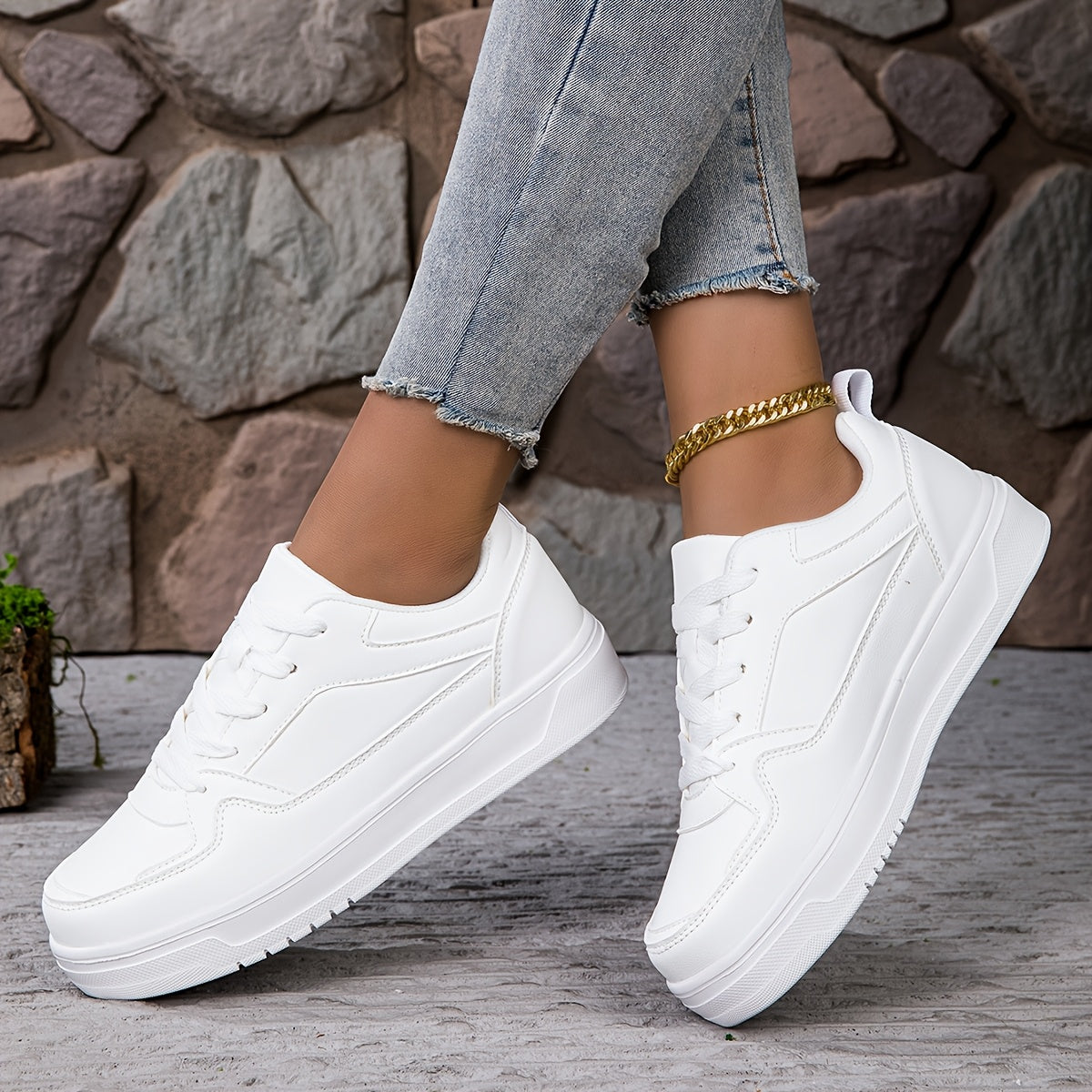 Women's Fashion Sneakers White Low-Top Lace-Up Casual Shoes