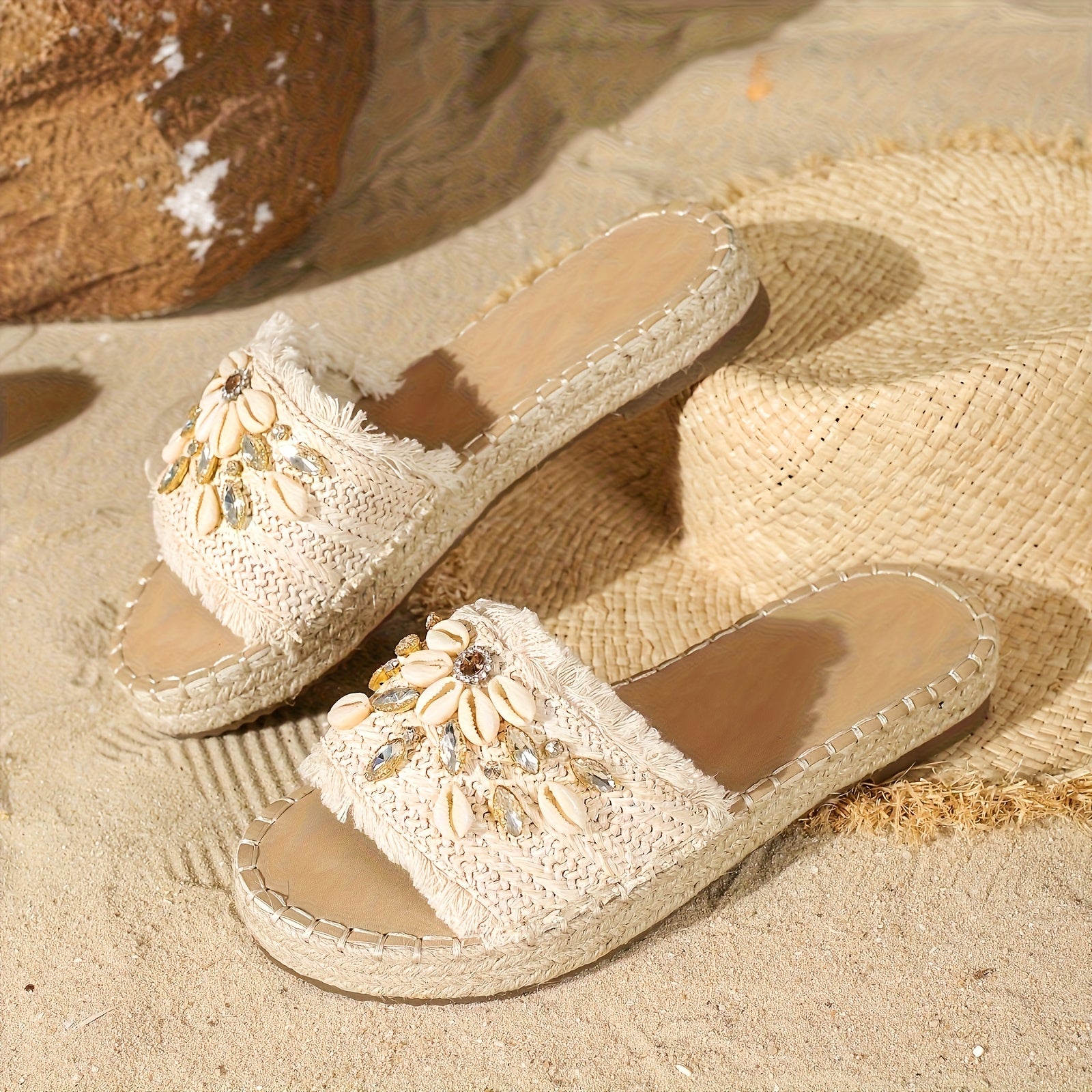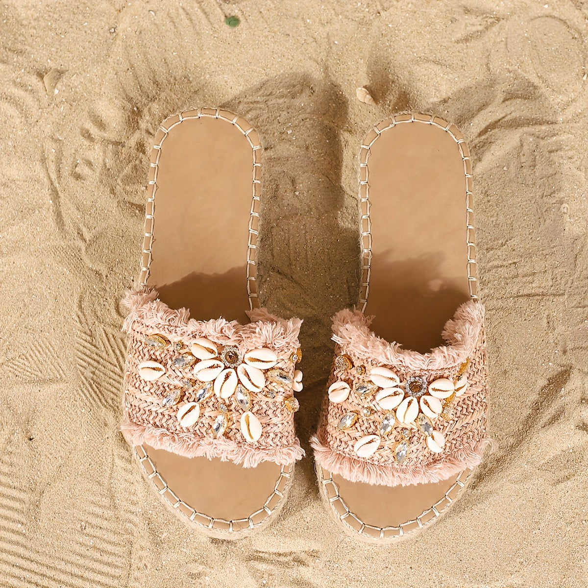 Ayollar uchun tekis sandallar, kundalik dam olish uslubi, dengiz qobig'i va gul bezaklari