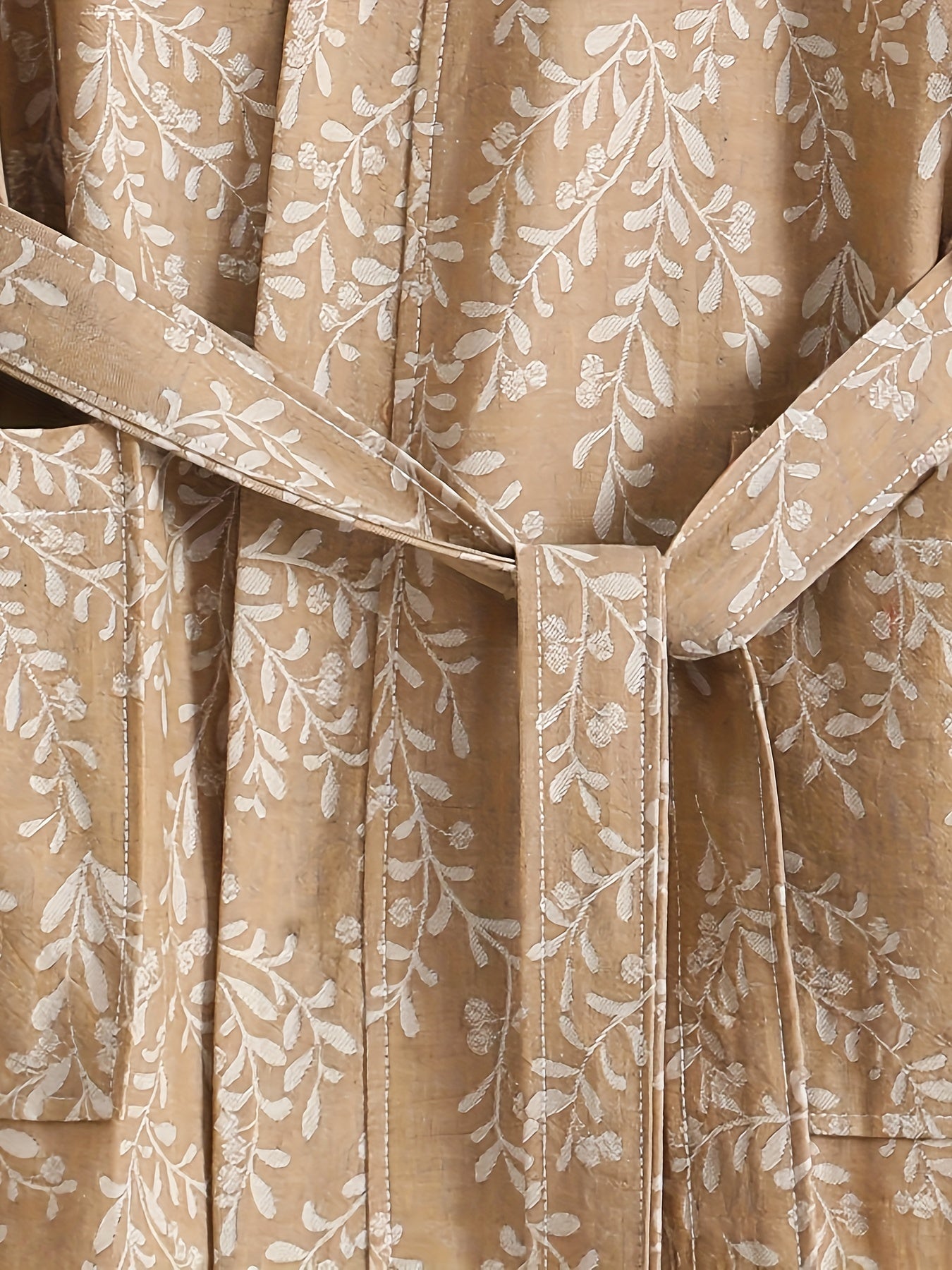 Ayollar uchun engil paxta jakard bathrobe, gullar naqshi bilan, tez quriydigan, namni o'zlashtiruvchi mato, uzun yenglar, v shaklidagi bo'yin, va bej/gul dizaynida kamar. Bahor, yoz va kuz uchun ideal.
