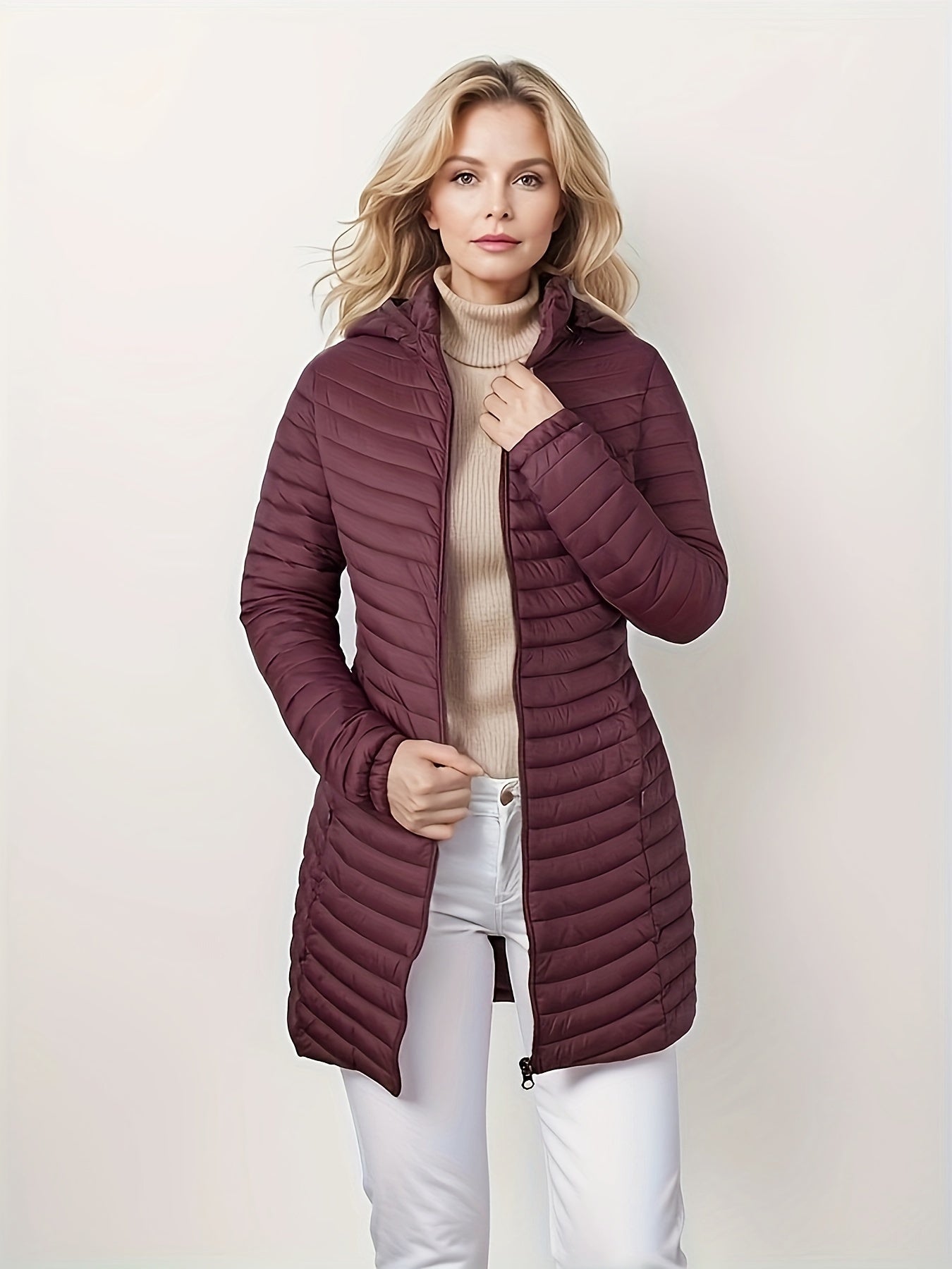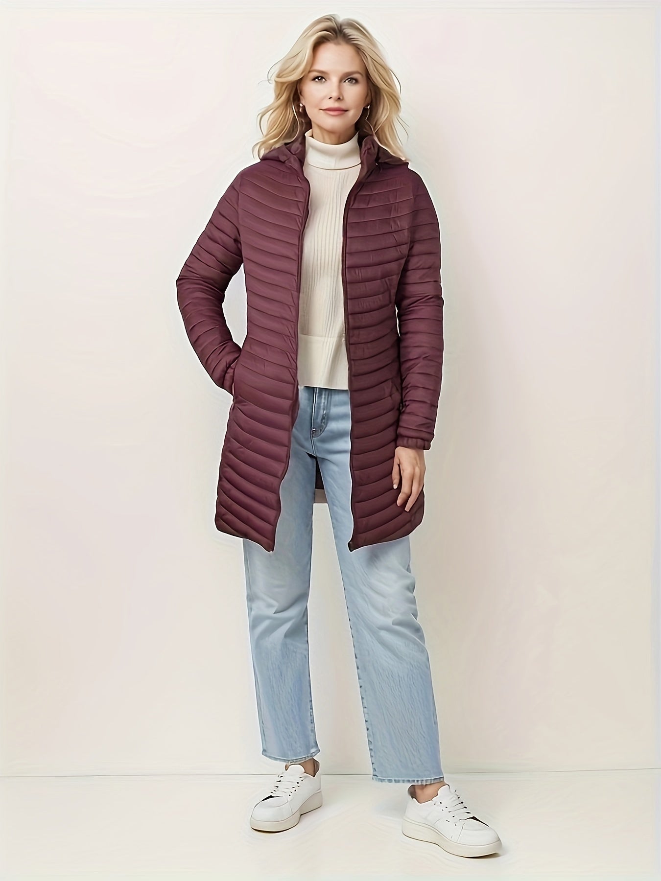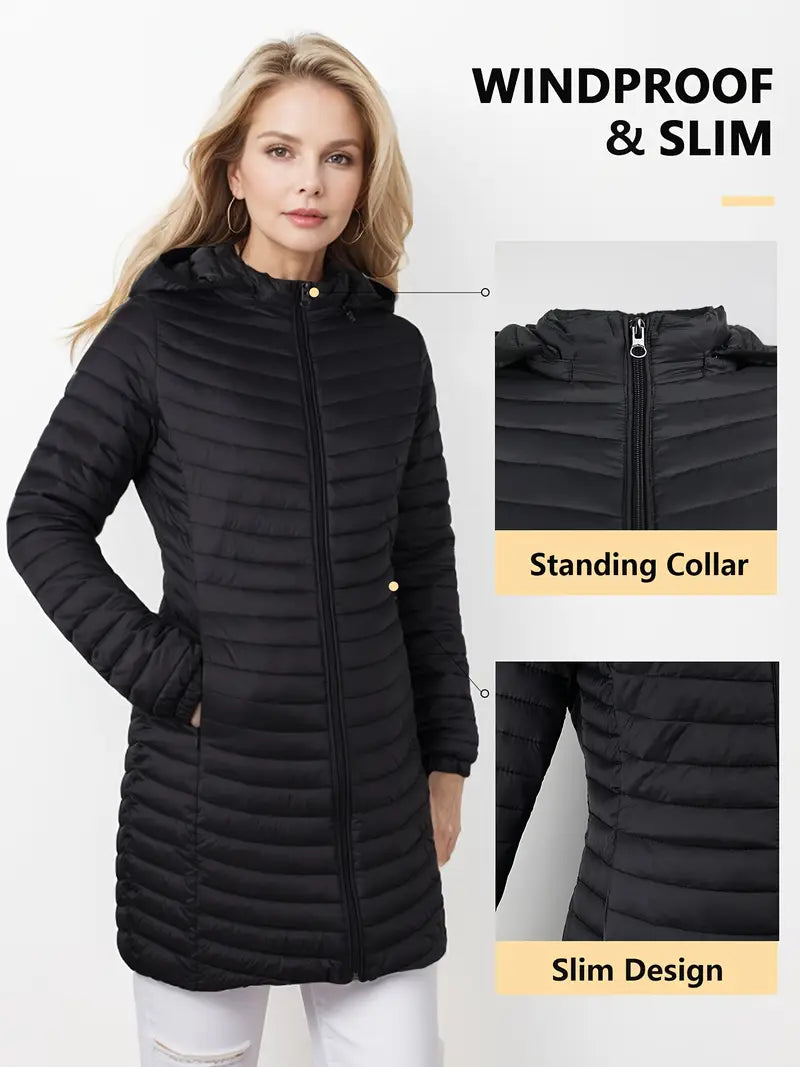 Ayollar uchun yengil pufferni palto, ajratiladigan kaput bilan, qishdagi qulaylik uchun mukammal.