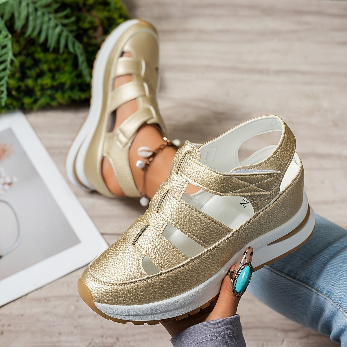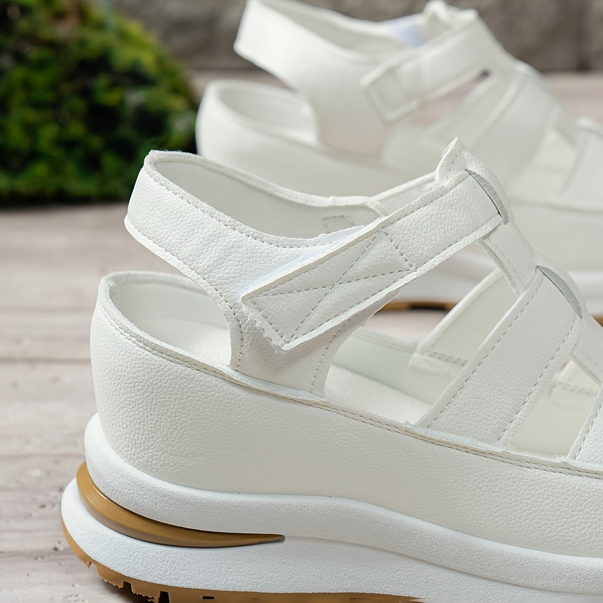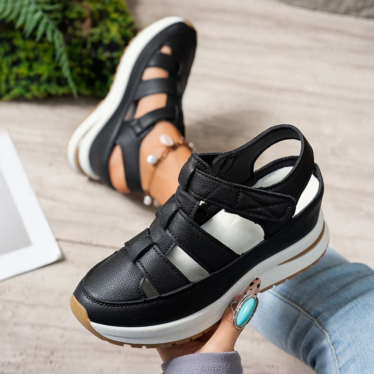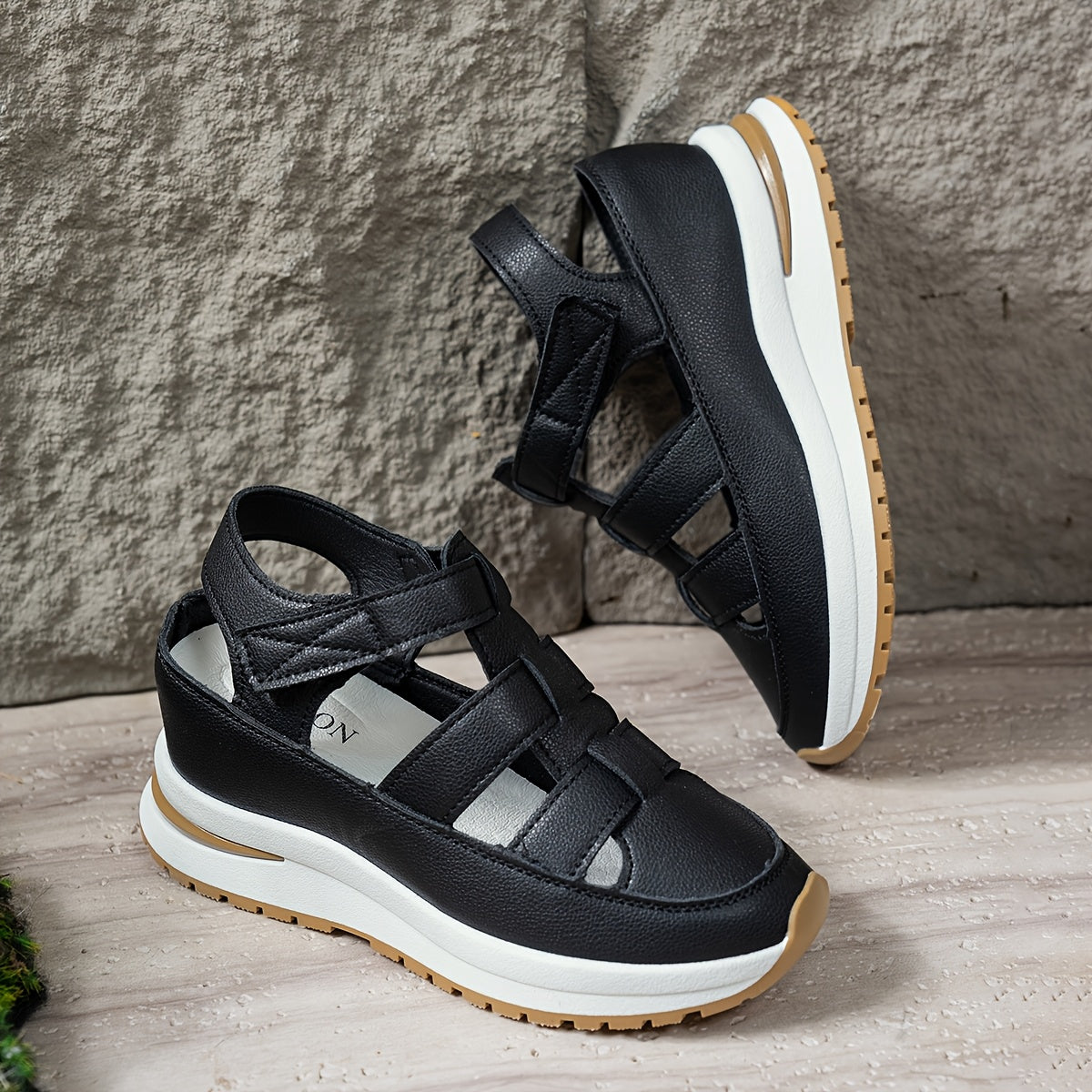 Ayollar uchun platforma sandallari, ko'rinmas balandlik oshiruvchi, sehrli lenta yopilishi, sun'iy charm ustki qismi va sirpanmaydigan kauchuk taglik.