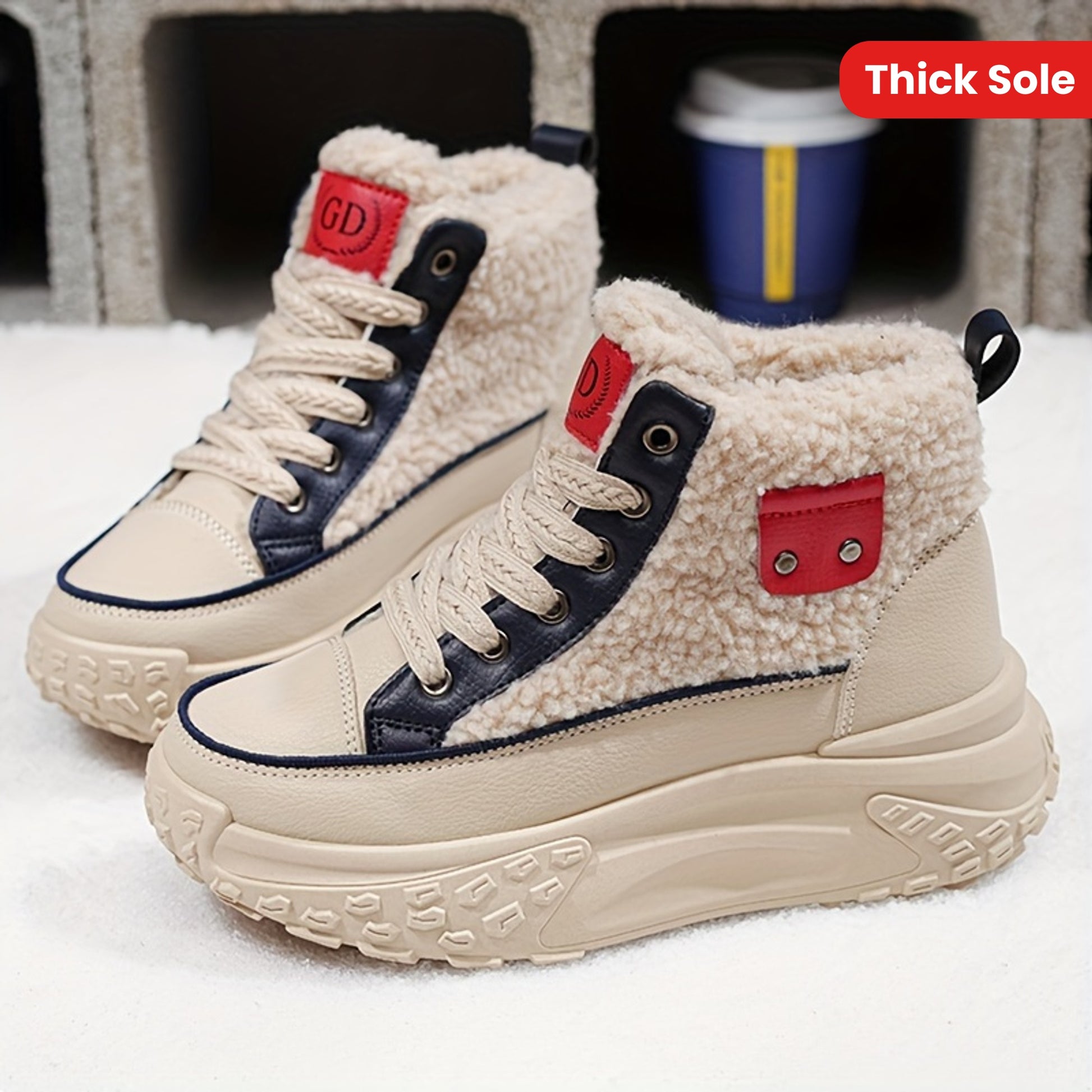 Ayollar uchun plüsh bilan qoplangan qishki qorli botinkalar, yuqori bo'yinli, sirpanishga qarshi rezina taglik